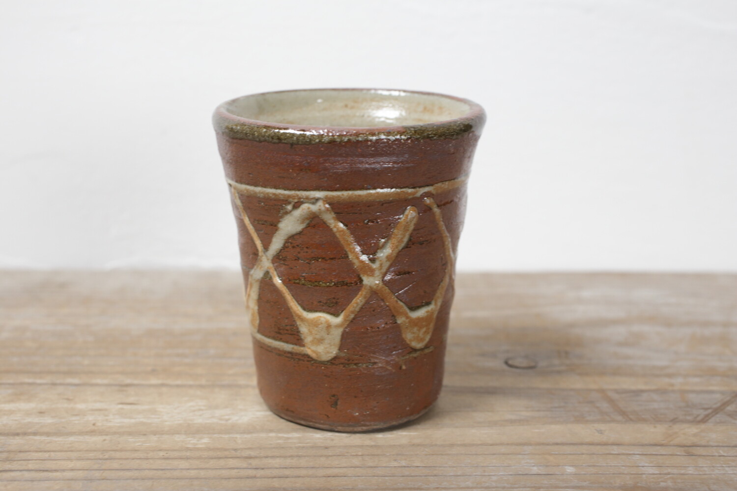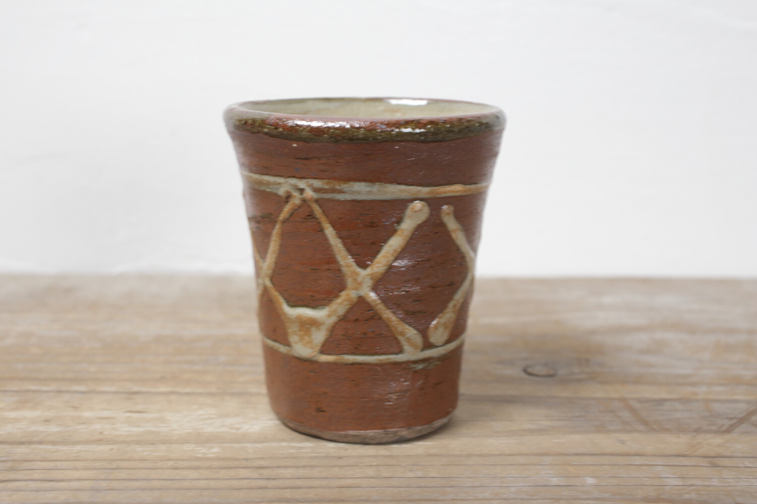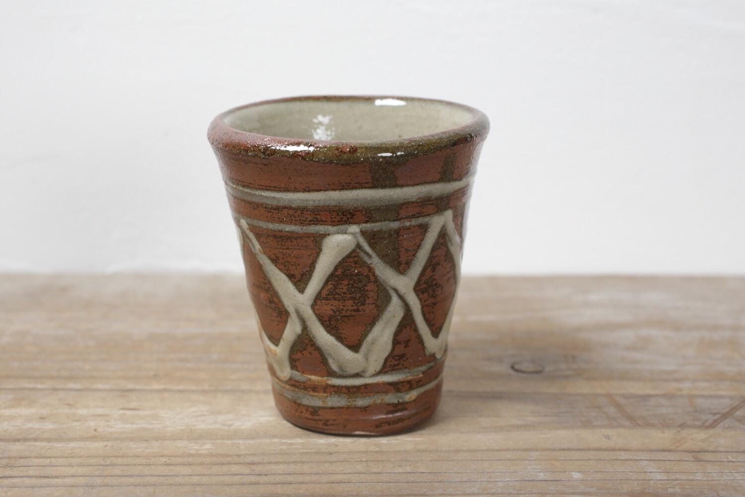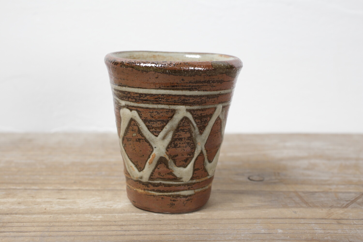 宮城正亨さんご本人によるフリーカップ。イッチンによる格子柄と造形のラフさが、宮城さんらしいゆったりのんびり感です。泡盛はもちろんお酒に焼酎、ビールやコーヒーなどお好きな飲み物でお楽しみ下さい。宮城さんの器は全体的にぽってりと厚みがありますが、口元は丸くあたりに嫌な印象を受けません。またこの厚みだからでる、宮城さんらしいゆったりかんだと思います。重いカップは苦手という方はどうぞお控え下さい。