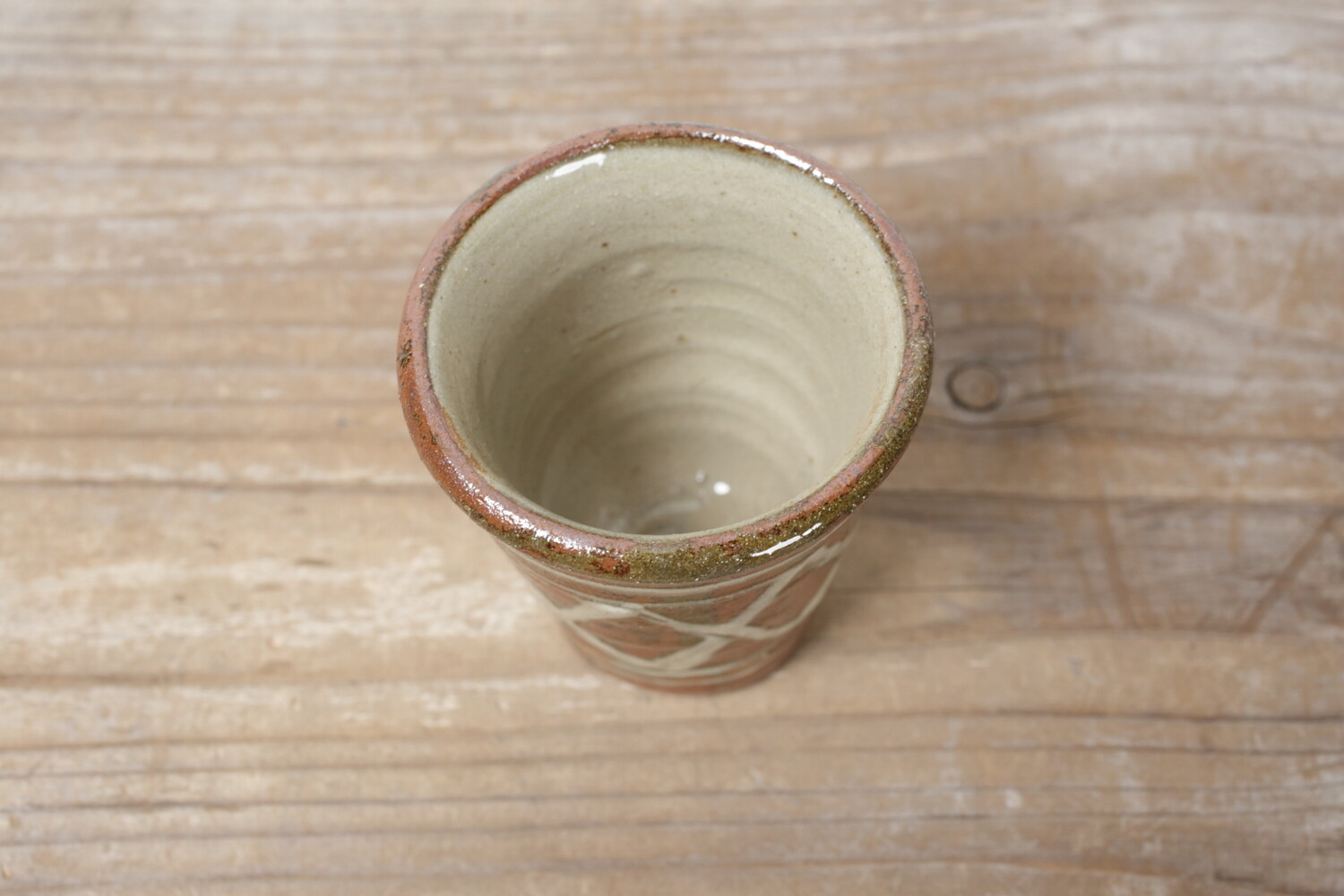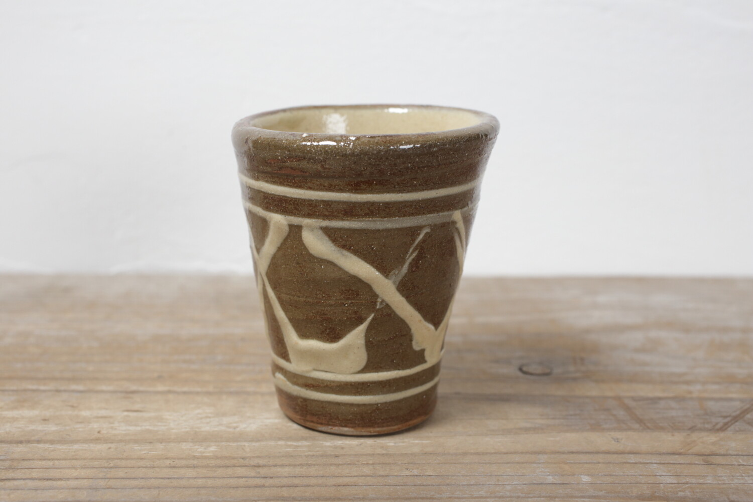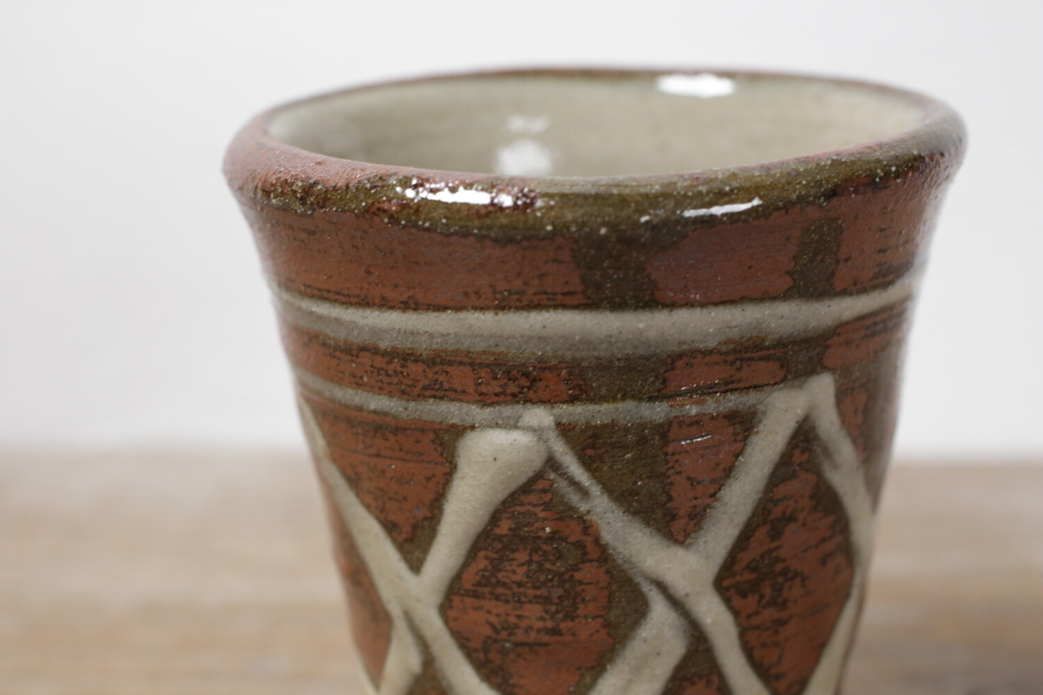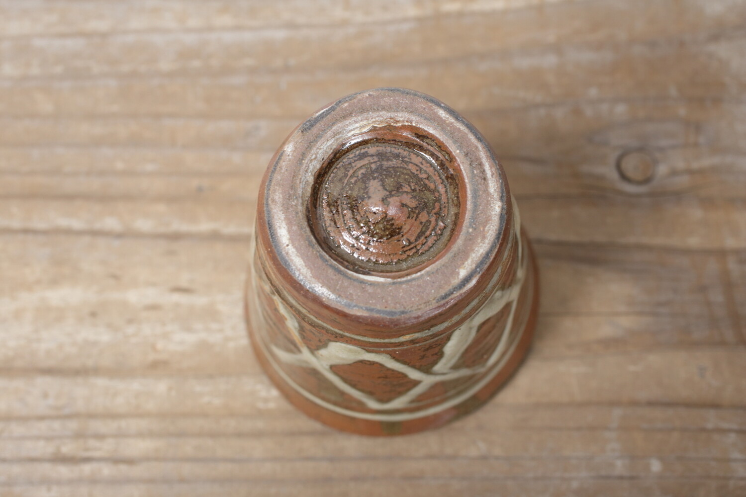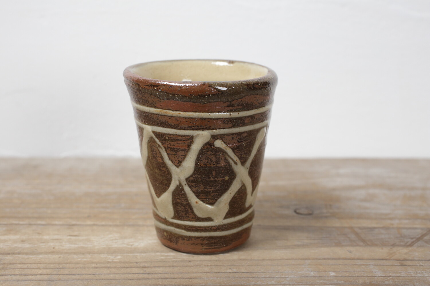 宮城正亨さんご本人によるフリーカップ。イッチンによる格子柄と造形のラフさが、宮城さんらしいゆったりのんびり感です。泡盛はもちろんお酒に焼酎、ビールやコーヒーなどお好きな飲み物でお楽しみ下さい。宮城さんの器は全体的にぽってりと厚みがありますが、口元は丸くあたりに嫌な印象を受けません。またこの厚みだからでる、宮城さんらしいゆったりかんだと思います。重いカップは苦手という方はどうぞお控え下さい。