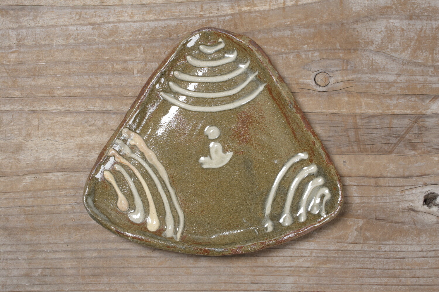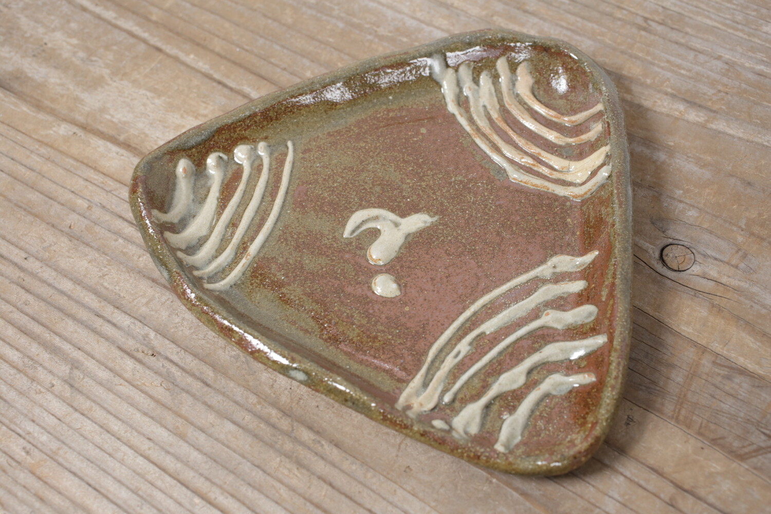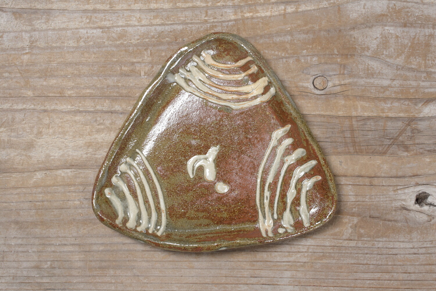 宮城正亨さんご本人による緩めのおにぎりのような形の三角皿。角にイッチン模様が描かれています。大きさとしては、複数のおかずのとりわけにいいプレートサイズで、6寸(18cm)サイズほどのお皿のサイズ感でお使い頂けます。お味噌汁を添えて、おにぎりにお漬物などを頂いても食卓がぐっと楽しくなりますね。