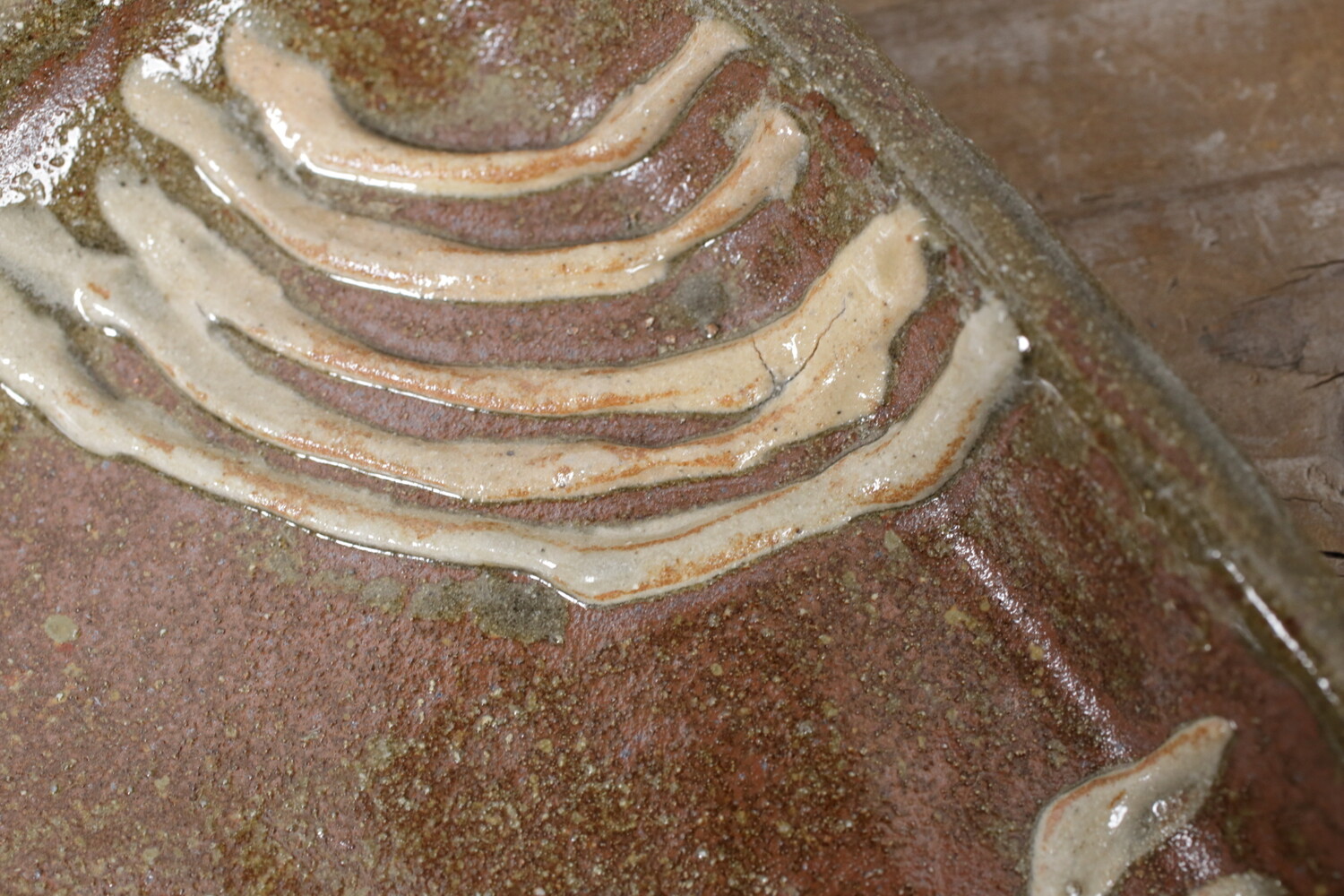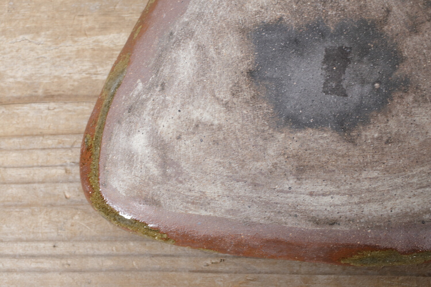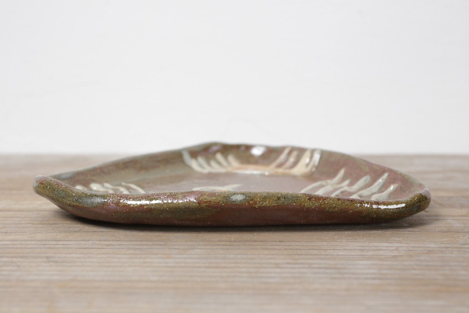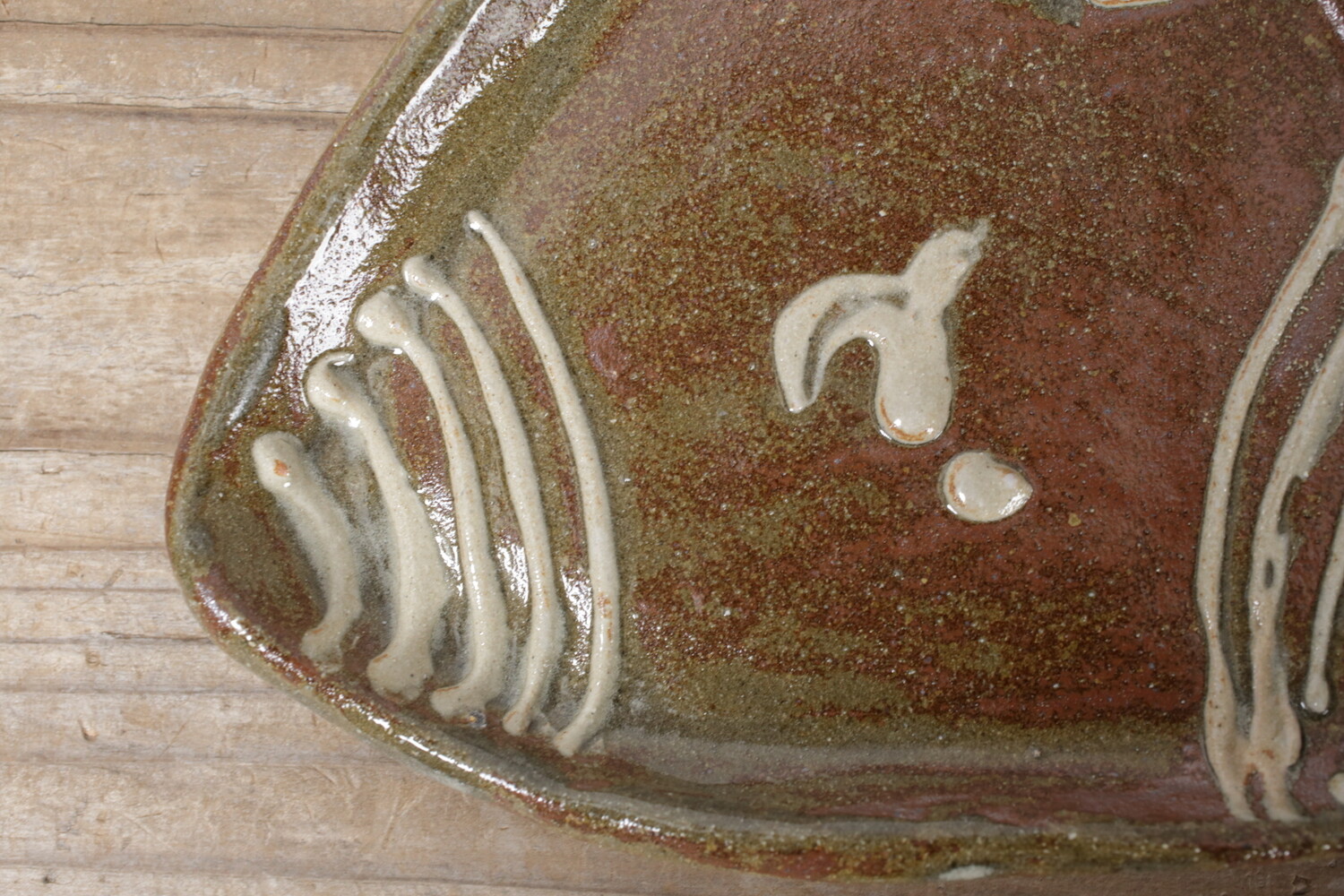 宮城正亨さんご本人による緩めのおにぎりのような形の三角皿。角にイッチン模様が描かれています。大きさとしては、複数のおかずのとりわけにいいプレートサイズで、6寸(18cm)サイズほどのお皿のサイズ感でお使い頂けます。お味噌汁を添えて、おにぎりにお漬物などを頂いても食卓がぐっと楽しくなりますね。