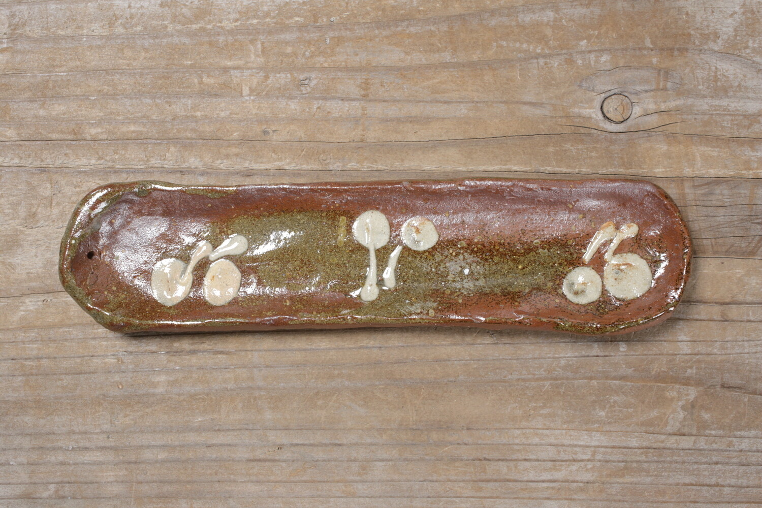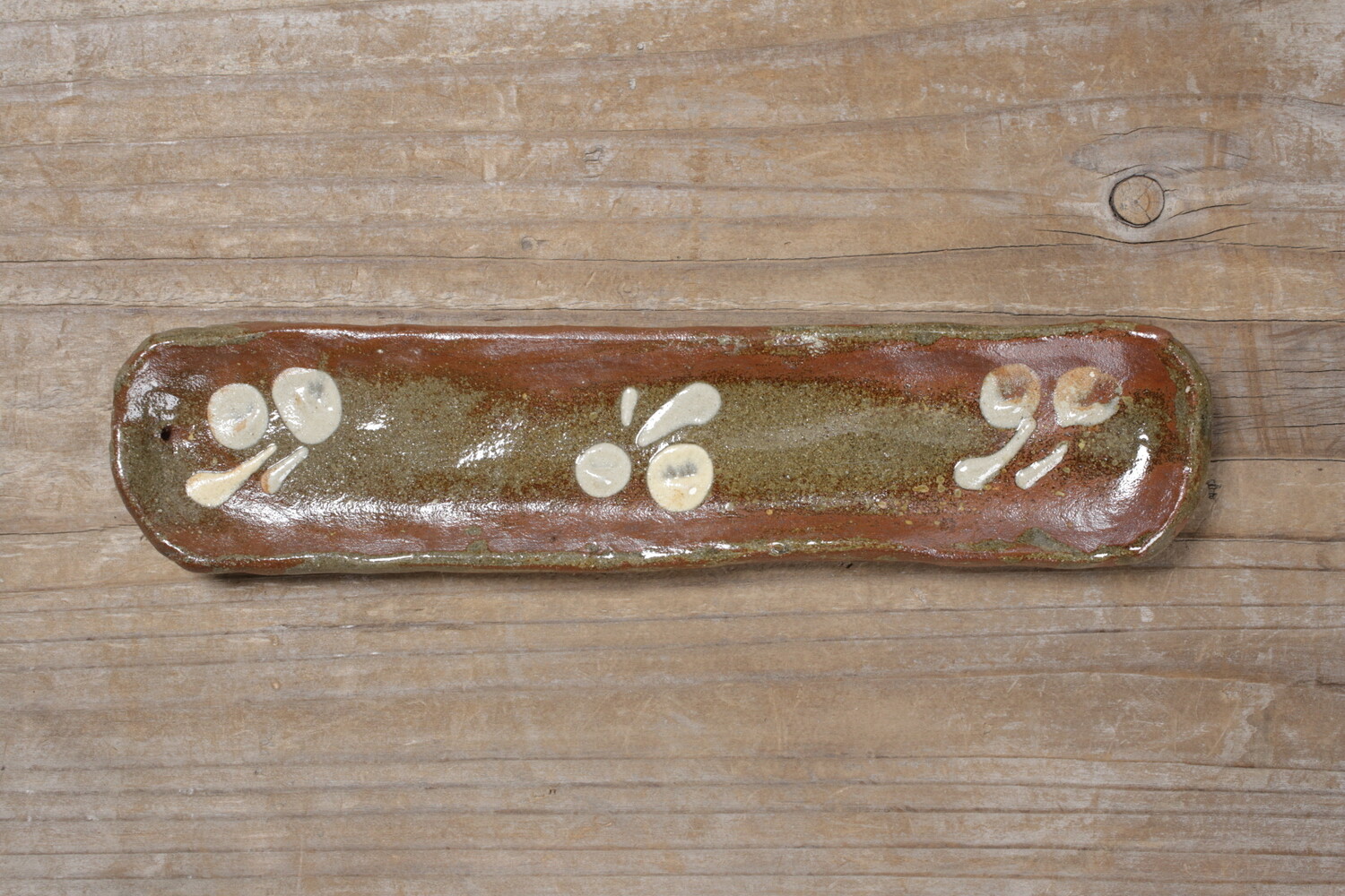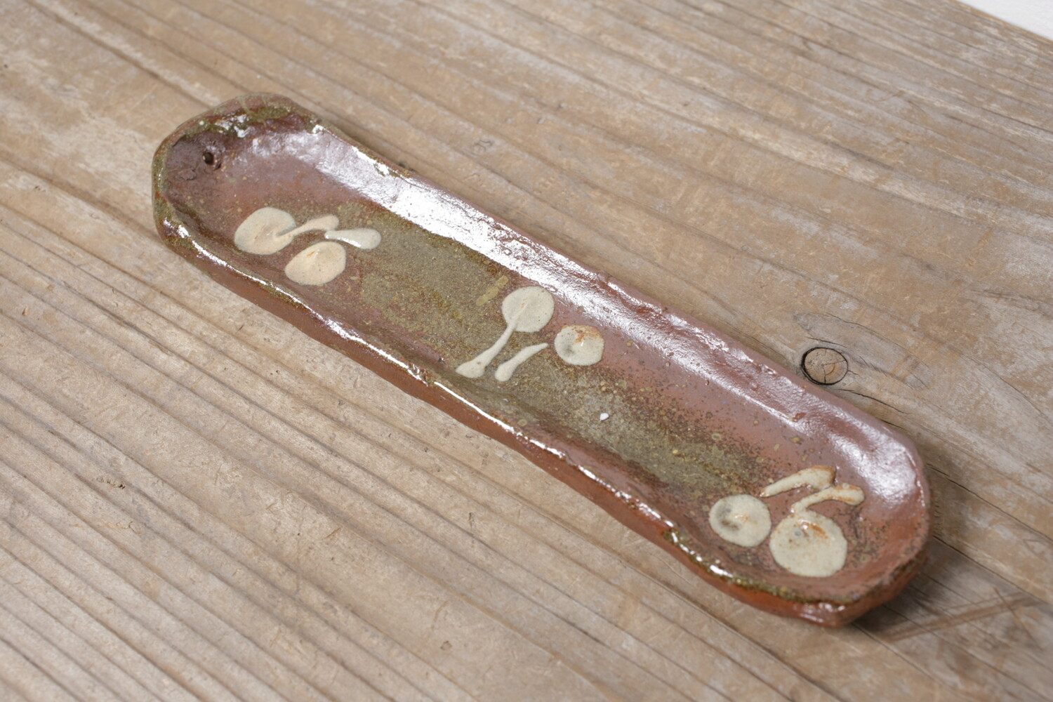 宮城正亨さんご本人による長さ23.5cmほどのスティック用お香立て。チェリーでしょうか?可愛らしい模様がイッチンで描かれています。陶器のお香立ては薄いとどうしても不安になるのですが、宮城さんのお香立てはある程度の厚みと縁の丸み感があるので室内外問わず不安なくお使い頂けます。