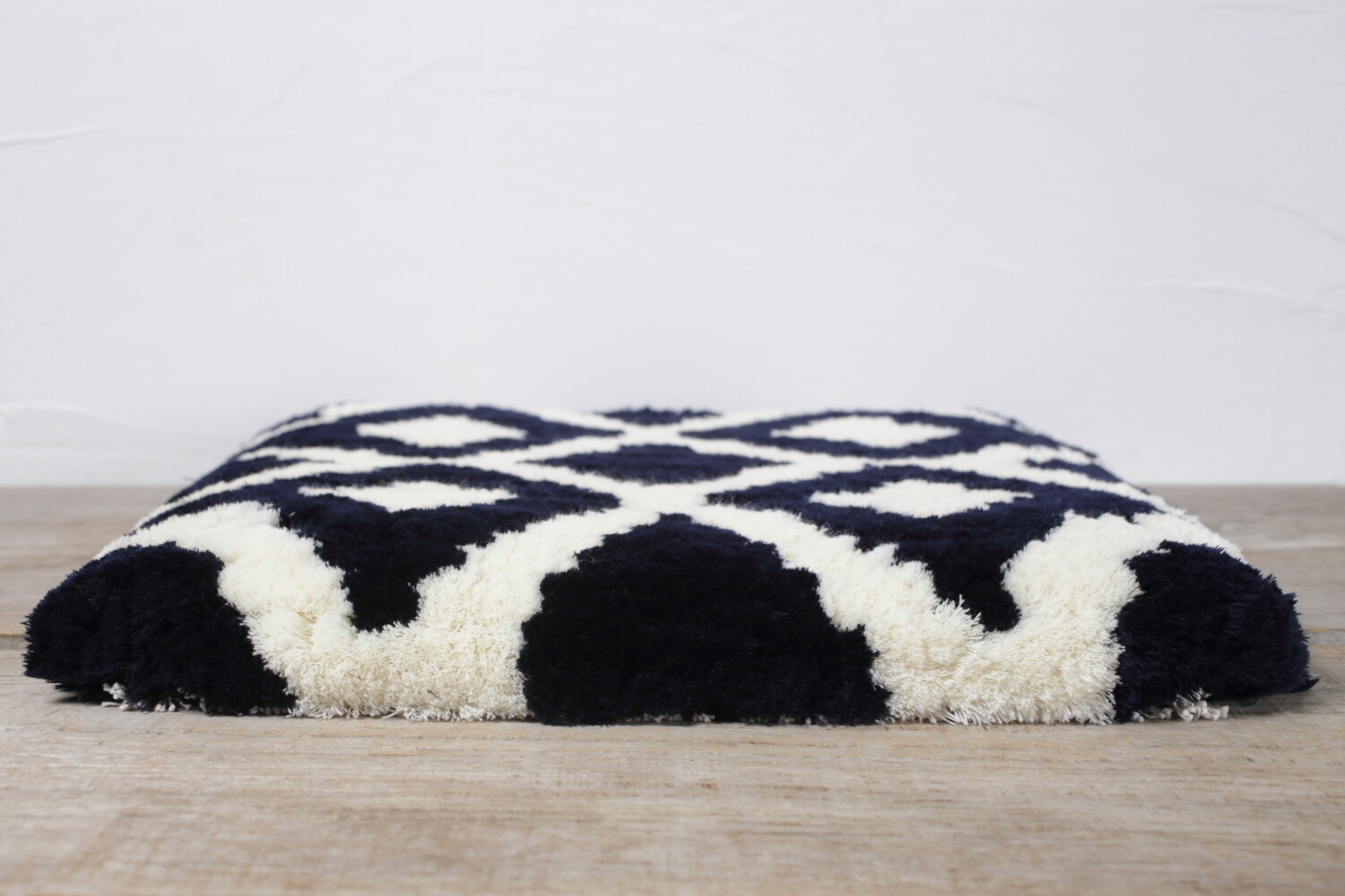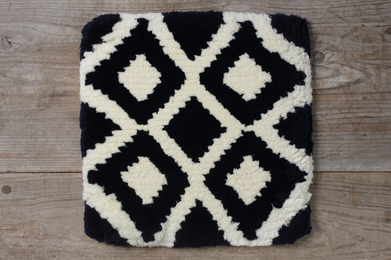 佐藤さんの糸を無駄にしないという考えに基づき、他のノッティングの作家さんと比較すると糸を切り込み過ぎず毛足が長いのが特徴です。そのためどうしても毛足が短いノッティングより毛足が倒れやすいのですが、圧倒的な座り心地のよさは一度座って頂くと皆さん驚かれるほどです。糸はウール100%ですので、しっとりとした座り心地です。手で糸の向きと反対方向にならして頂くと柄に対して毛並みが整い綺麗になります。コロコロなどをお使い頂いてもいいでしょう。通常お洗濯は必要ありませんが、飲み物をこぼしてしまったなど汚れが気になるという方は、薄めた中性洗剤で手揉み洗いをした後、しっかりと乾かして下さい。乾かした後はウールのため毛玉が出ますので、コロコロ等で取り除いてください。
