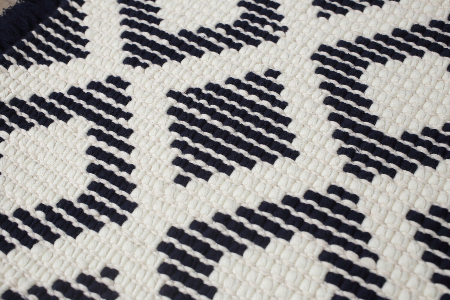 倉敷本染手織研究所は、初代倉敷民藝館館長の外村吉之介氏により倉敷民藝館付属工藝研究所として設立されました。ノッティングだけでなく、テーブルセンターやコースター、ネクタイや袋物など、現在でも丁寧な仕事がこの手織研究所そしてその卒業生によって作られ、現在でも倉敷の美観地区にその研究所があり活動を続けられています。佐藤さん曰く倉敷本染手織研究所創設者の外村氏の教えの一つに、無駄にしないという教えがあったそうです。そのため、佐藤隘子さんを含め研究所初期の生徒さんはノッティングの毛足をあまり短く刈り込みすぎない、比較的毛足が長い作りになっています。現在目にするノッティングに比べ、佐藤隘子工房のノッティングの毛足が長いのはその理由によります。倉敷を訪れると、飲食店で日常のものとして数十年に渡り使われているノッティングを目にします。どうぞ生活の一部として長い間ご愛用頂けると幸いです。