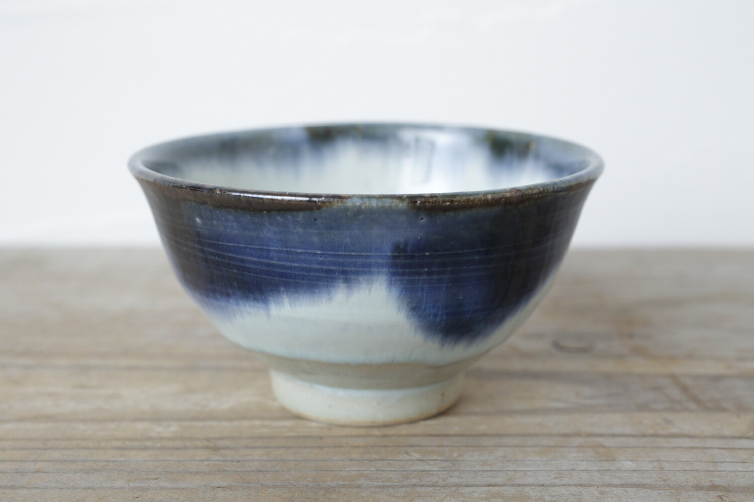 直径12cmほどの大きさは、一般的に中サイズと言われるサイズです。籾灰と呉須釉を掛け合わせたことで、とろりとした中にオーロラのような軽やかな釉薬の流れを楽しむことができます。粗めの陶土ときめ細やかな磁器の土を調合して用いていることで、呉須釉はもちろん白も色鮮やかに発色しています。磁器の器とも組み合わせしやすいでしょう。