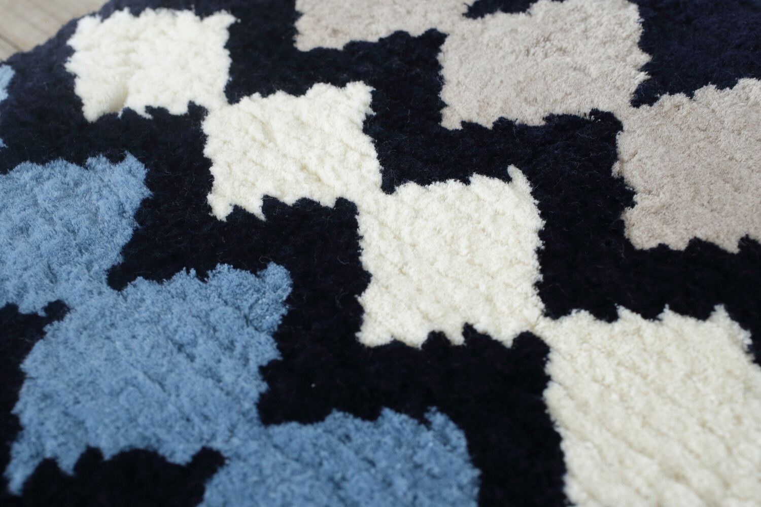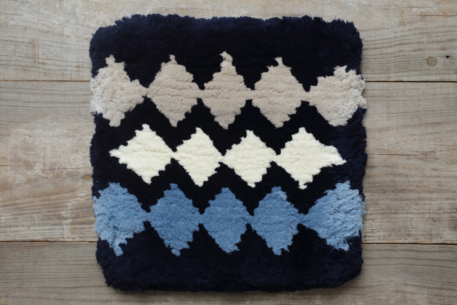 佐藤さんの糸を無駄にしないという考えに基づき、他のノッティングの作家さんと比較すると糸を切り込み過ぎず毛足が長いのが特徴です。そのためどうしても毛足が短いノッティングより毛足が倒れやすいのですが、圧倒的な座り心地のよさは一度座って頂くと皆さん驚かれるほどです。糸はウール100%ですので、しっとりとした座り心地です。手で糸の向きと反対方向にならして頂くと柄に対して毛並みが整い綺麗になります。コロコロなどをお使い頂いてもいいでしょう。通常お洗濯は必要ありませんが、飲み物をこぼしてしまったなど汚れが気になるという方は、薄めた中性洗剤で手揉み洗いをした後、しっかりと乾かして下さい。乾かした後はウールのため毛玉が出ますので、コロコロ等で取り除いてください。