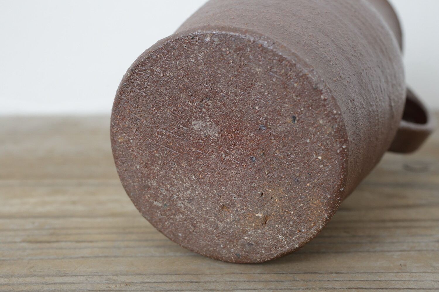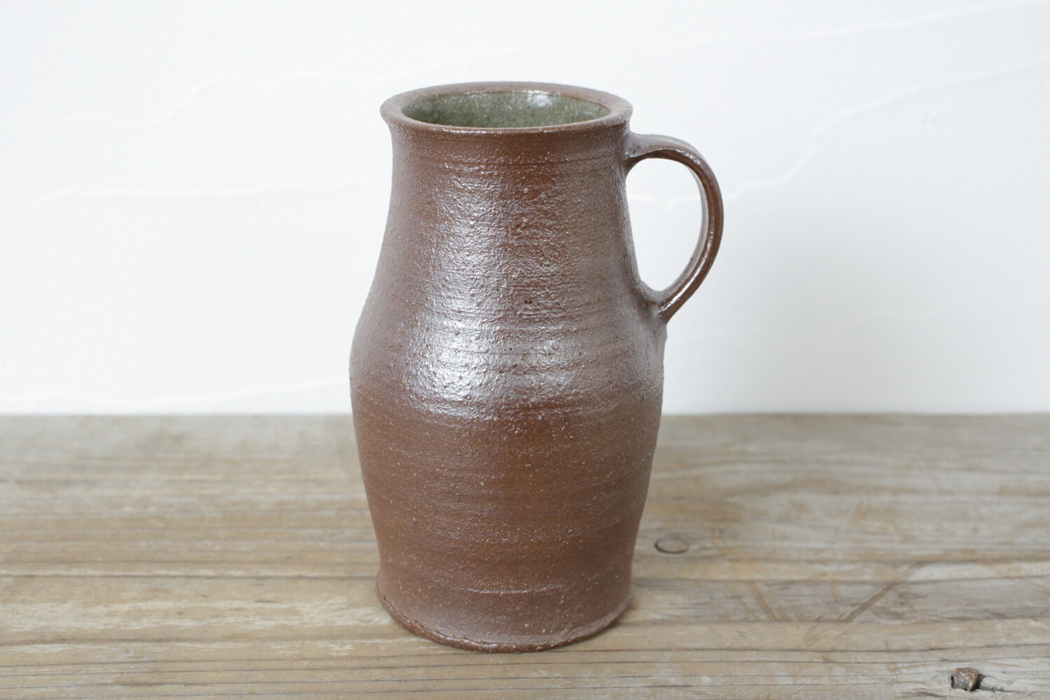 外側は焼き〆、内側は灰釉が掛けられた手つき瓶。バーナード・リーチのピッチャーの形を彷彿とさせるような、焼き〆にも関わらず柔らかさと主張の強すぎない姿がいいですね。内側から除くカーキ色のような灰釉がとてもいいアクセントになっています。大きさとしては高さが16.5cmほどですので、ピッチャーとして中に液体を入れても毎日の食卓で使いやすいサイズ感です。また一般的に、花器の高さの倍ほどの植物を生けるとバランスがいいと言われているようですので、枝物や切り花を生けて花器としてお使い頂いてもいいでしょう。和室、現代のモダンな洋室どちらにもフィットする手付き瓶です。