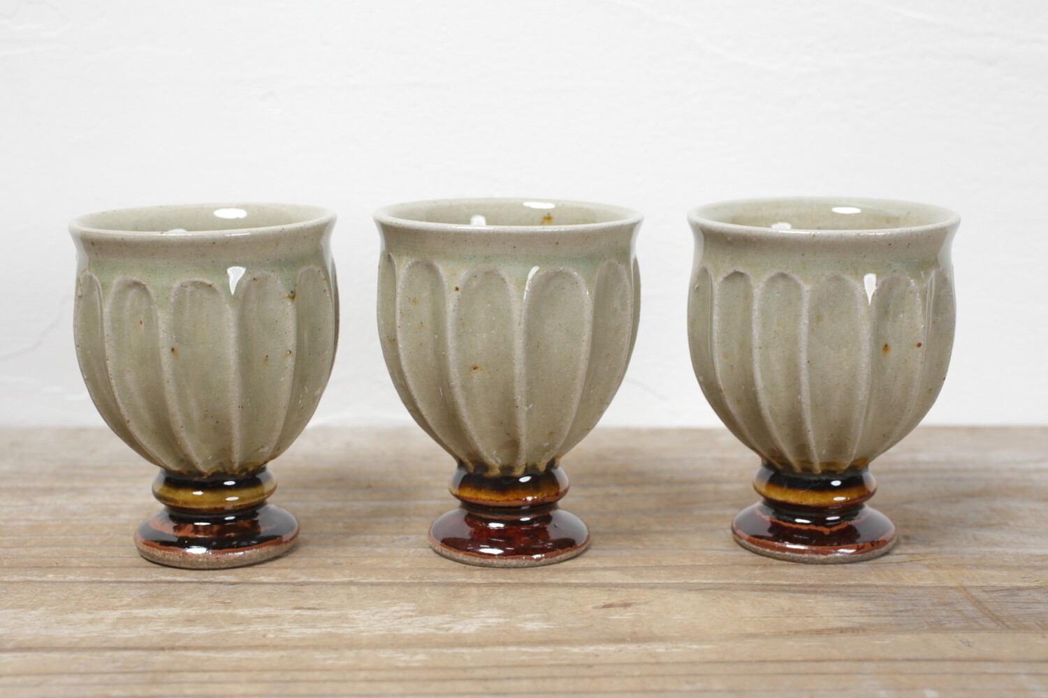 重ねて収納できる足付きグラスを真弓さんにお願いし作って頂いてから、年月が経ちました。今では3サイズ展開になり、手に持った具合やお好みの大きさ等でお選び頂けます。コーヒーやワインにいい大きさでしょう。