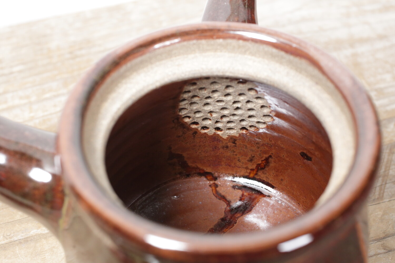 形は轆轤に非常に定評が高く、持ち手や注ぎ口など嫌みの無いバランスの作りや蓋のつまみの持ちやすい大きさ加減など。また注いだ際の水切れの良さは真弓さんならではです。内側は洗い易いように釉薬がかけられていますので網が無くても簡単にお手入れ頂けます。お急須の下にも釉薬がかけられていますので、水気でカビてしまうといった心配もありません。