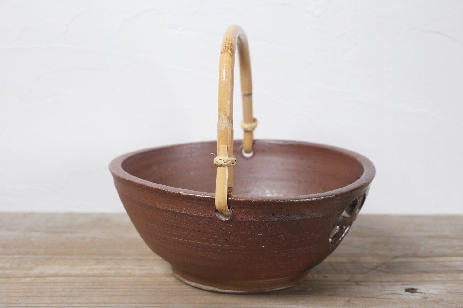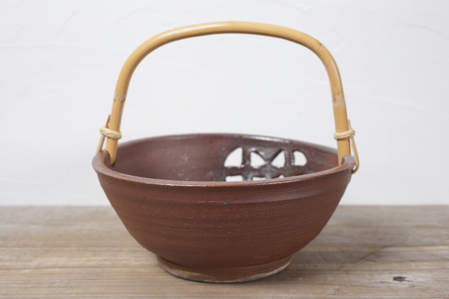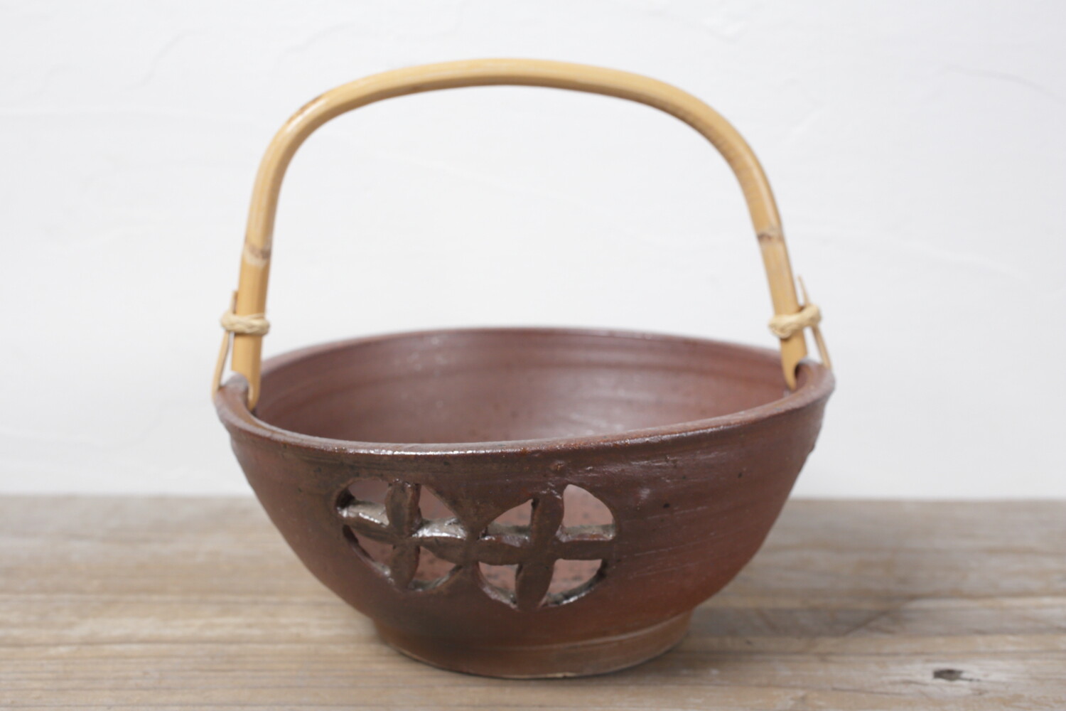 竹の持ち手がついた宮城正亨さんご本人による菓子鉢。工房にお邪魔すると、サーターアンダギーやちんすこう、お菓子などが入って、お茶と共に頂戴します。お菓子を入れてお庭やベランダ、外へピクニックなどにもいいでしょう。栗やシークワーサーなどを入れてもいいですね。果物や野菜入れとしてもいいでしょう。