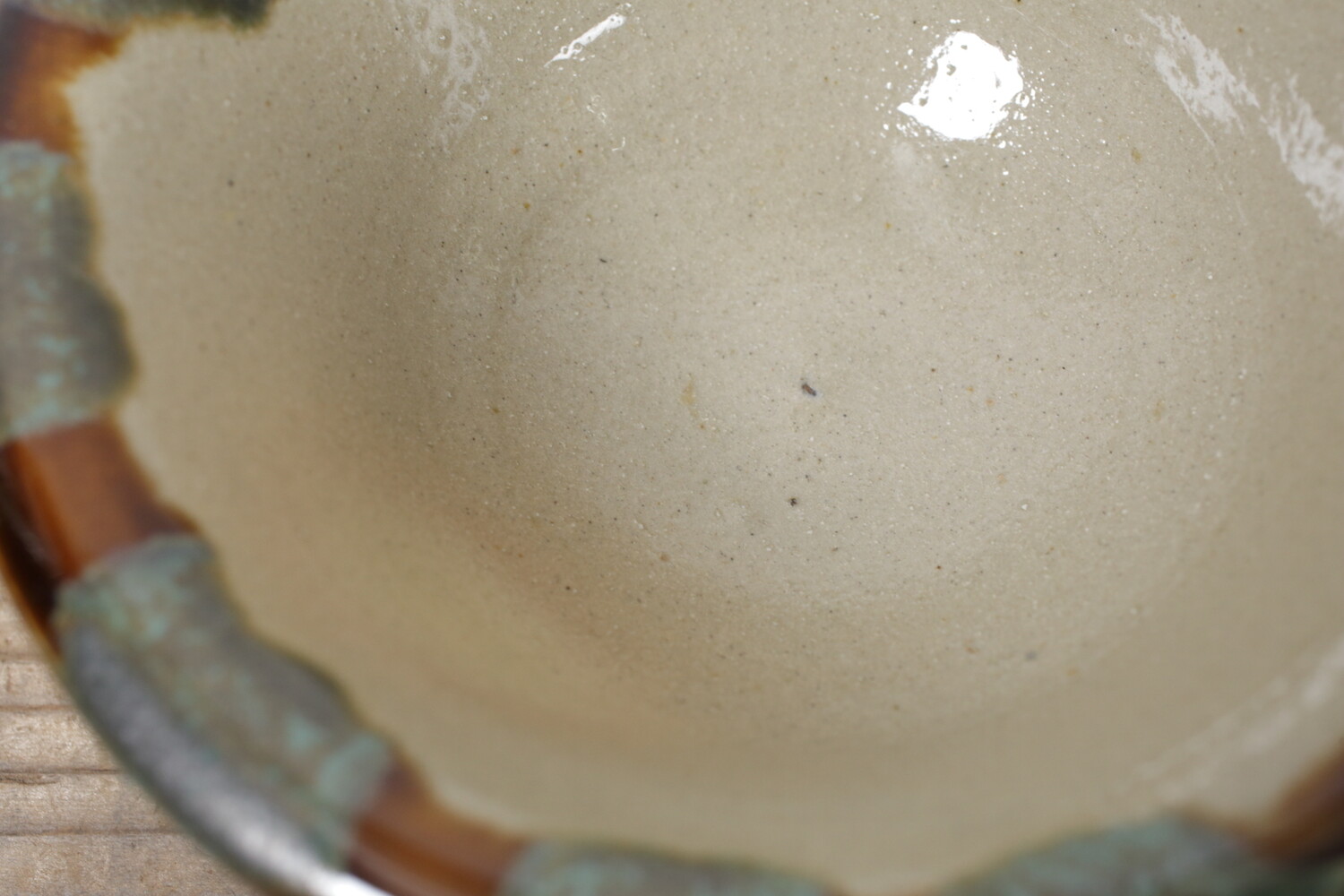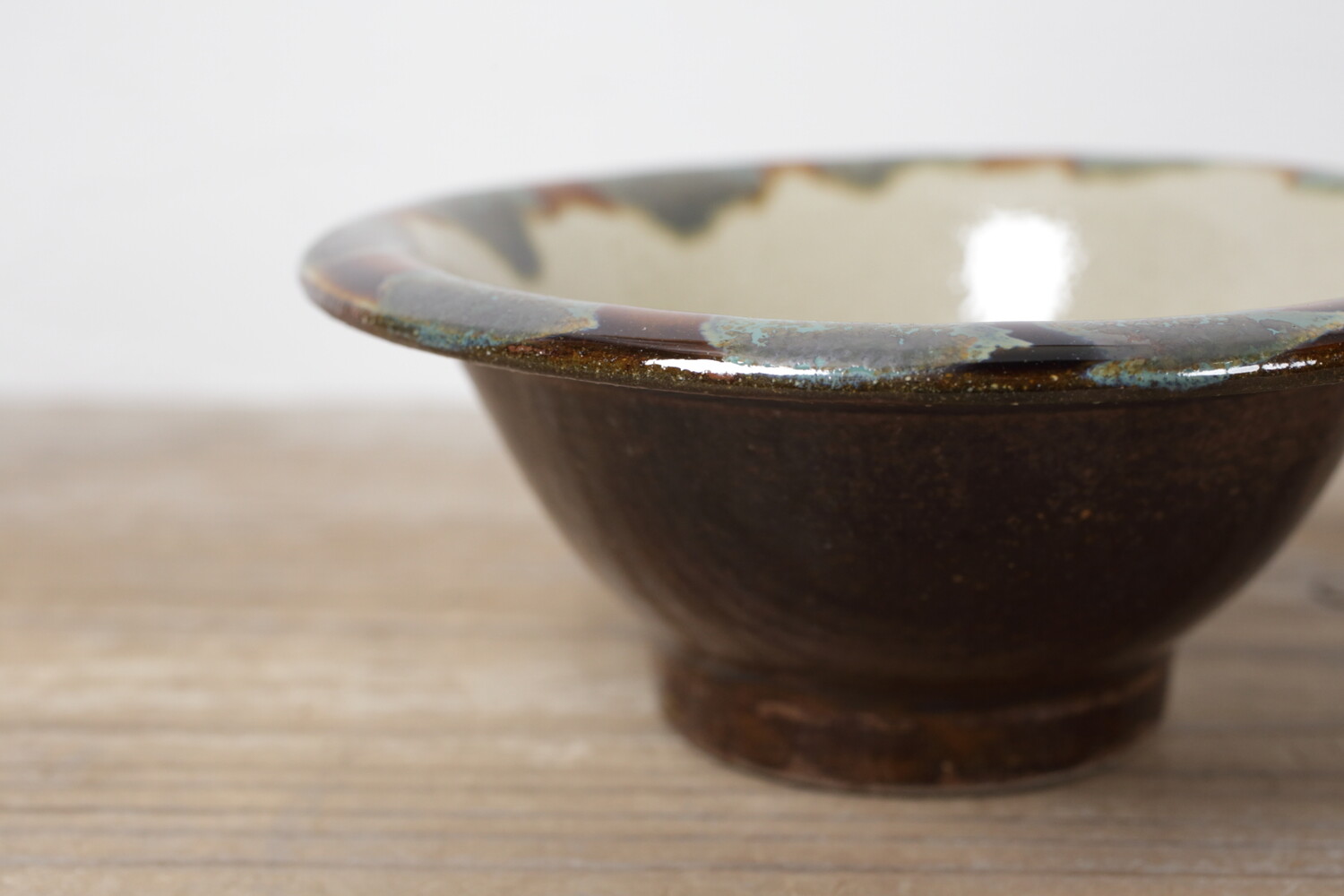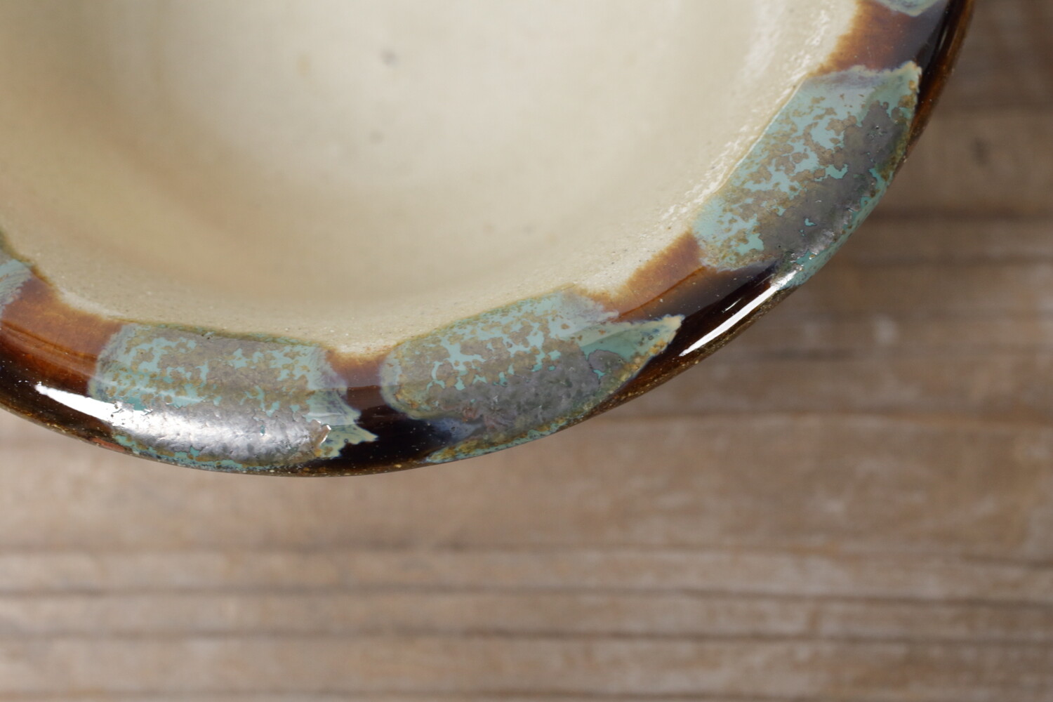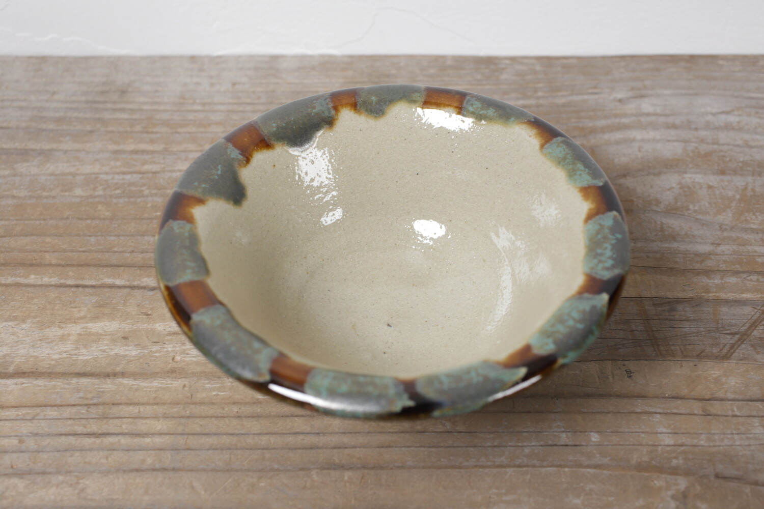 沖縄の言葉でワンブーと呼ばれる縁がついた沖縄の伝統的な形の器です。縁を含め直径15.3cmほどの大きさの小鉢は、生野菜の横にディップを添えて食卓に出してもテーブルが楽しくなることでしょう。薬味や大根おろしなどにもいいですね。