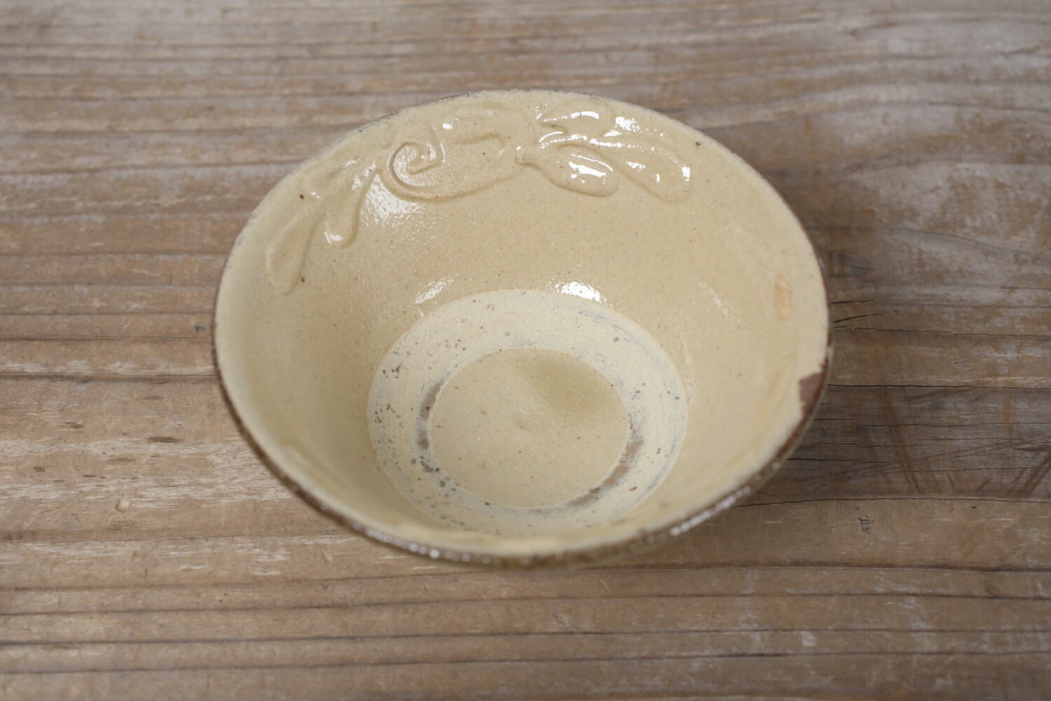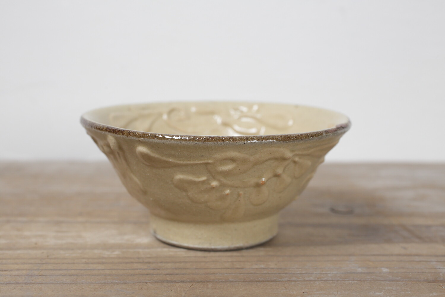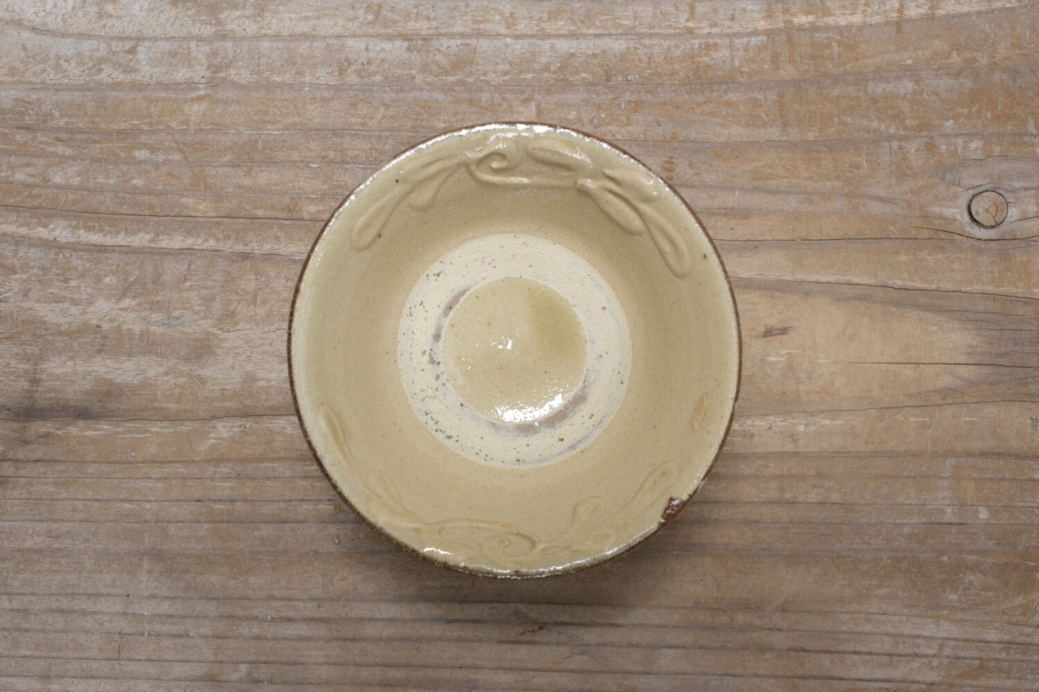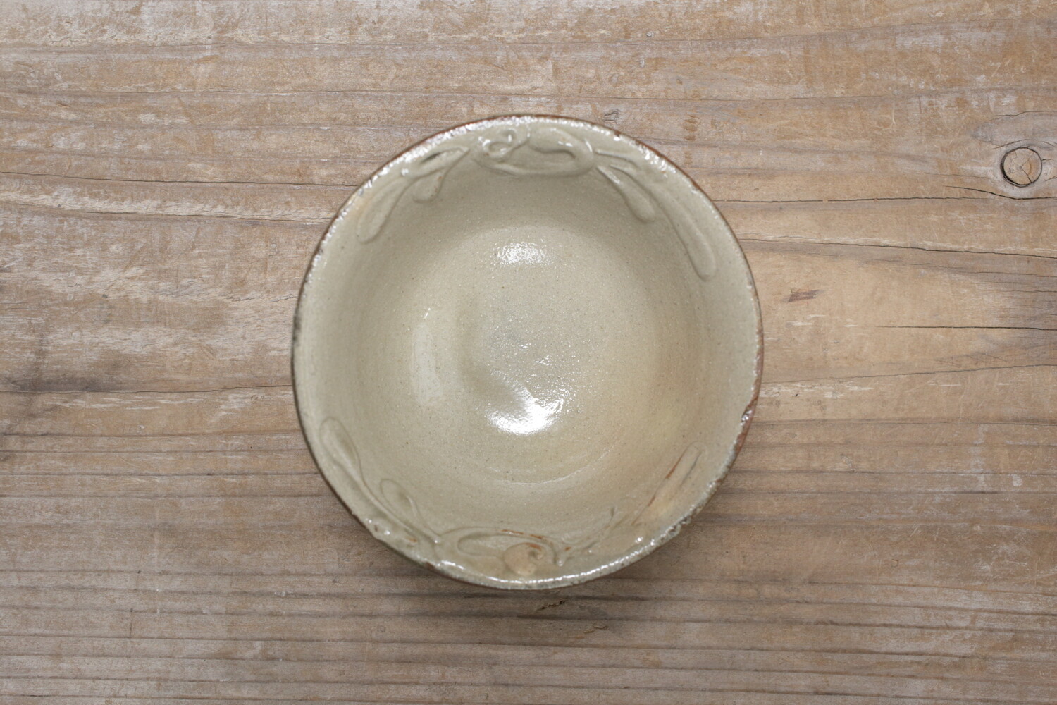 4寸碗はご飯茶碗の中サイズの大きさです。菊花唐草模様がイッチンで描かれ、お碗と同色なので凹凸での表現で全体の印象が強すぎることがありません。男女問わずお使い頂けます。長年お使い頂くとお碗全体の光沢が落ち着き、また中央の蛇目(丸く釉薬が取り除かれた箇所)に色が入り薄いピンク茶色になり全体の印象が愛らしくなることでしょう。