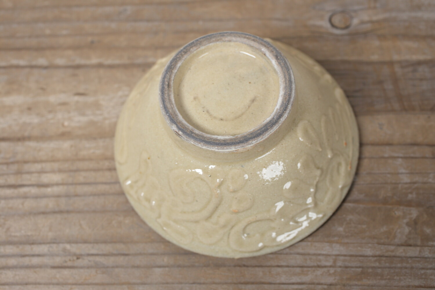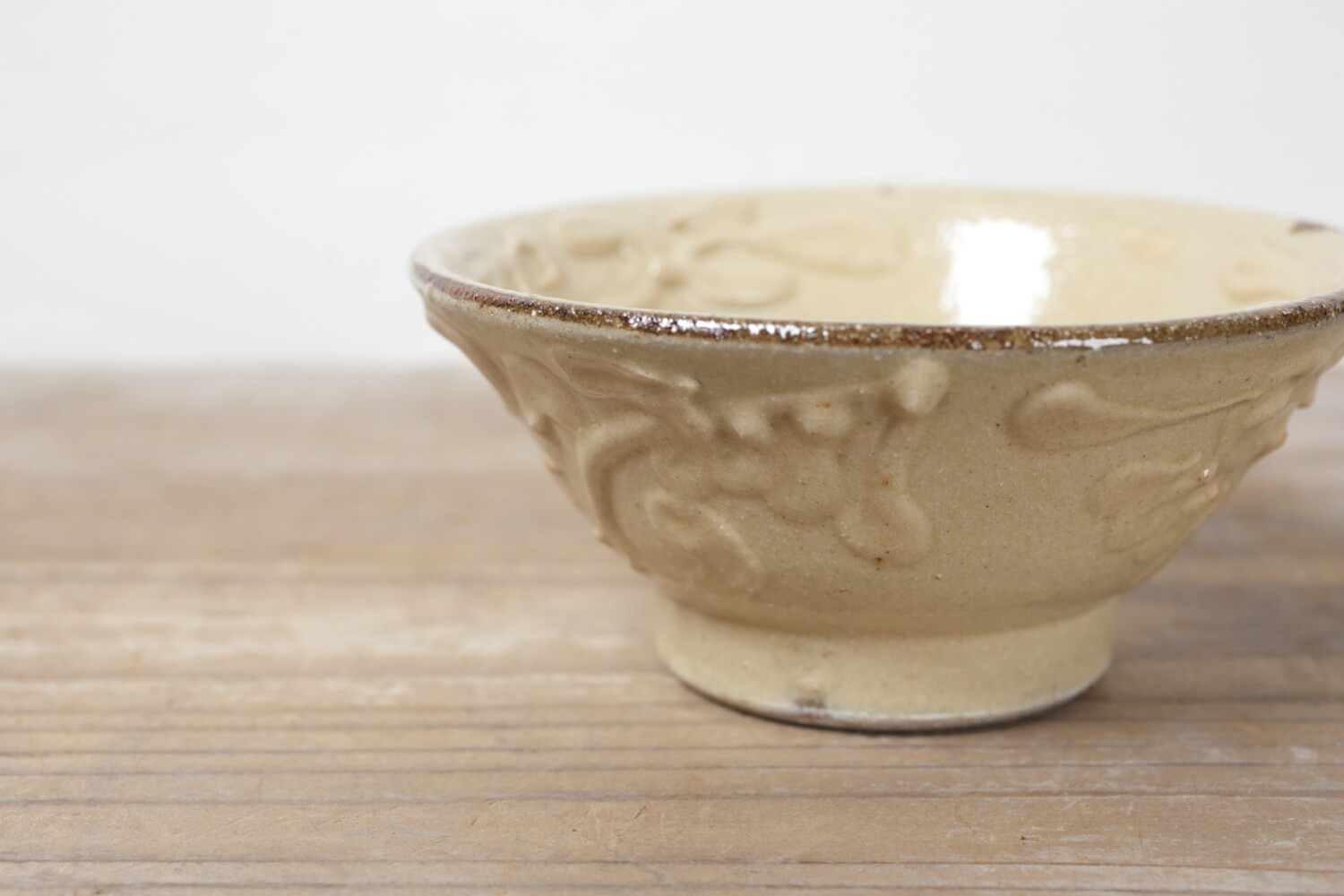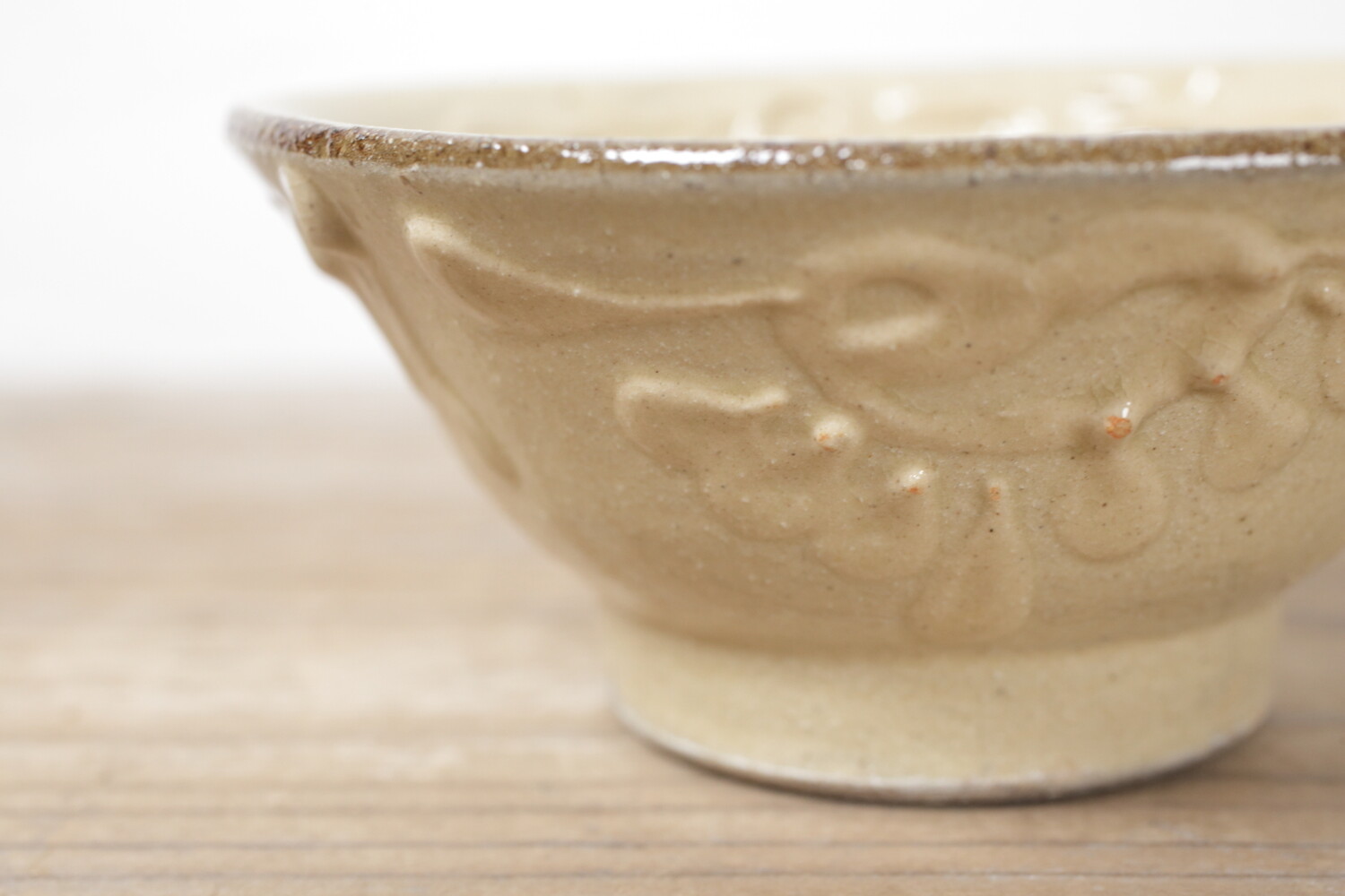 4寸碗はご飯茶碗の中サイズの大きさです。菊花唐草模様がイッチンで描かれ、お碗と同色なので凹凸での表現で全体の印象が強すぎることがありません。男女問わずお使い頂けます。長年お使い頂くとお碗全体の光沢が落ち着き、また中央の蛇目(丸く釉薬が取り除かれた箇所)に色が入り薄いピンク茶色になり全体の印象が愛らしくなることでしょう。