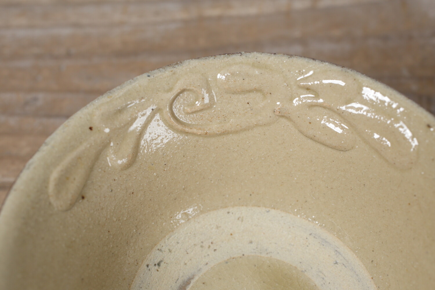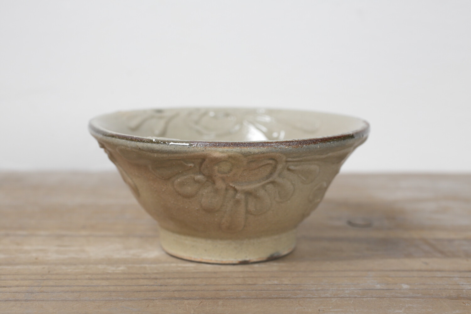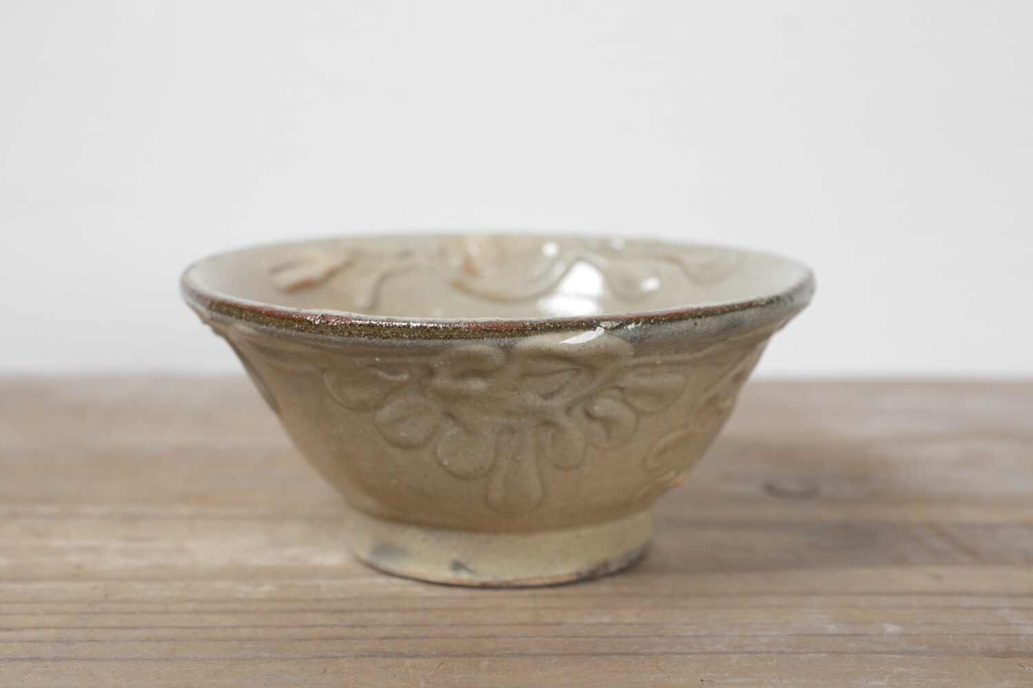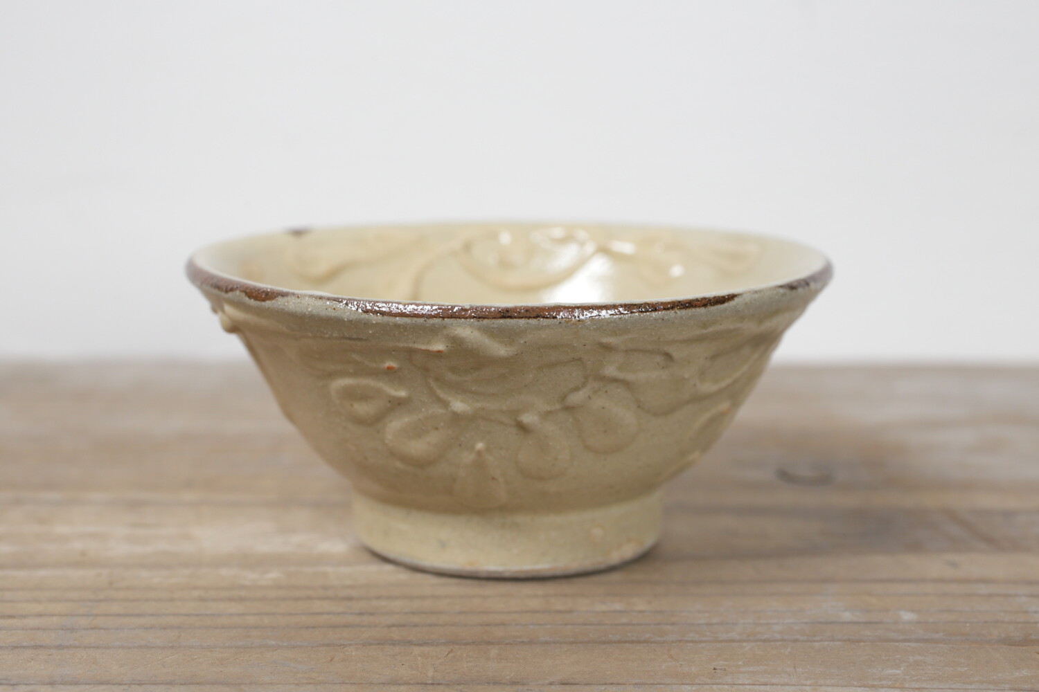 4寸碗はご飯茶碗の中サイズの大きさです。菊花唐草模様がイッチンで描かれ、お碗と同色なので凹凸での表現で全体の印象が強すぎることがありません。男女問わずお使い頂けます。長年お使い頂くとお碗全体の光沢が落ち着き、また中央の蛇目(丸く釉薬が取り除かれた箇所)に色が入り薄いピンク茶色になり全体の印象が愛らしくなることでしょう。