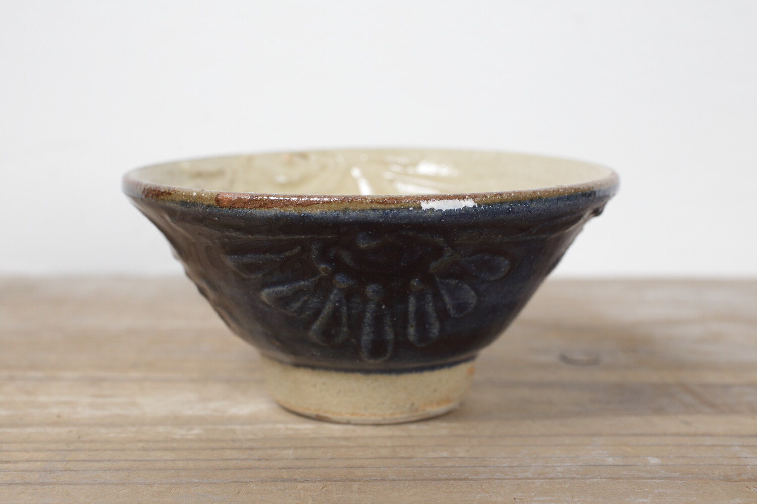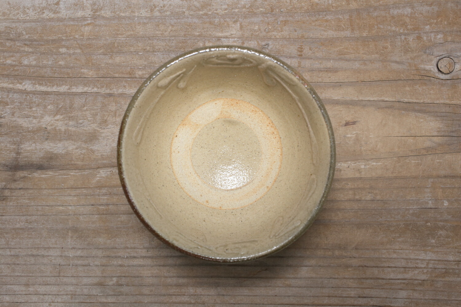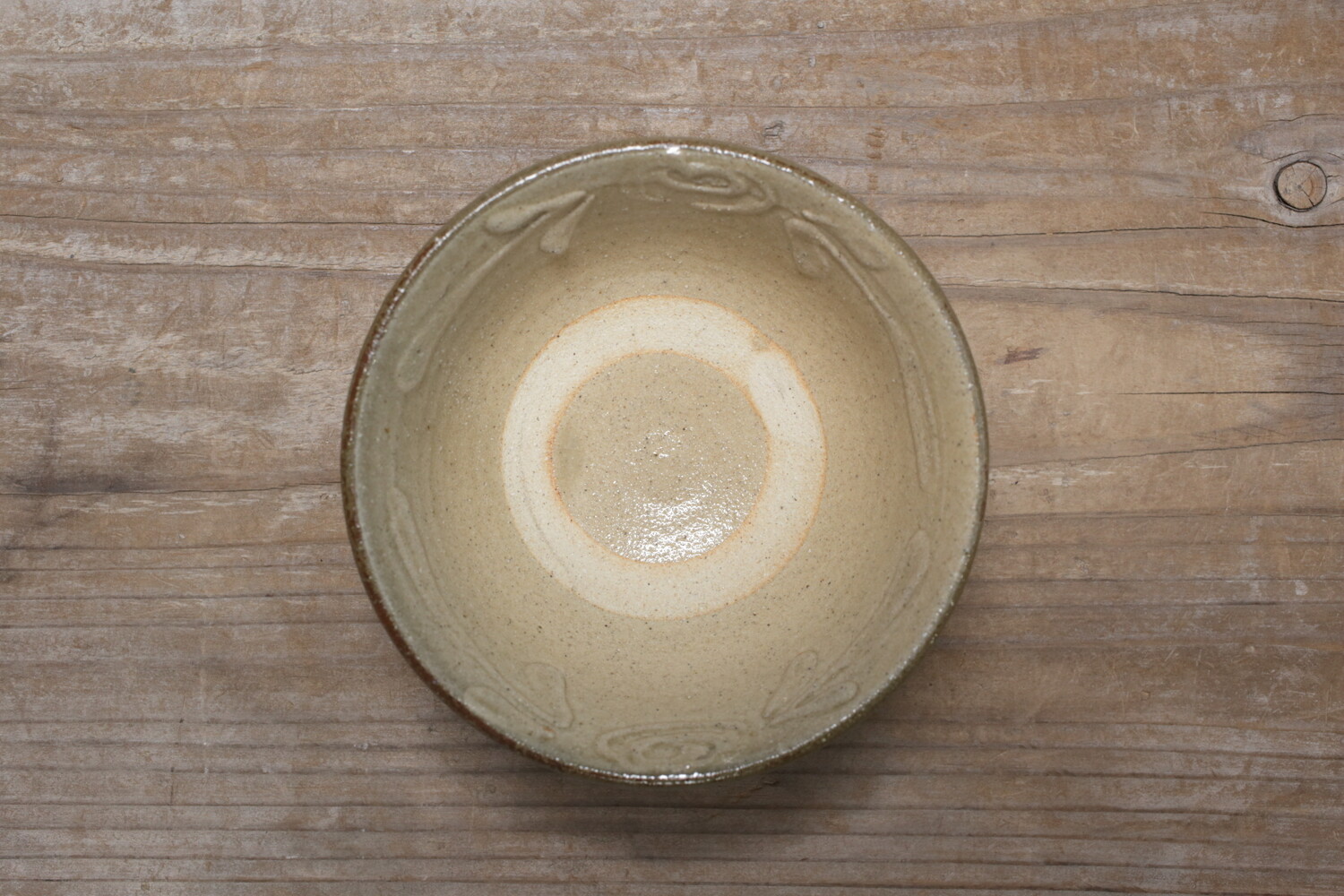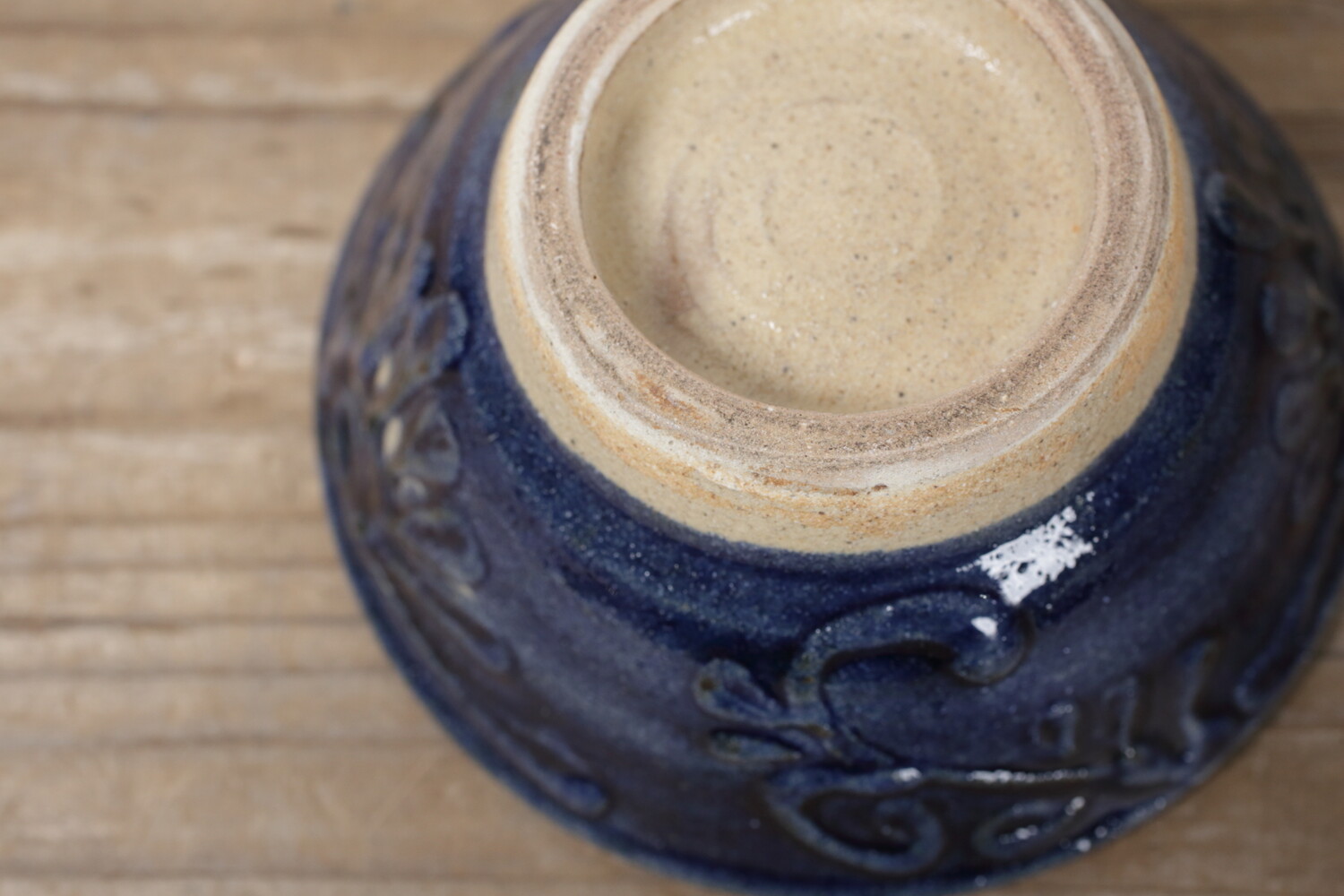 4寸碗はご飯茶碗の中サイズの大きさです。男女問わずお使い頂けます。沖縄の伝統的紋様 唐草模様がイッチンで描かれその上に釉薬が掛けられているため、イッチンの凹凸が表情のアクセントとなっています。