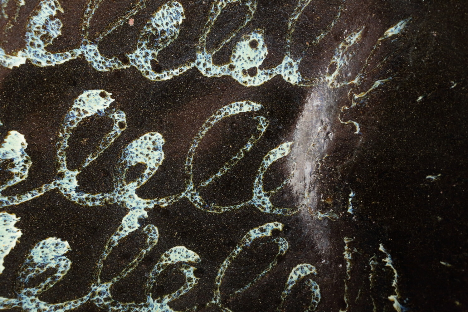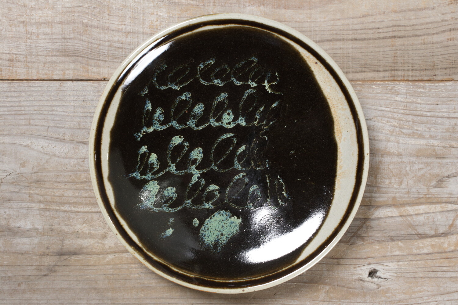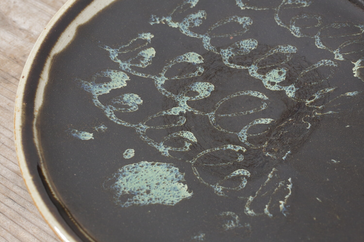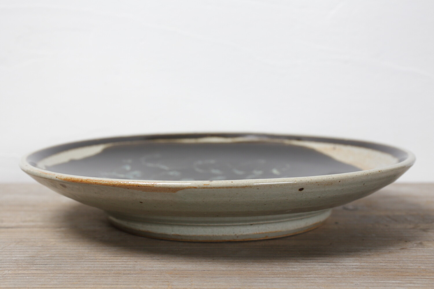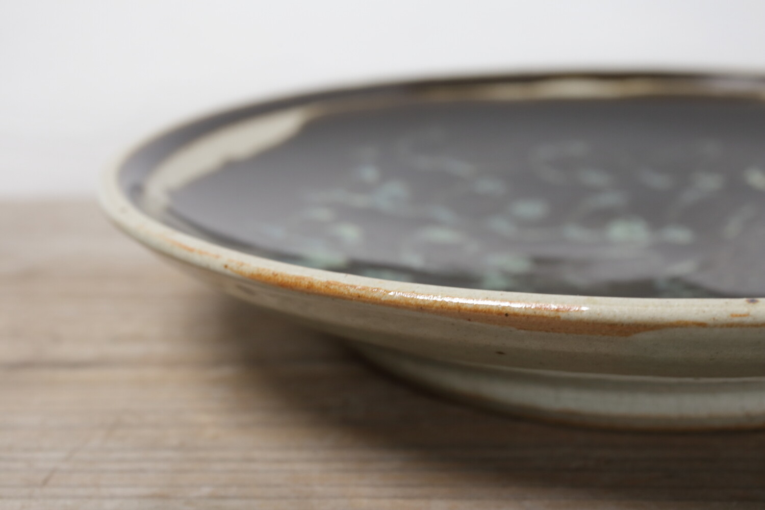 黒釉、青磁釉、糠釉のデザイン的バランスが現代アートのような直径30.5cmほどの大誠窯の大皿。これくらいの大きさですと、ご家族でしたらお鍋の具材を並べたり、ちらし寿司やばら寿司などにもいいでしょう。