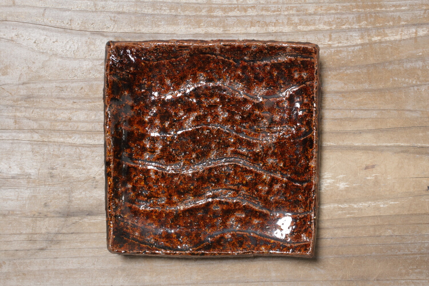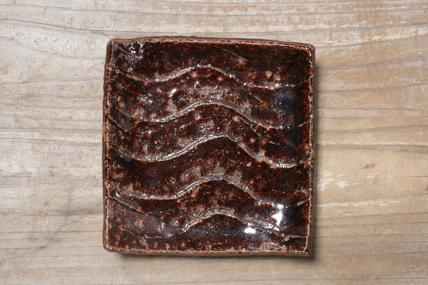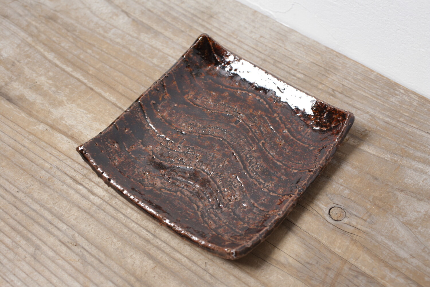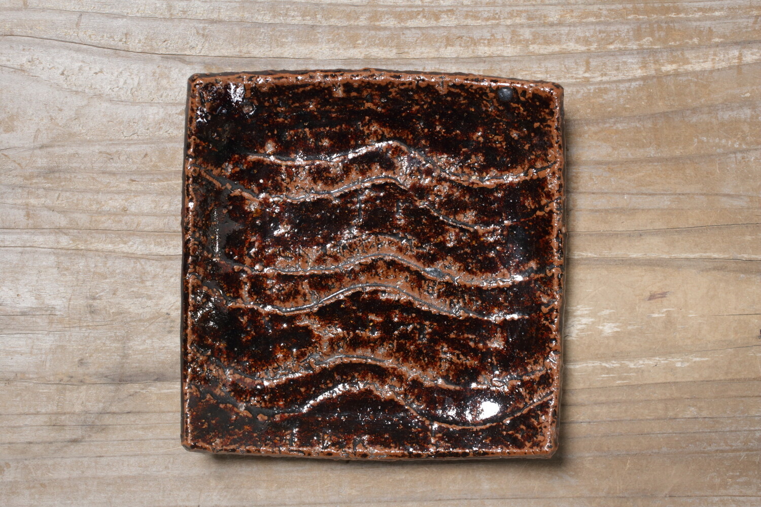 手おこしで作られた山々のような凹凸の装飾が施された15cmほどの正方皿。だし巻き卵や、お一人分のお刺身に。また和菓子、洋菓子問わずデザート皿としても美しいでしょう。