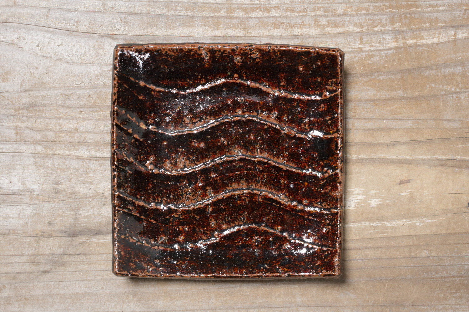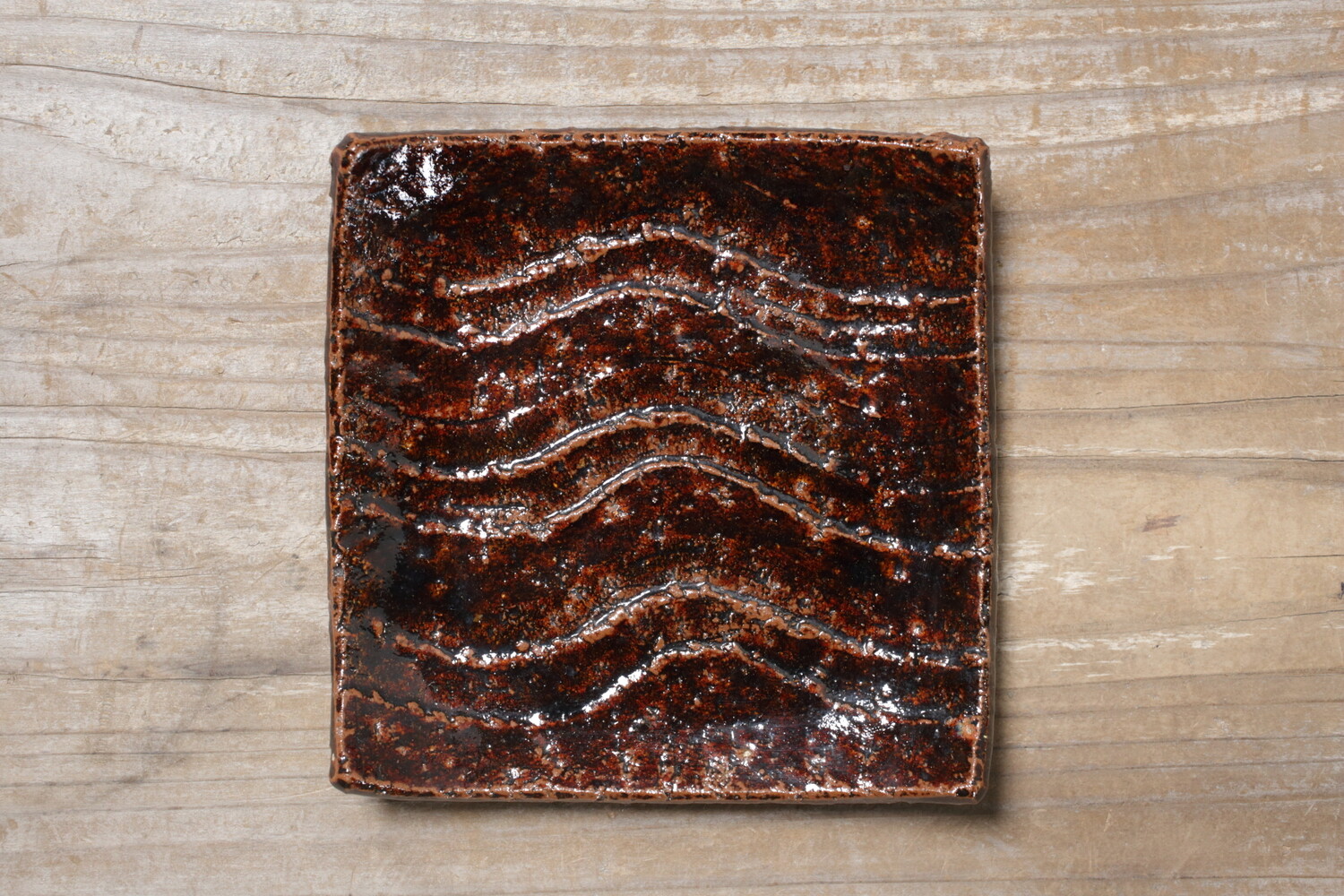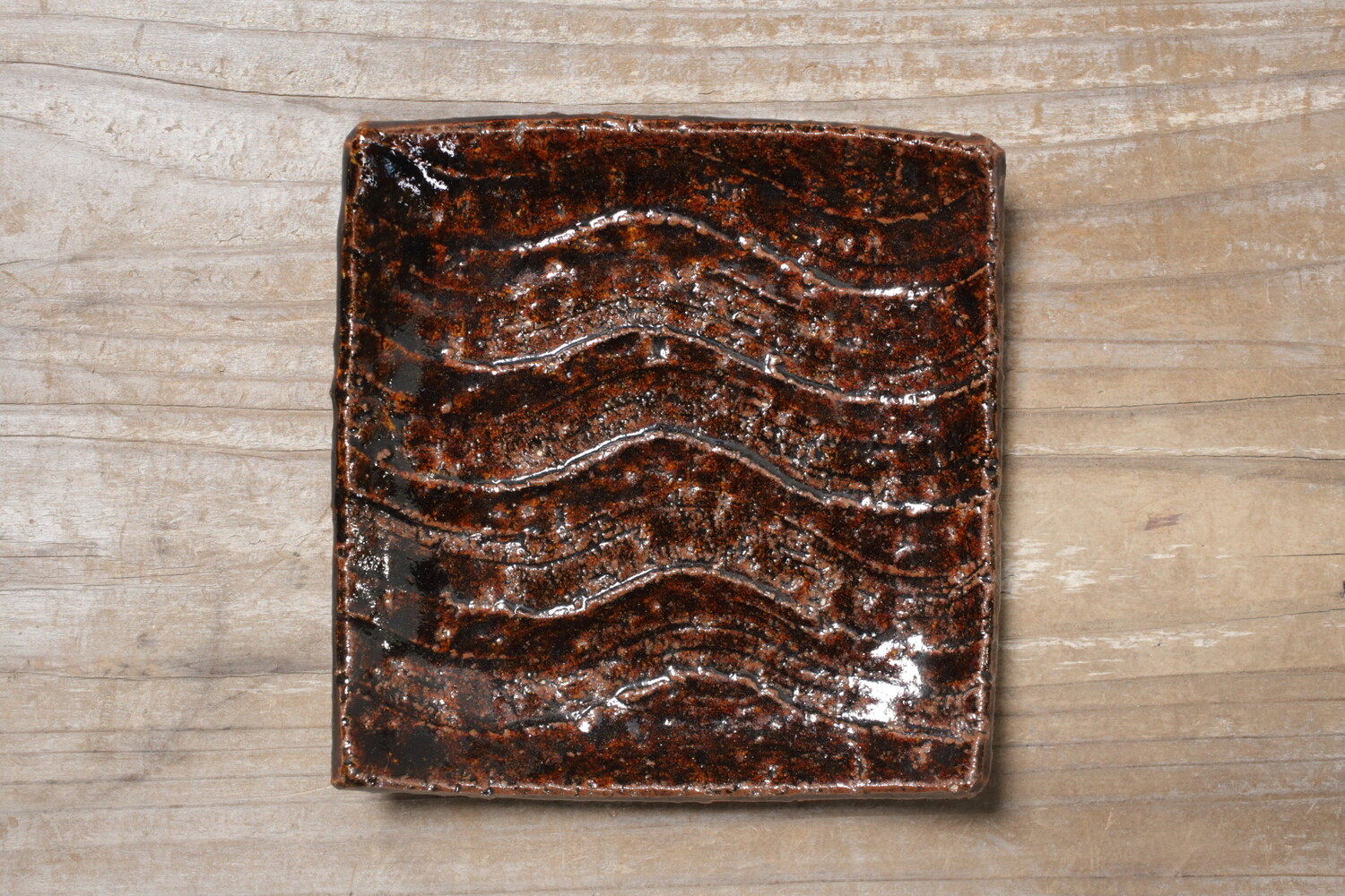 手おこしで作られた山々のような凹凸の装飾が施された15cmほどの正方皿。だし巻き卵や、お一人分のお刺身に。また和菓子、洋菓子問わずデザート皿としても美しいでしょう。