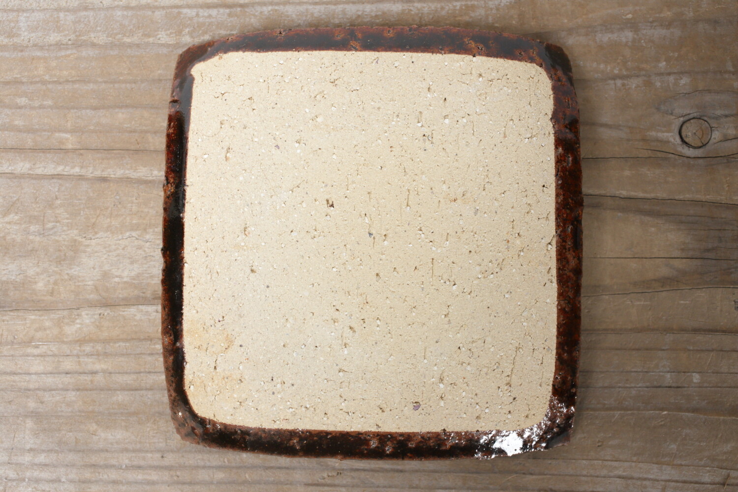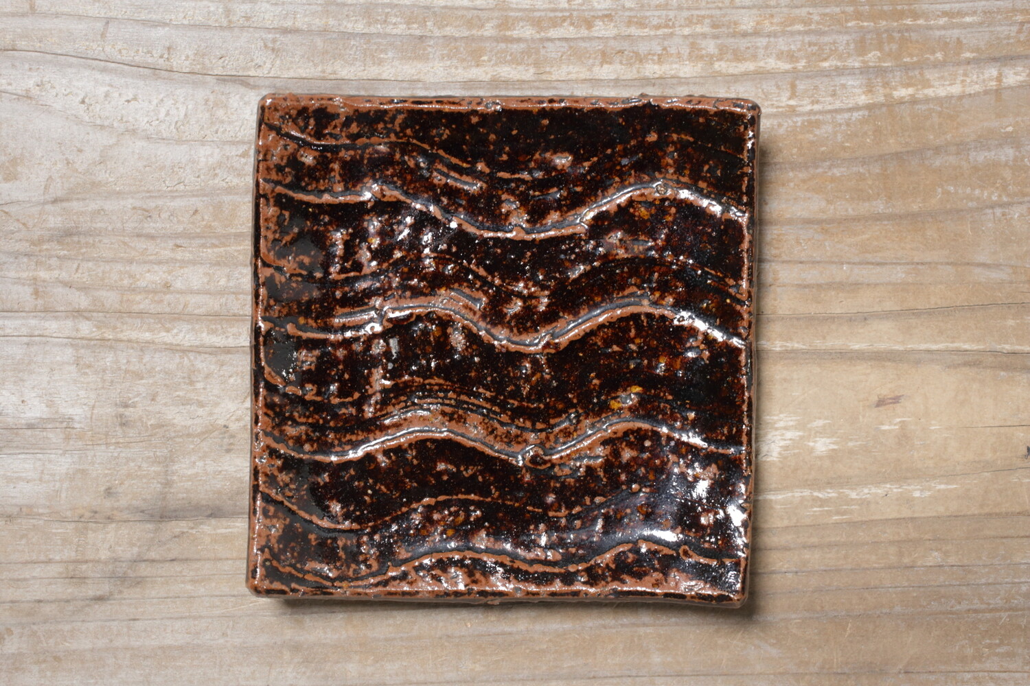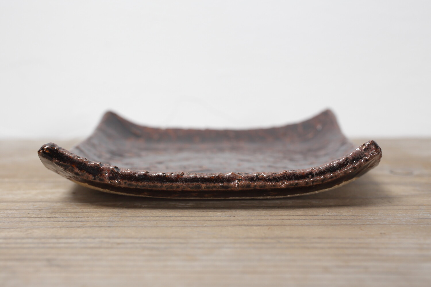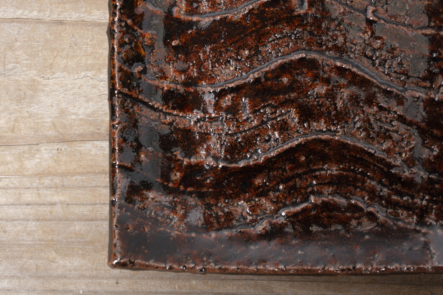 手おこしで作られた山々のような凹凸の装飾が施された15cmほどの正方皿。だし巻き卵や、お一人分のお刺身に。また和菓子、洋菓子問わずデザート皿としても美しいでしょう。
