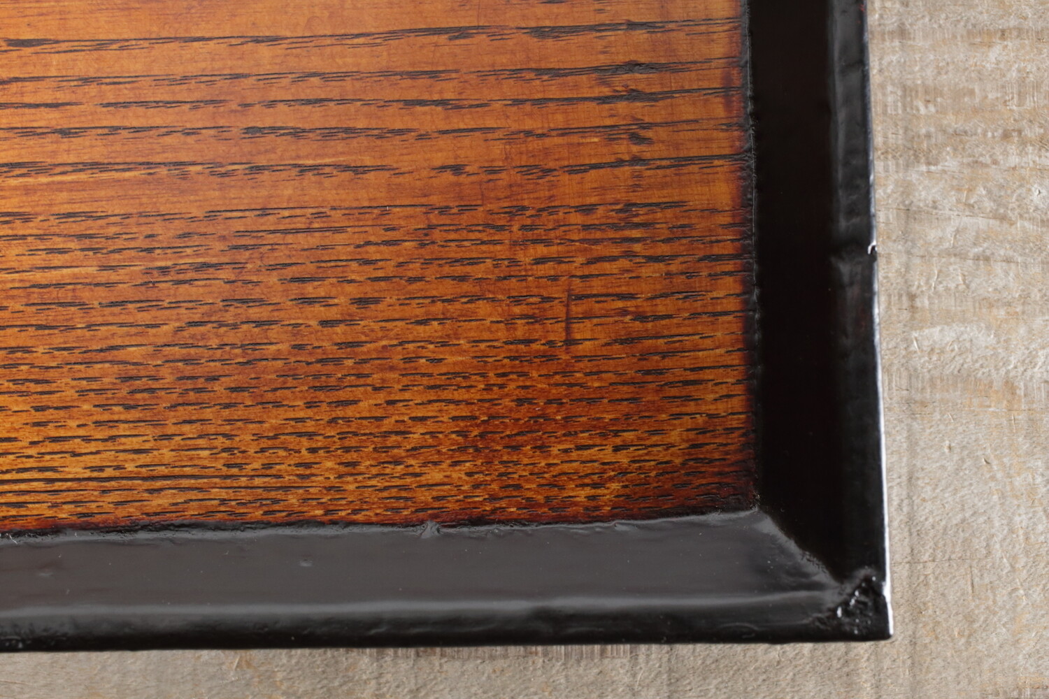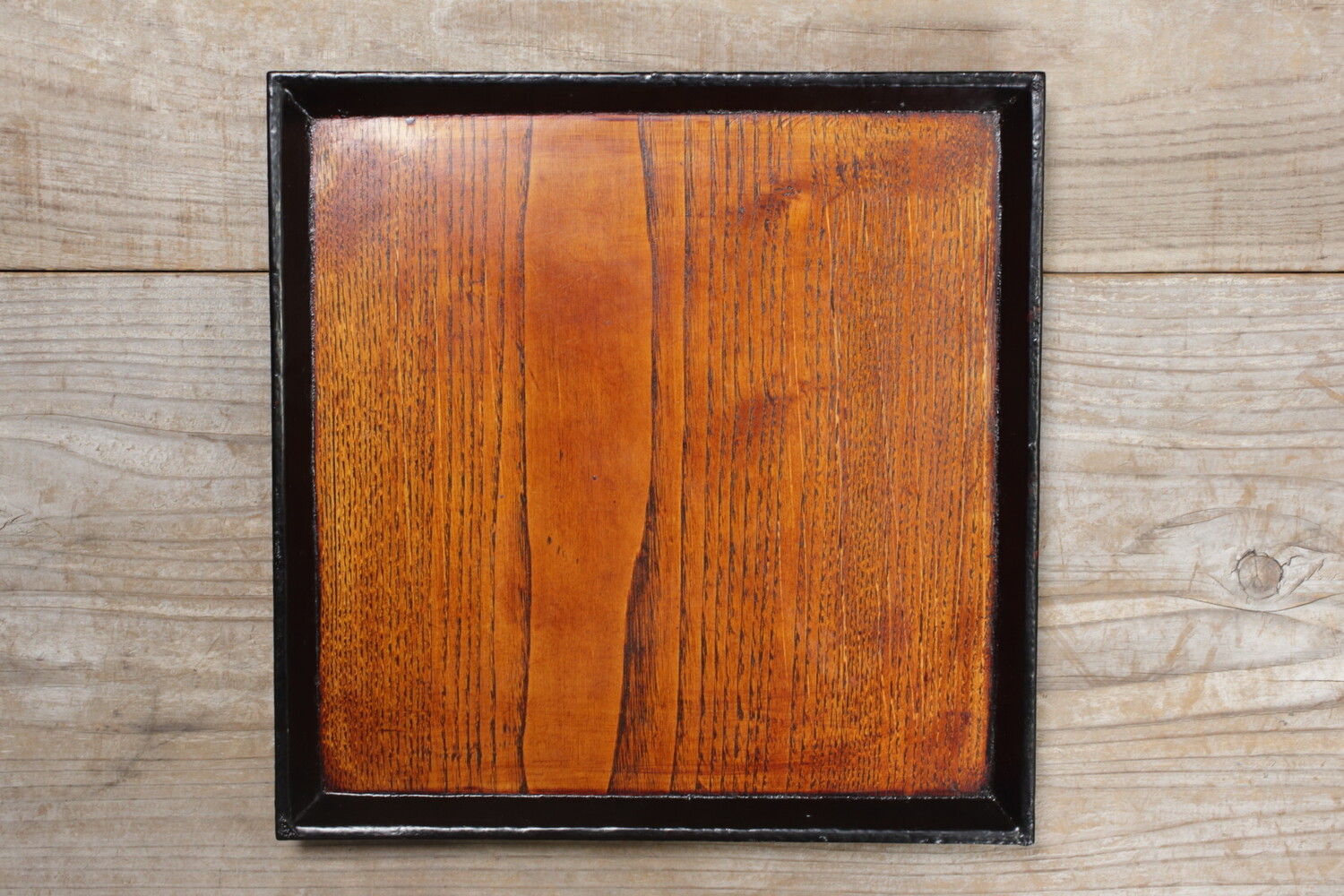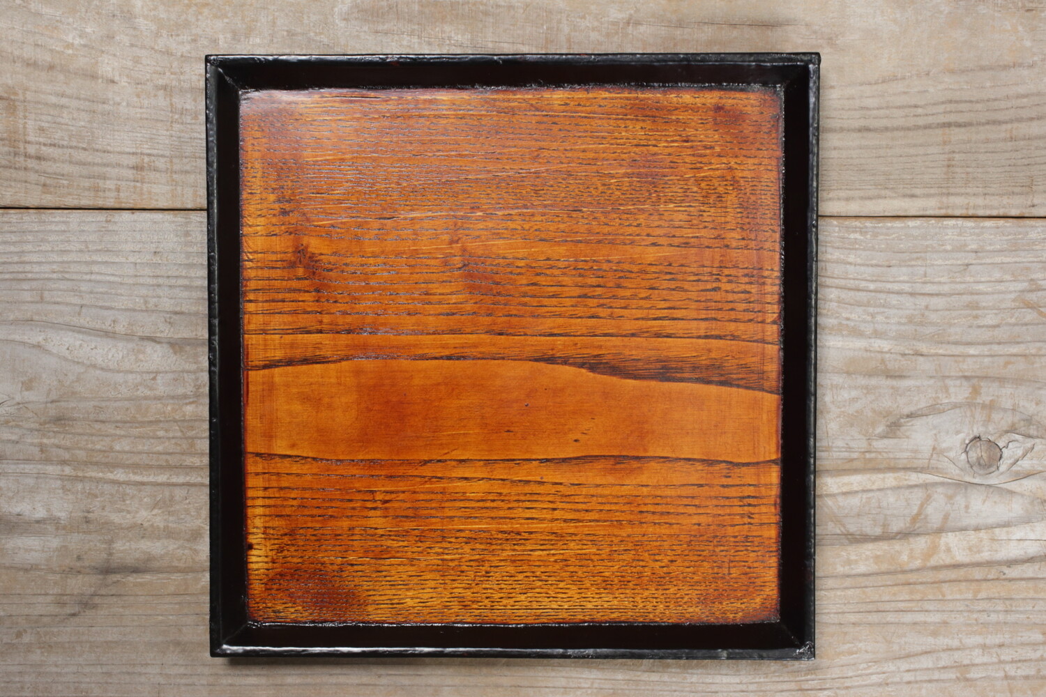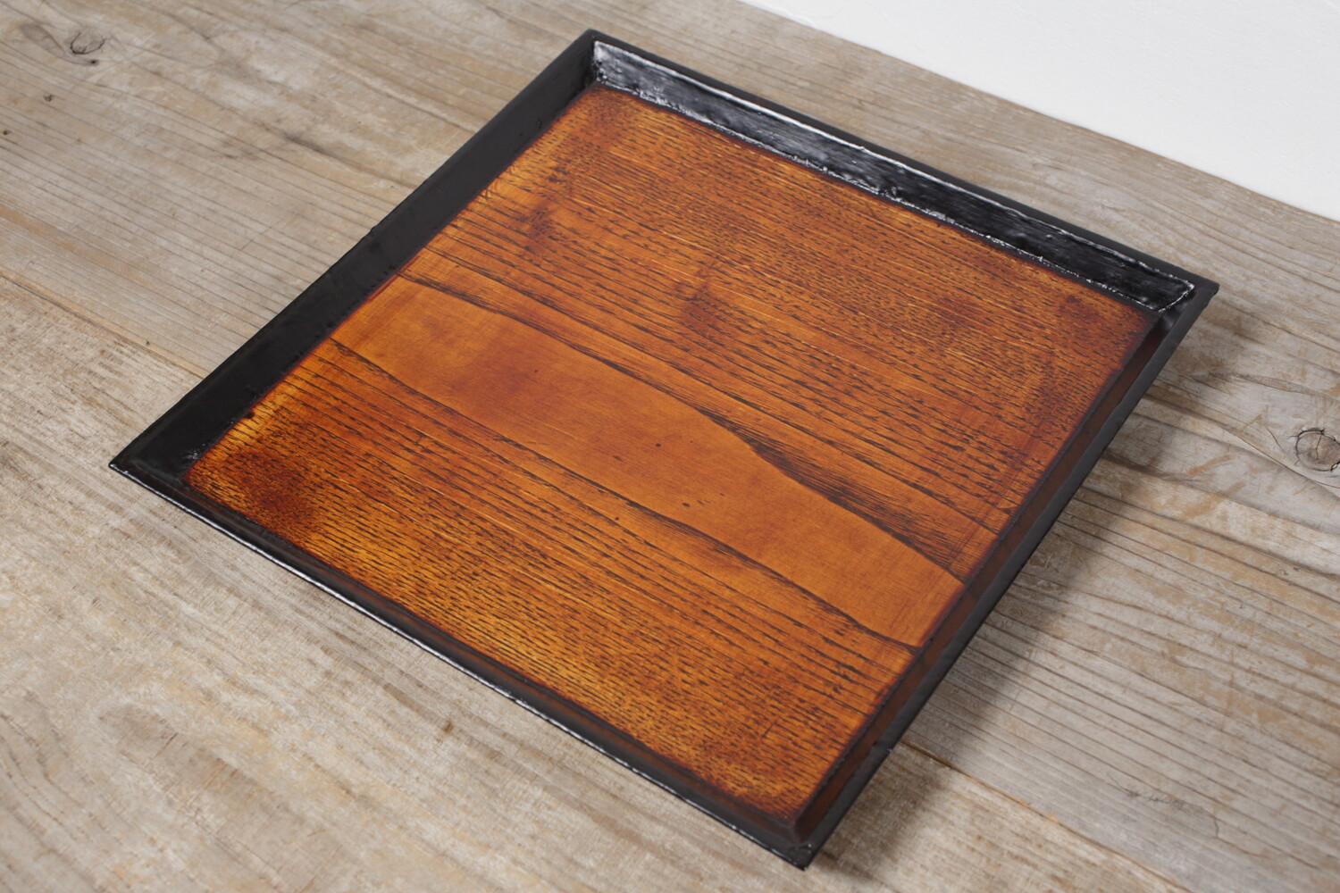 こちらは33cmの正方形でご家庭でお使いいただくのに適したサイズです。深さは1.3cmあります。表は木目を生かし拭き漆をかけ、淵と裏には黒漆を幾重にも塗り重ねています。尺皿的な感じで、おかずやお寿司、巻物や和菓子など木漆の器としてお使い頂いても美しいでしょう。