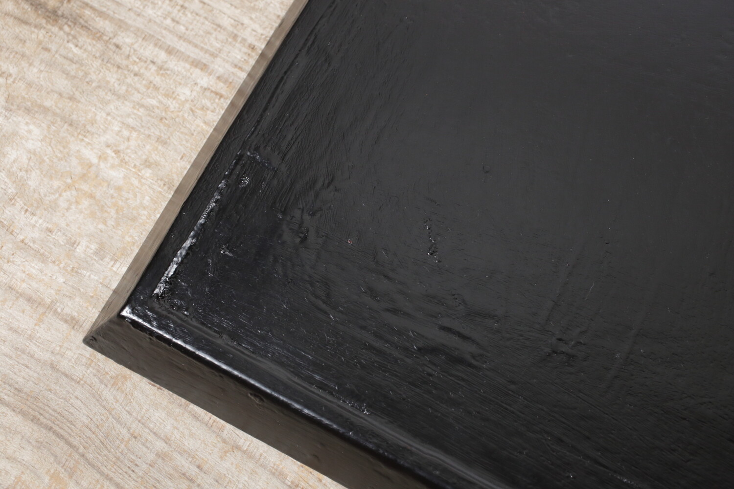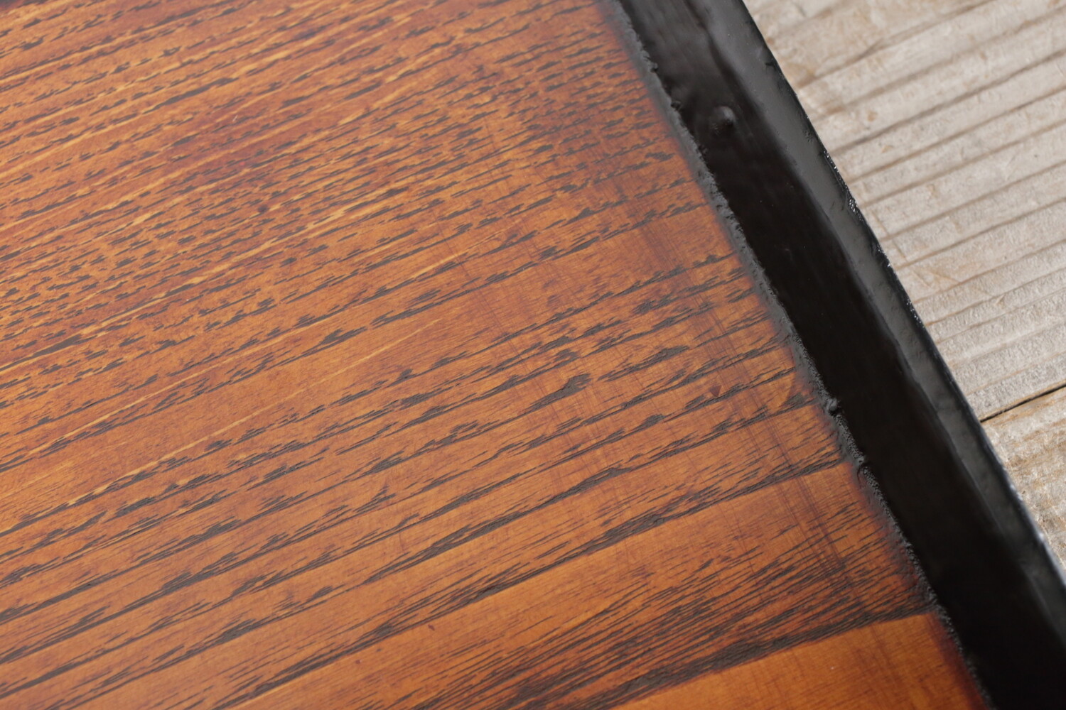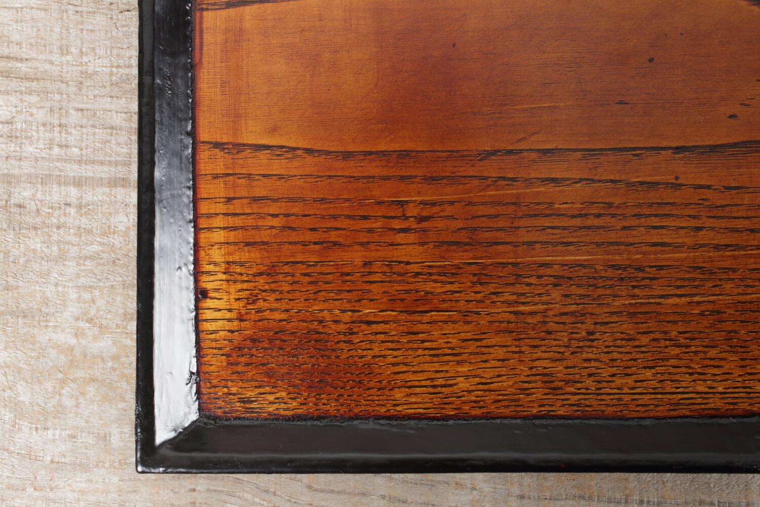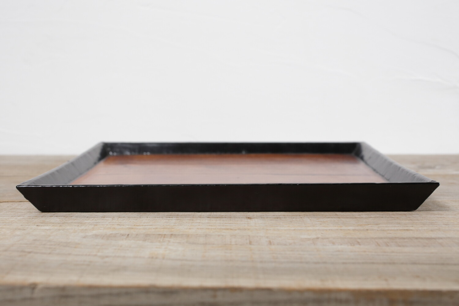 こちらは33cmの正方形でご家庭でお使いいただくのに適したサイズです。深さは1.3cmあります。表は木目を生かし拭き漆をかけ、淵と裏には黒漆を幾重にも塗り重ねています。尺皿的な感じで、おかずやお寿司、巻物や和菓子など木漆の器としてお使い頂いても美しいでしょう。