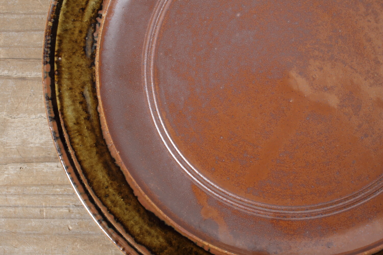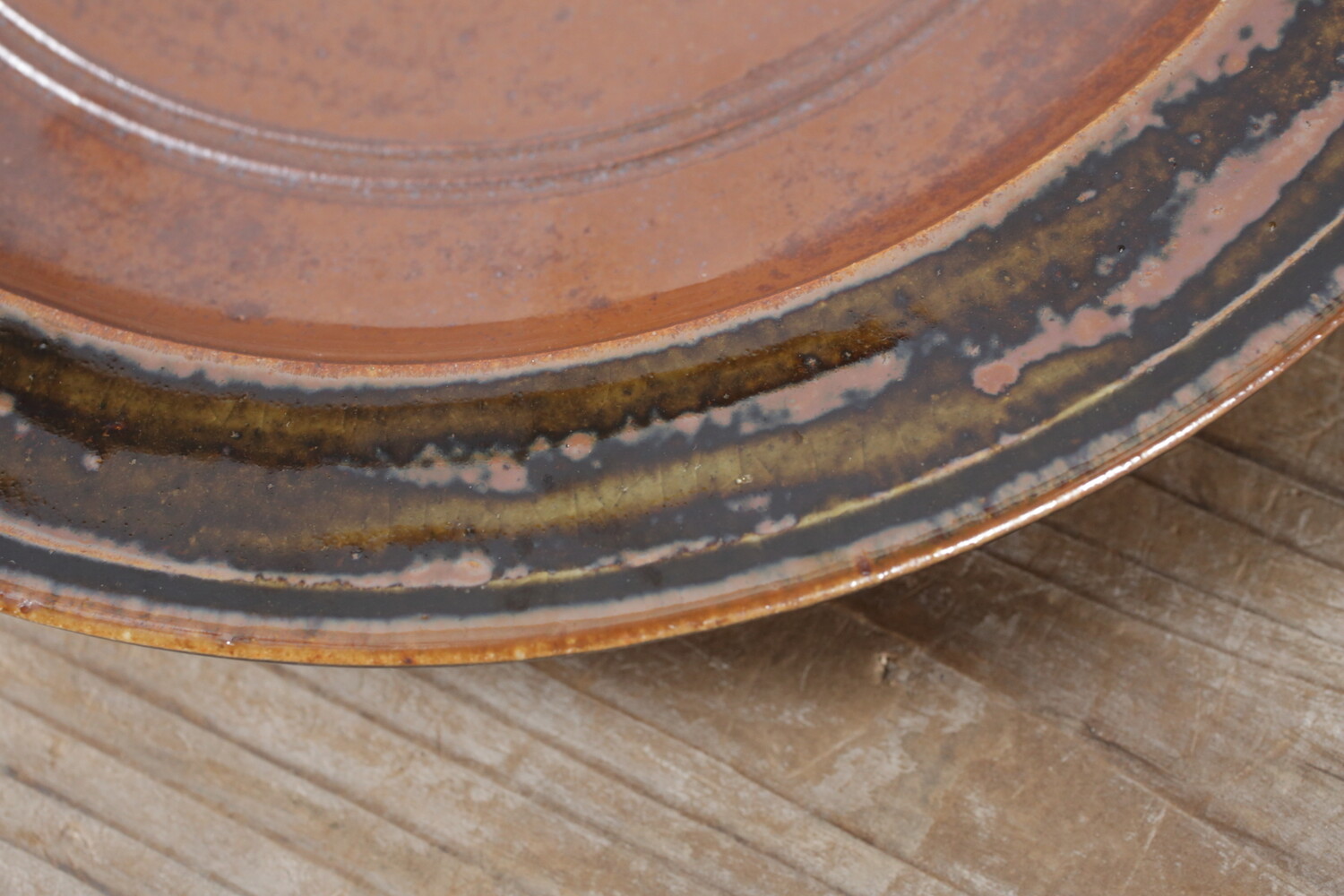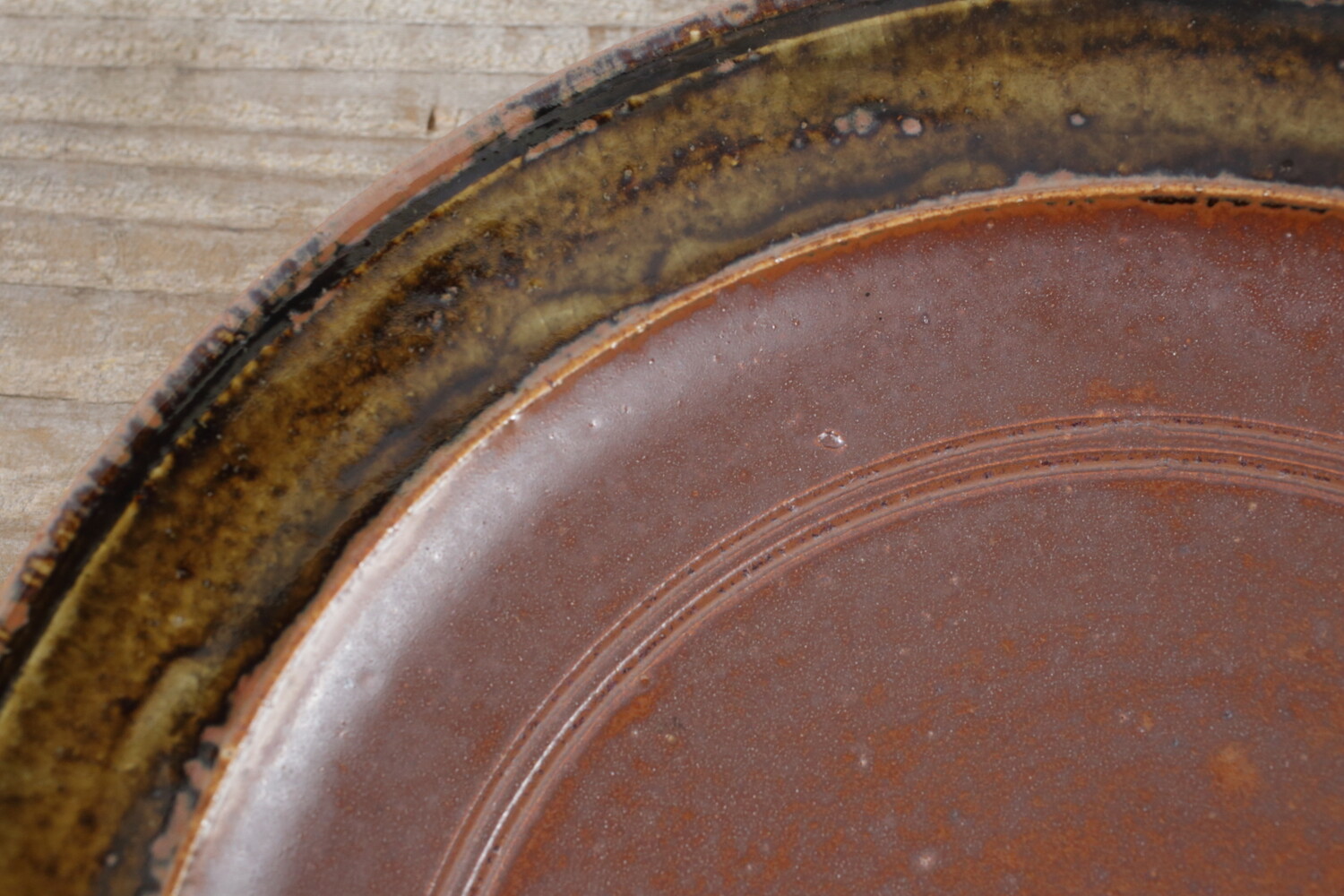 鉄釉と飴釉を掛け分けている直径25.8cmほどの平皿。単色の飴釉と鉄釉ですと、どこかのっぺりとして人工的な印象にもなってしまいますが、どちらの釉薬も自然な陰影があり綺麗に釉薬が溶けているために、掛け分けで組み合わせてもすんなりと馴染んでいます。美しい一枚です。ご家族のおかずやお刺身などにもいいでしょう。