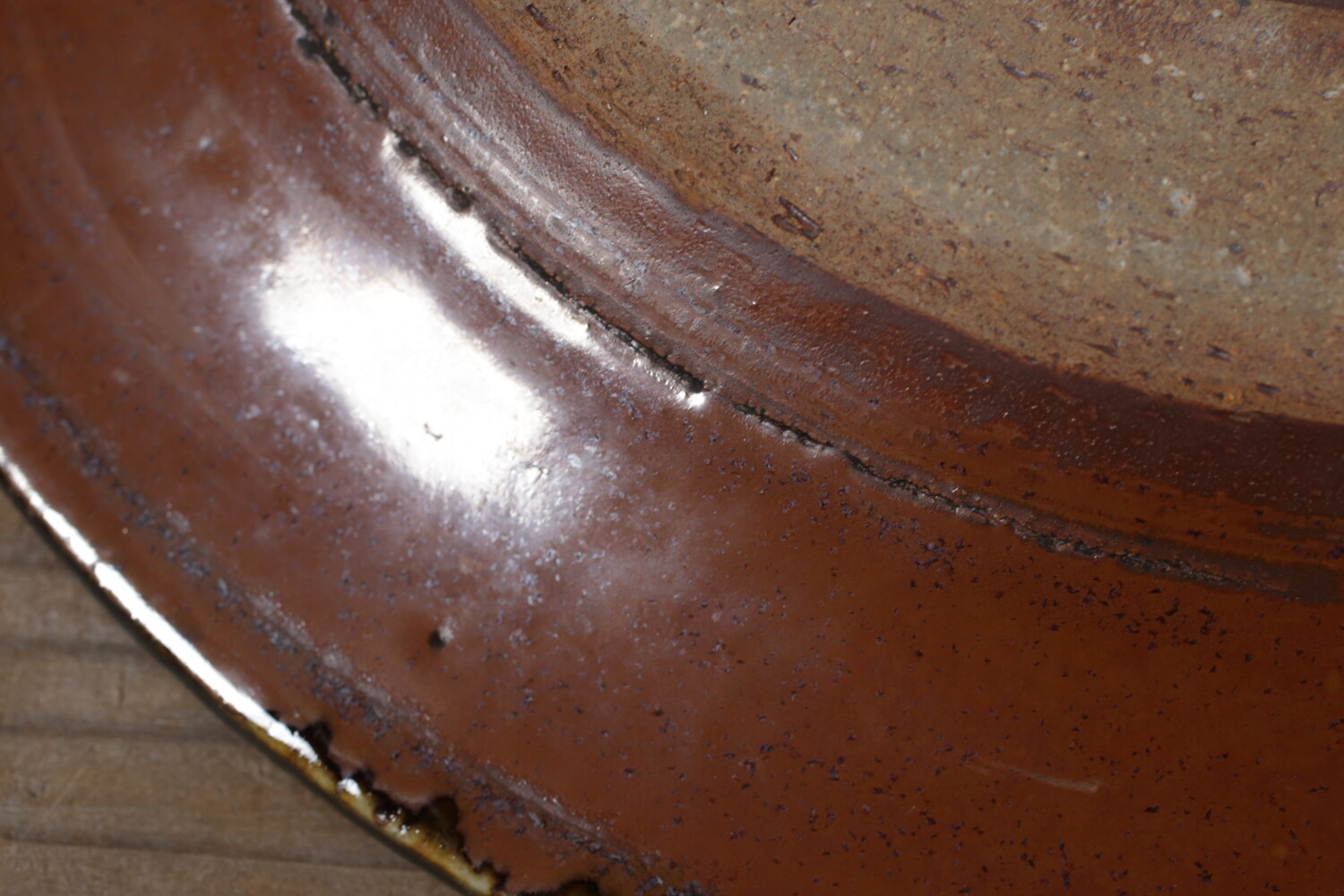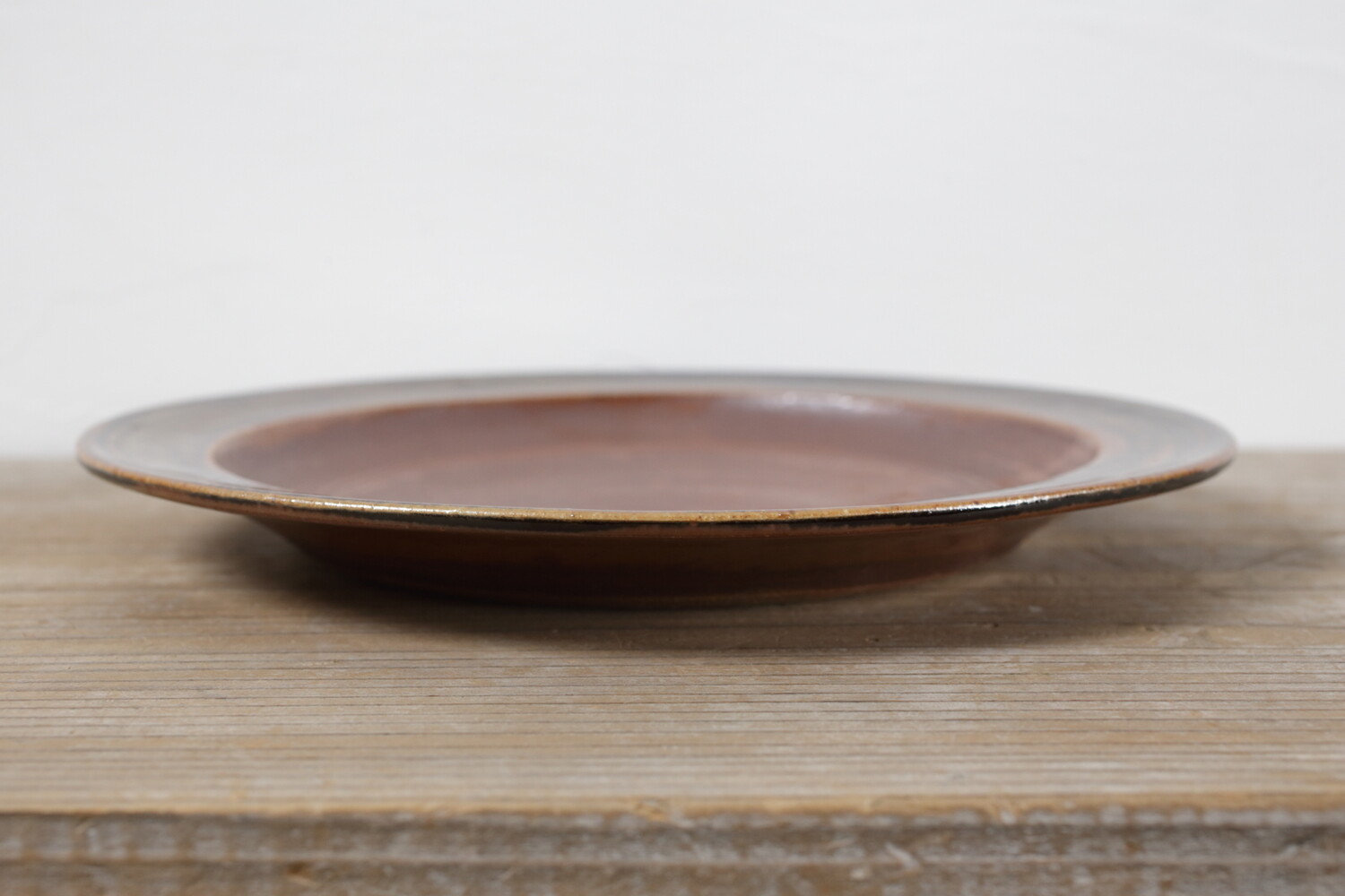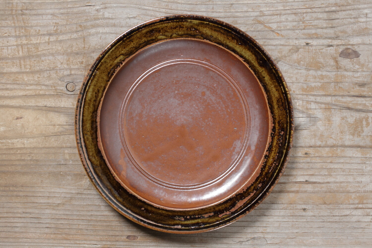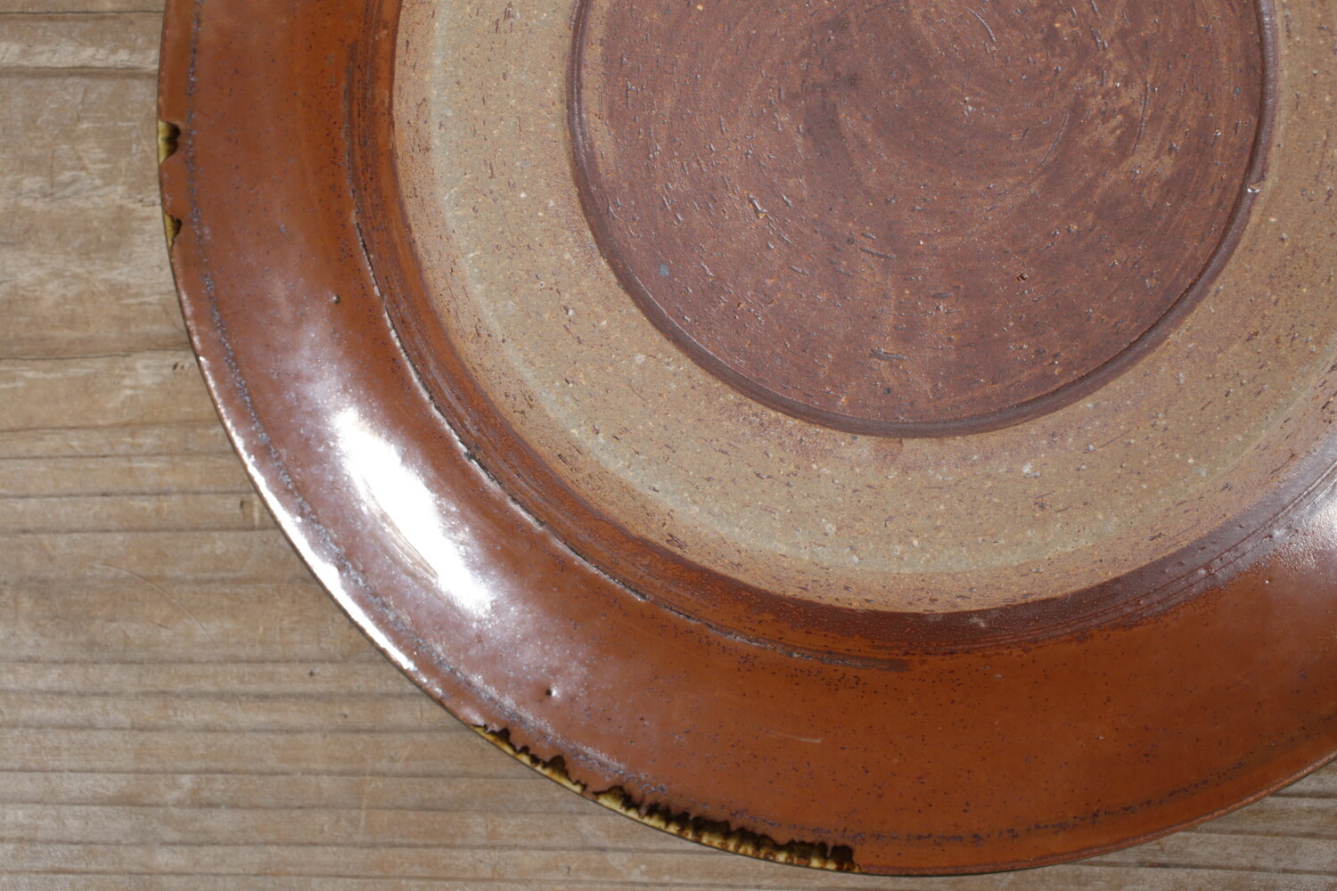 鉄釉と飴釉を掛け分けている直径25.8cmほどの平皿。単色の飴釉と鉄釉ですと、どこかのっぺりとして人工的な印象にもなってしまいますが、どちらの釉薬も自然な陰影があり綺麗に釉薬が溶けているために、掛け分けで組み合わせてもすんなりと馴染んでいます。美しい一枚です。ご家族のおかずやお刺身などにもいいでしょう。