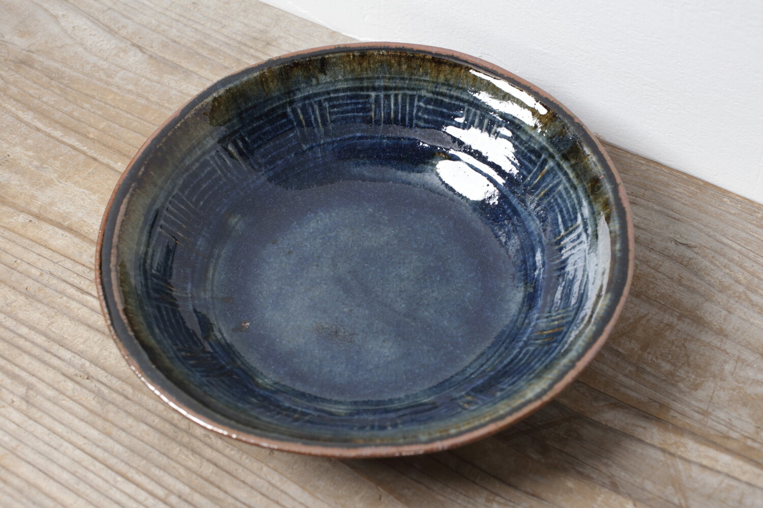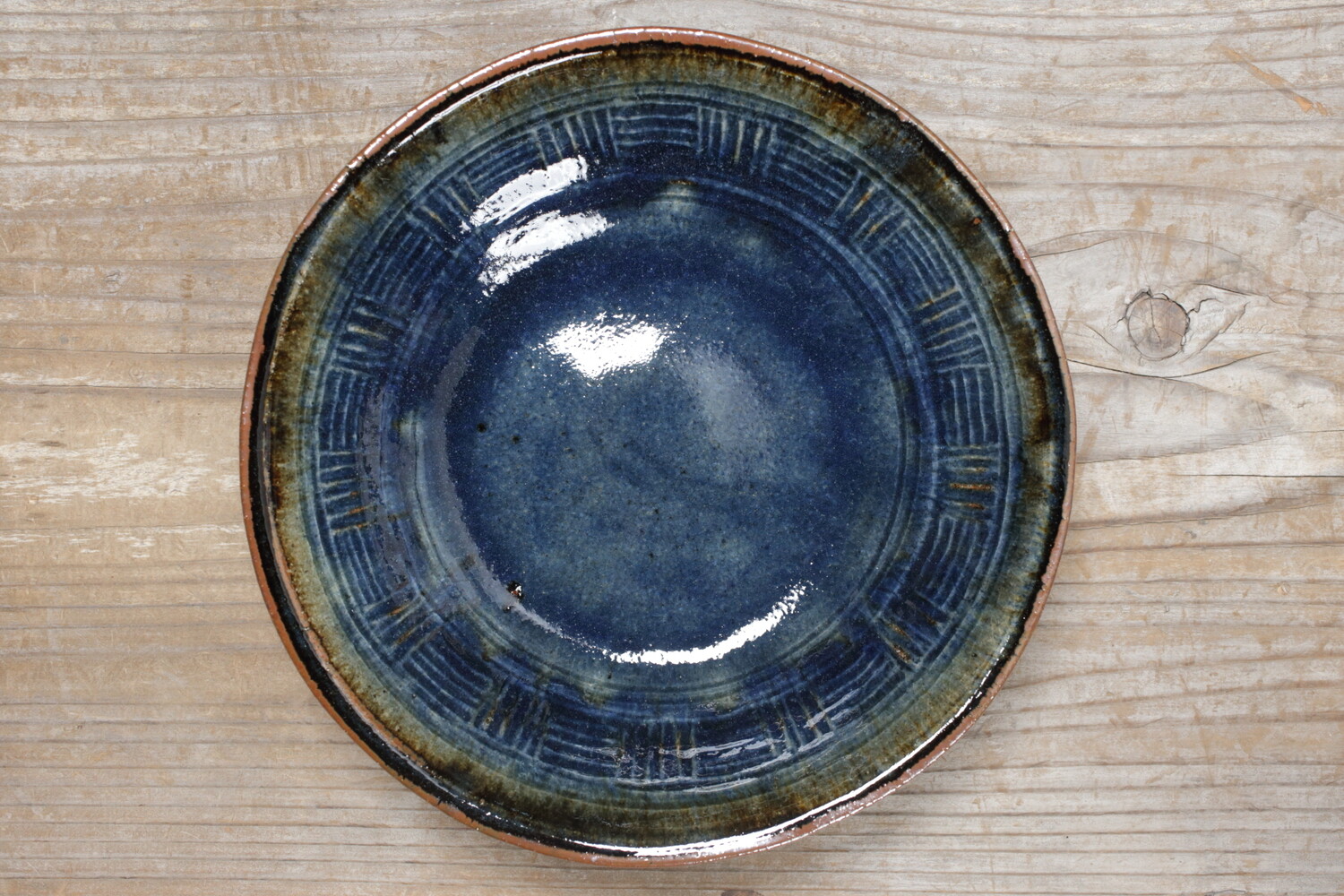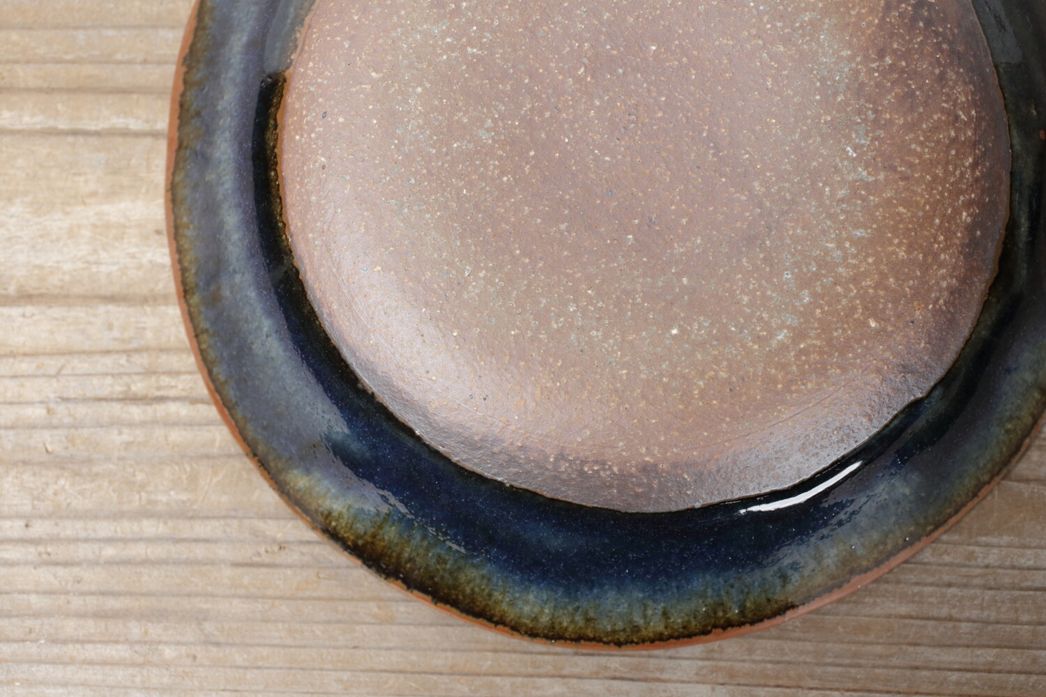 瑠璃釉と呼ばれる色鮮やかな青みが美しい直径25.3cmほどの八寸鉢。奥行きのある色味で、色鮮やかな食材も自然な色合いの食材も、器と互いに引き立て合う釉薬です。ふちの鉄釉がけも全体を引き締めていますね。ご家族のおかずにちょうどいい大きさです。