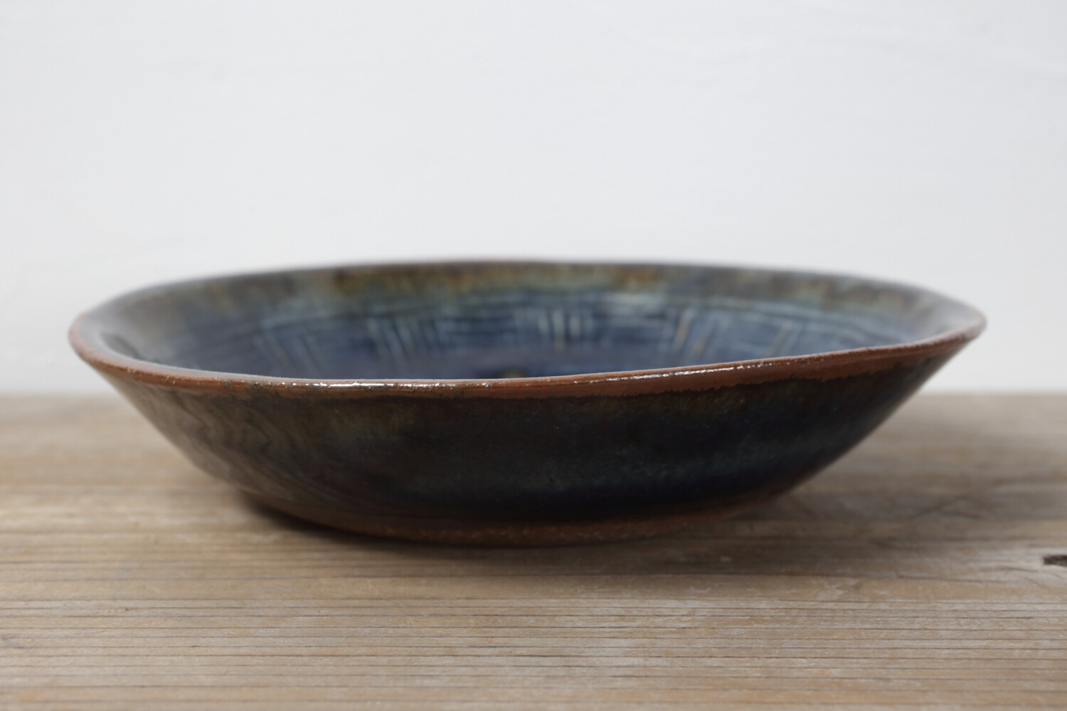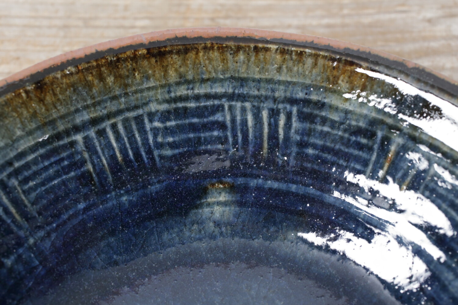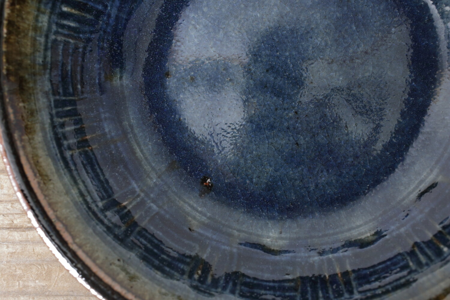 瑠璃釉と呼ばれる色鮮やかな青みが美しい直径25.3cmほどの八寸鉢。奥行きのある色味で、色鮮やかな食材も自然な色合いの食材も、器と互いに引き立て合う釉薬です。ふちの鉄釉がけも全体を引き締めていますね。ご家族のおかずにちょうどいい大きさです。