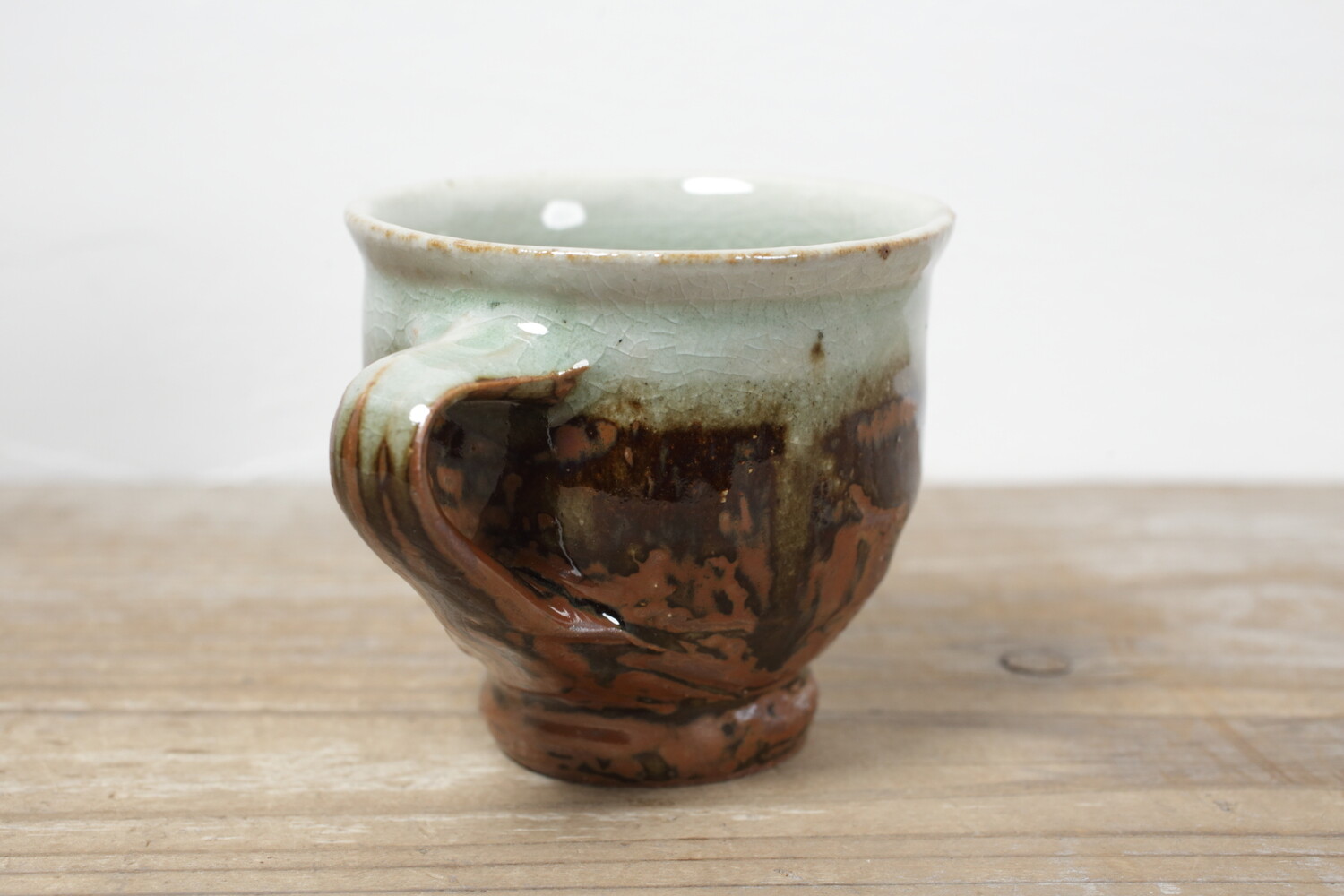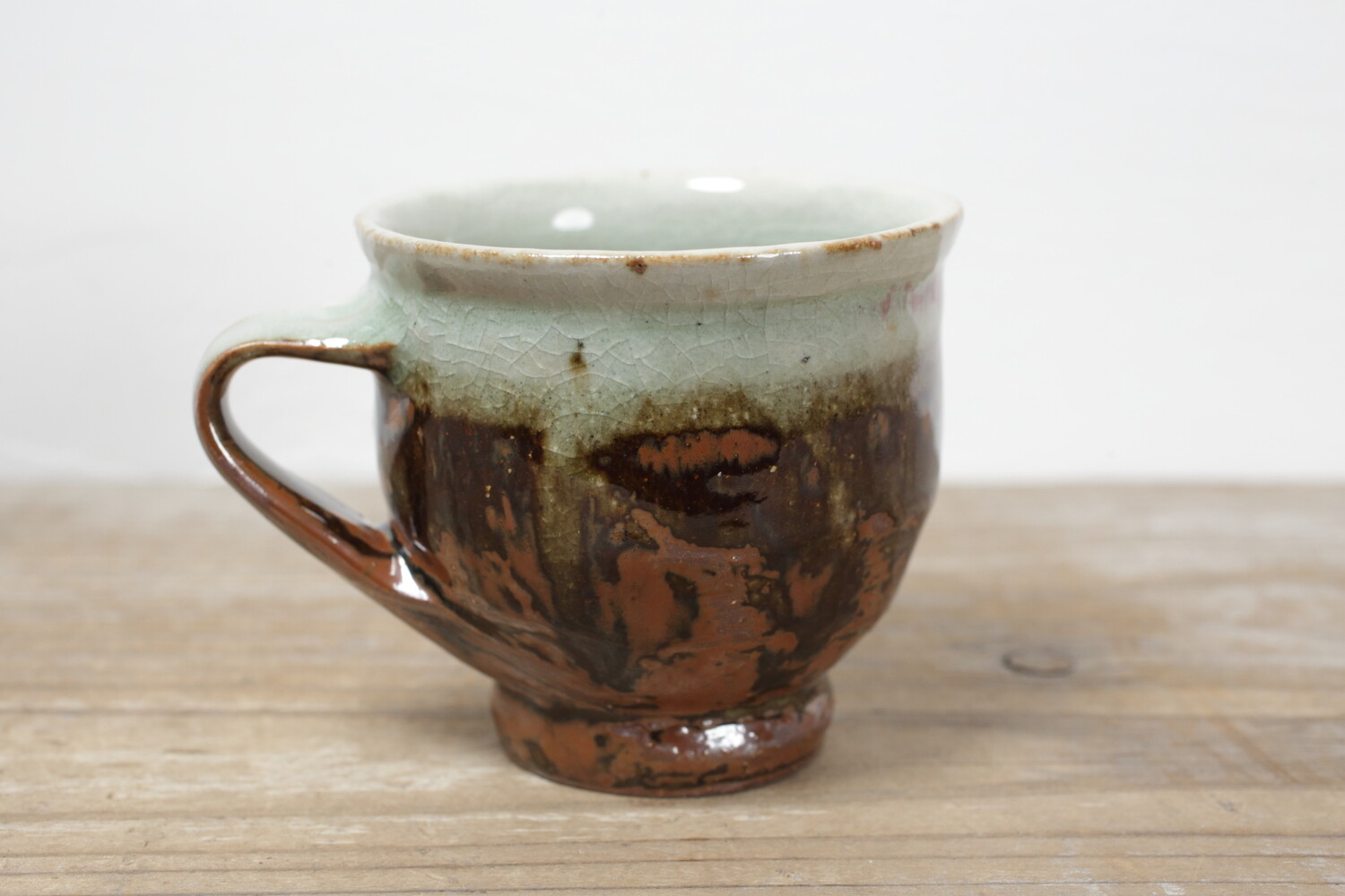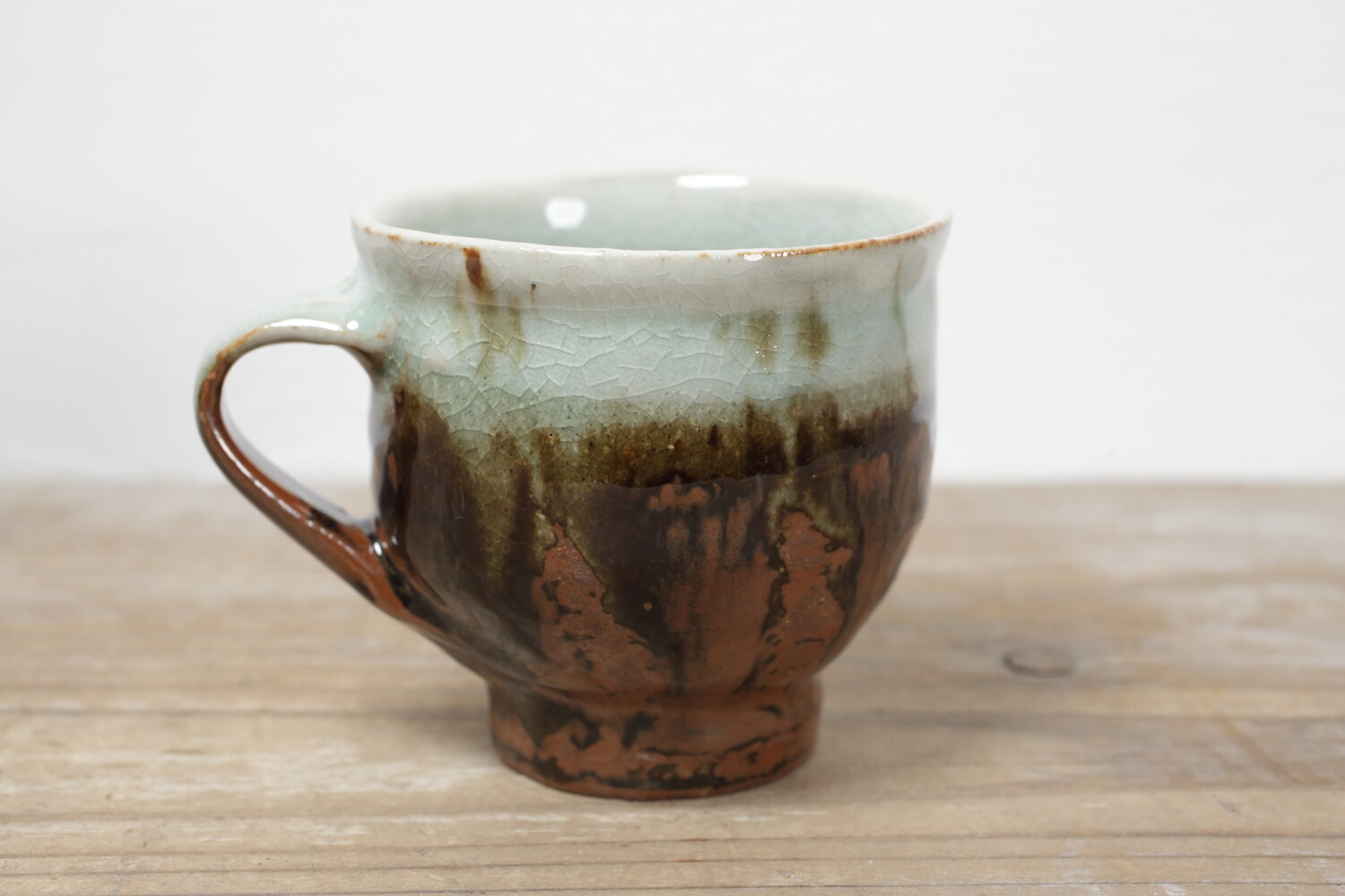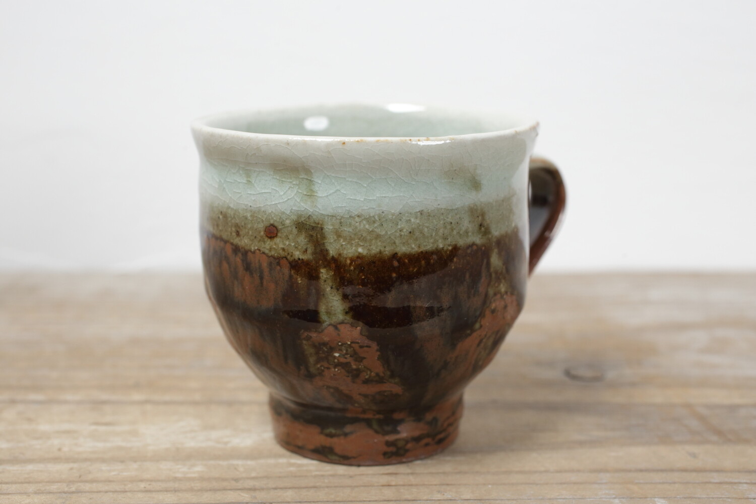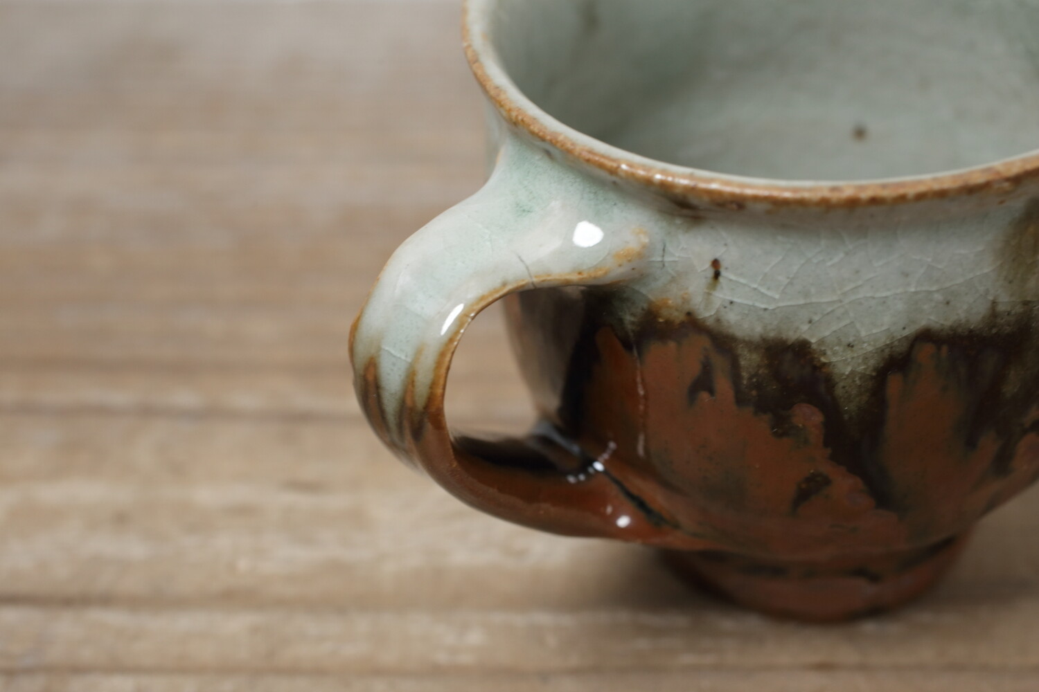 何とも森山窯らしい自然な品格が漂う指描マグカップ。外側も内側も風情のある釉薬と森山さんが長年定番として取り組み若き頃に濱田庄司氏にそのやり方を教えて頂いたという指描き、全ての要素のバランスが美しいマグカップです。大きさは小さ過ぎず毎日使うマグカップとしてちょうどいい容量240mlほど(八分目ほどで計量)、直径9cmほどの大きさです。