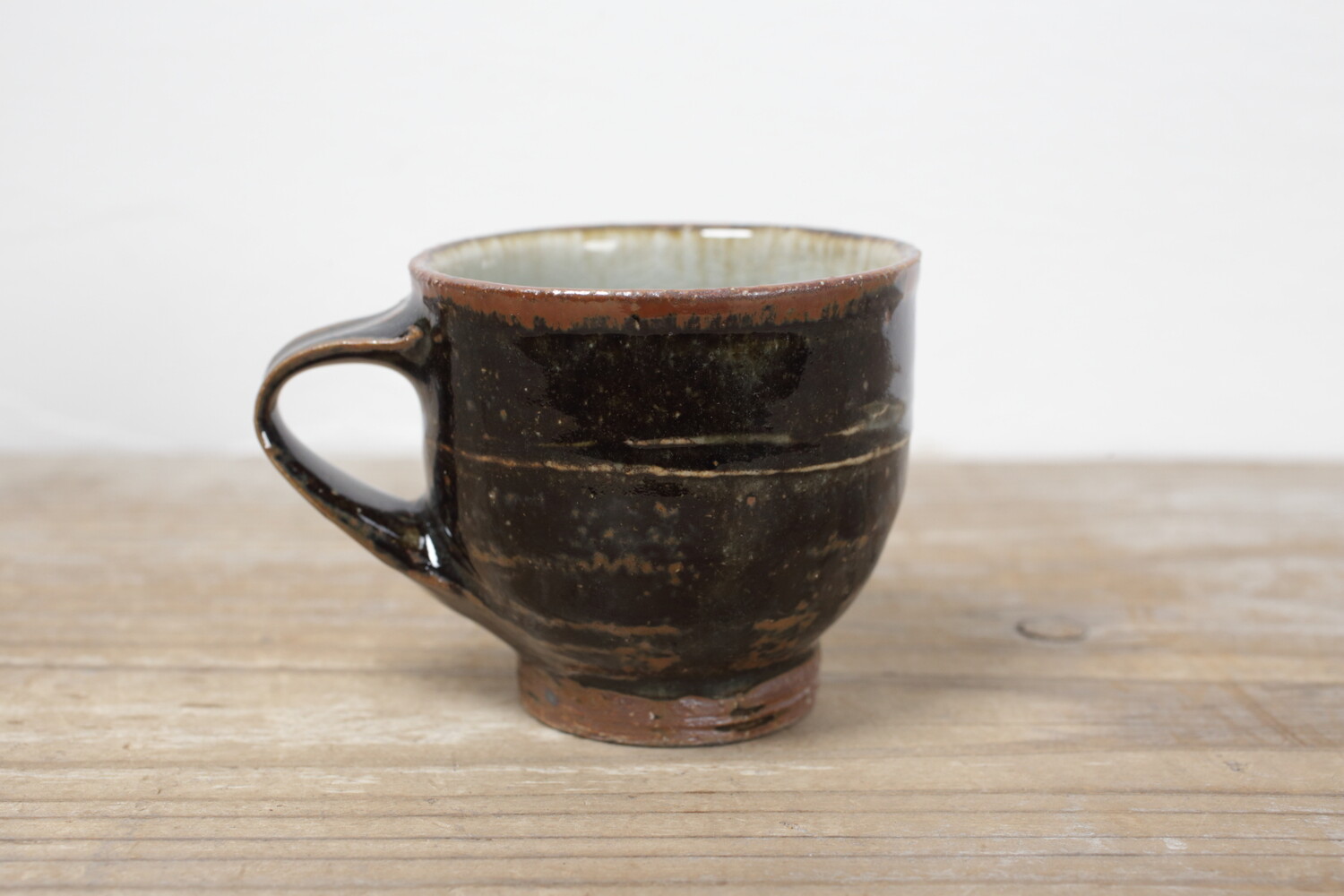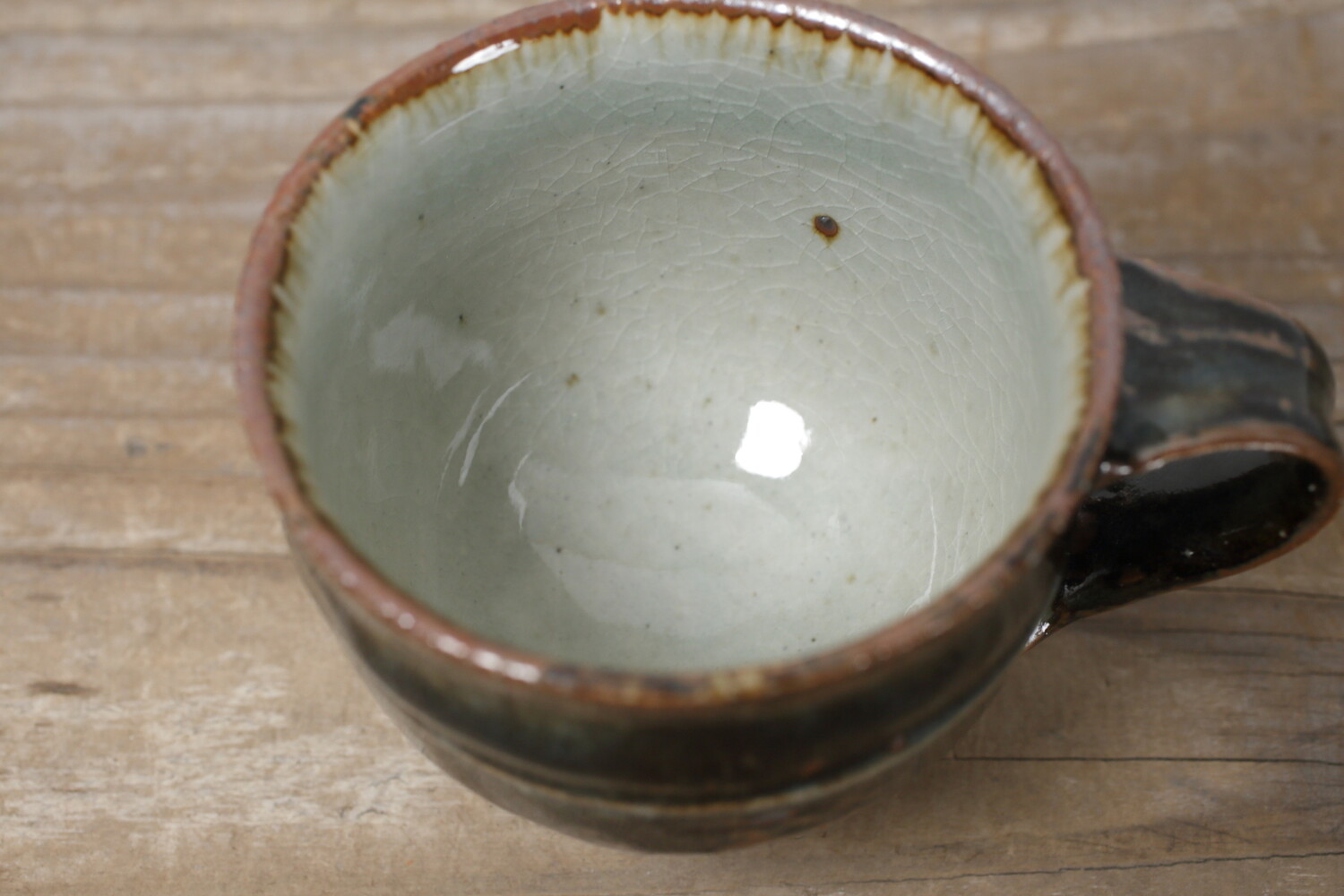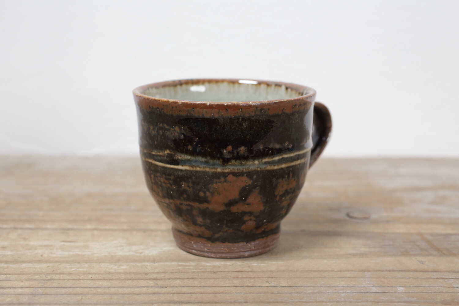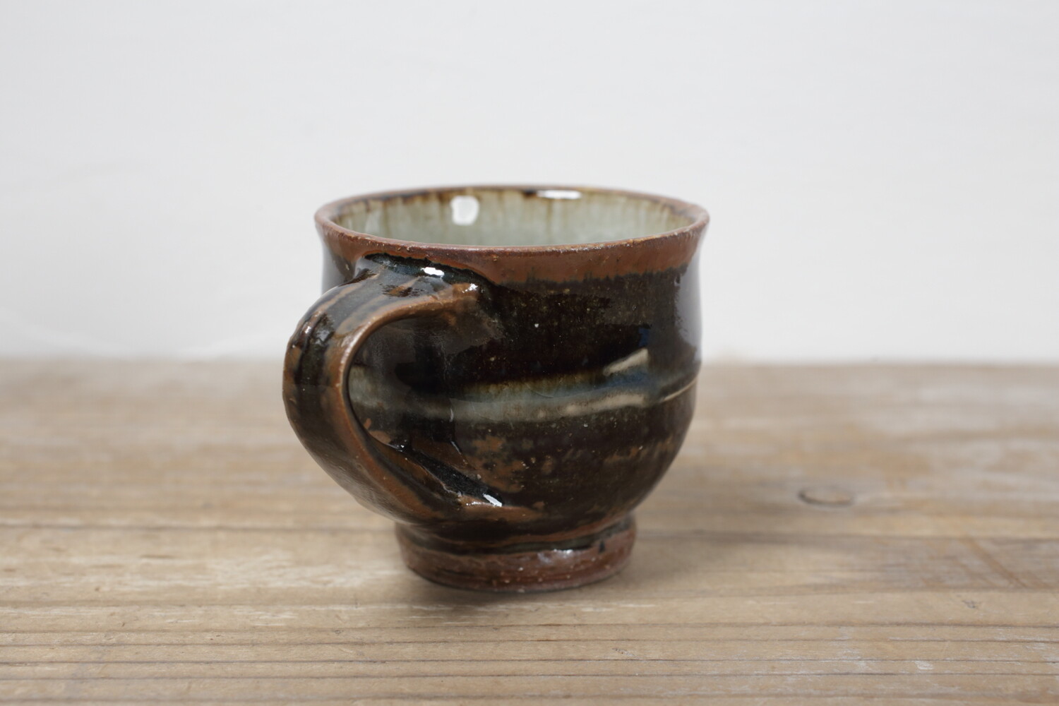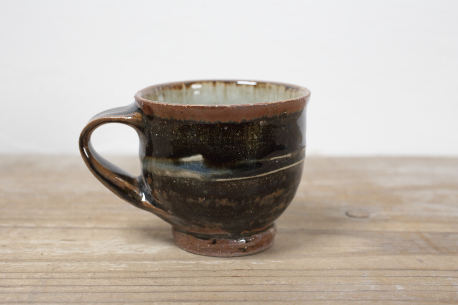 通常より少し強めに焼き上がったため、黒みが強く仕上がった呉須釉コーヒーカップ。カップの直径は約7.8cmほど、高さは7cmと昔ながらの大き過ぎないサイズ感のカップです。