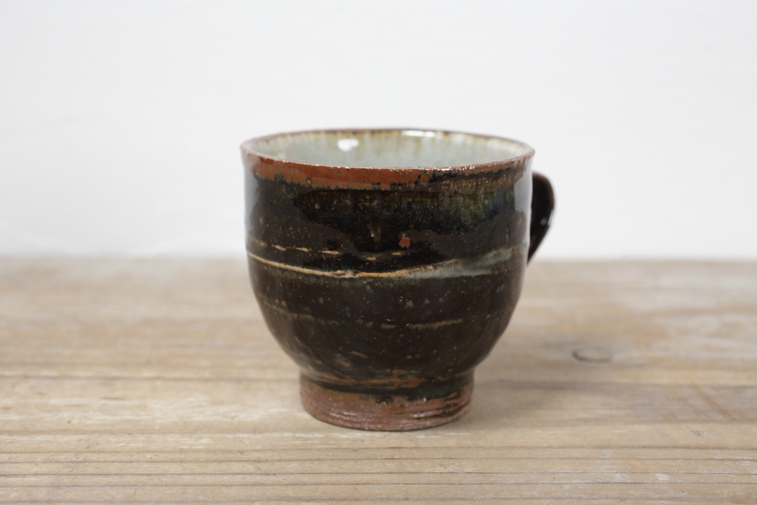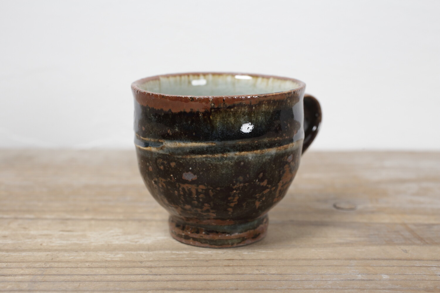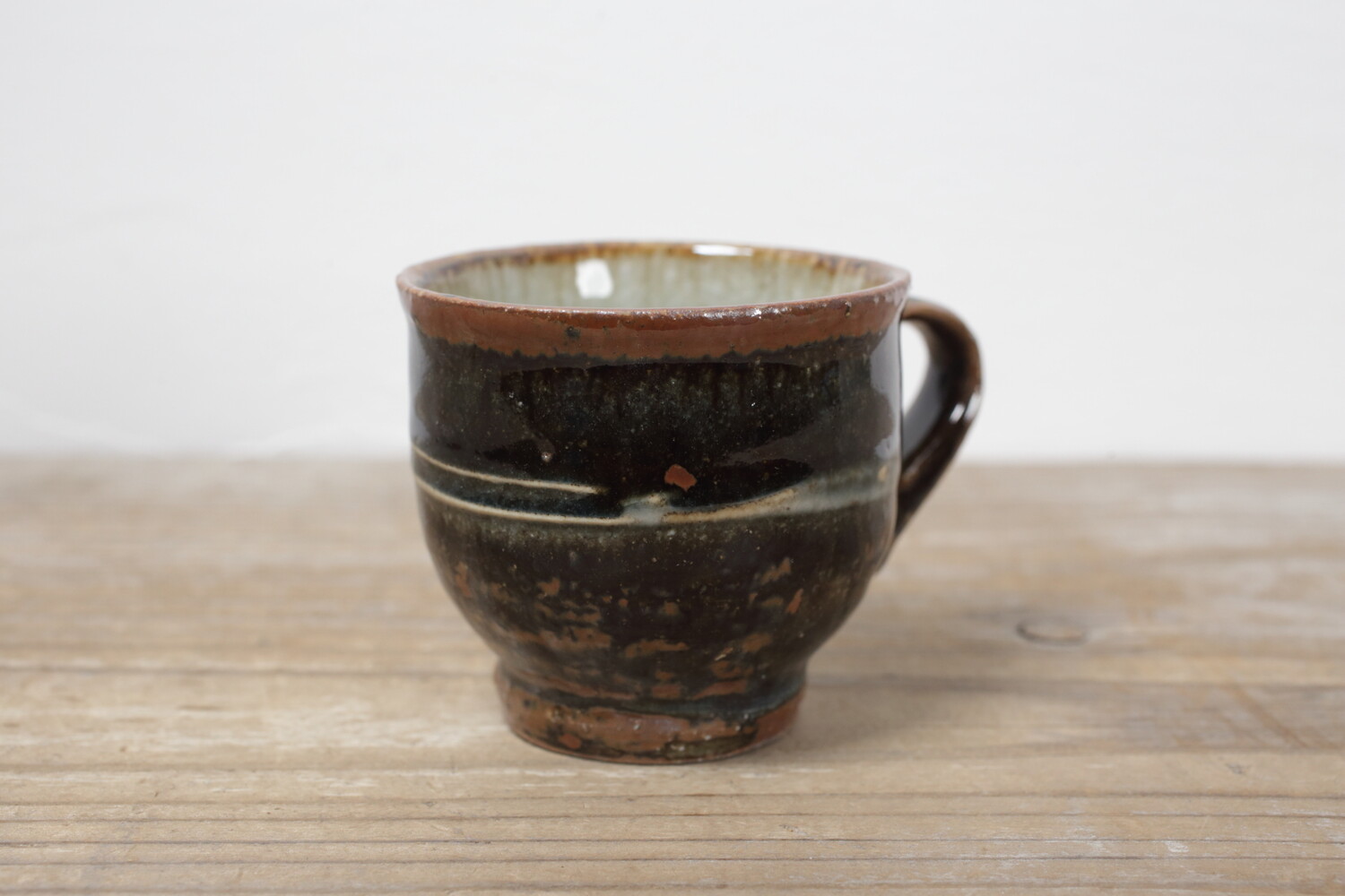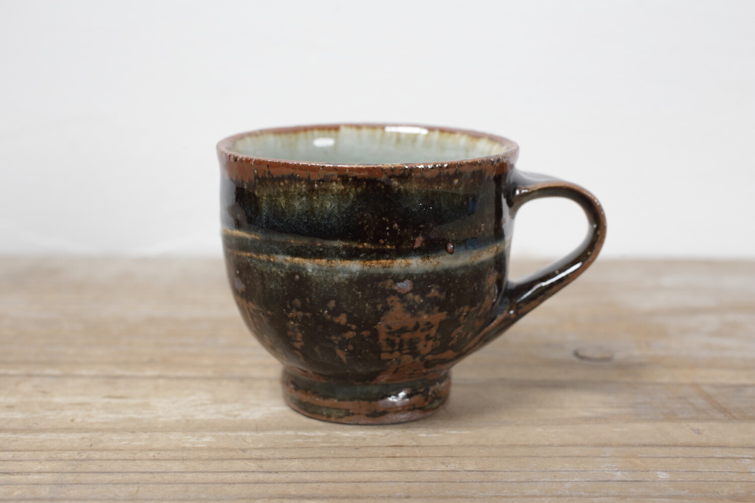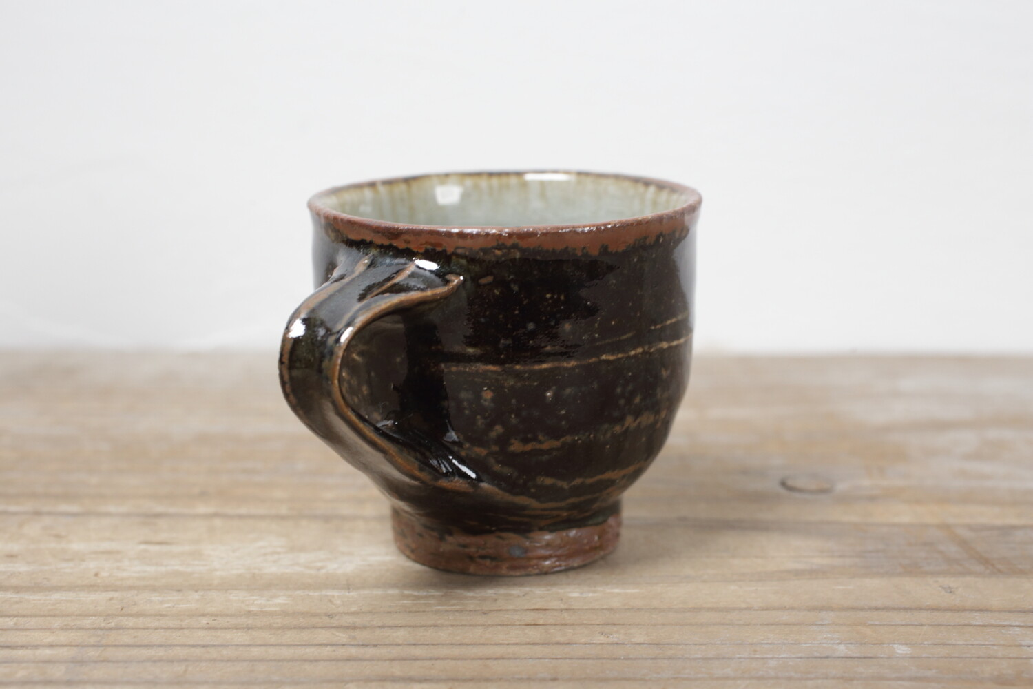 通常より少し強めに焼き上がったため、黒みが強く仕上がった呉須釉コーヒーカップ。カップの直径は約7.8cmほど、高さは7cmと昔ながらの大き過ぎないサイズ感のカップです。
