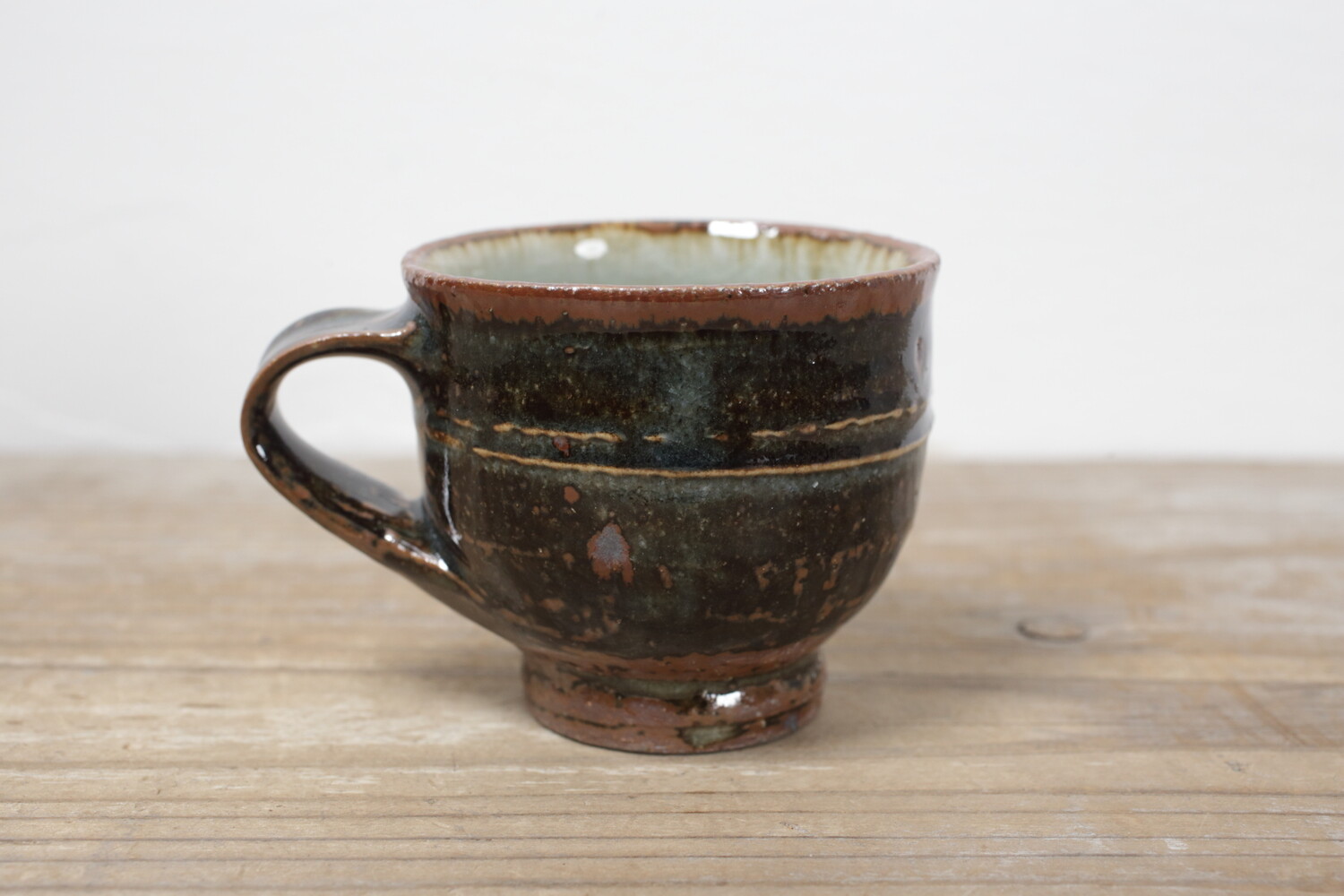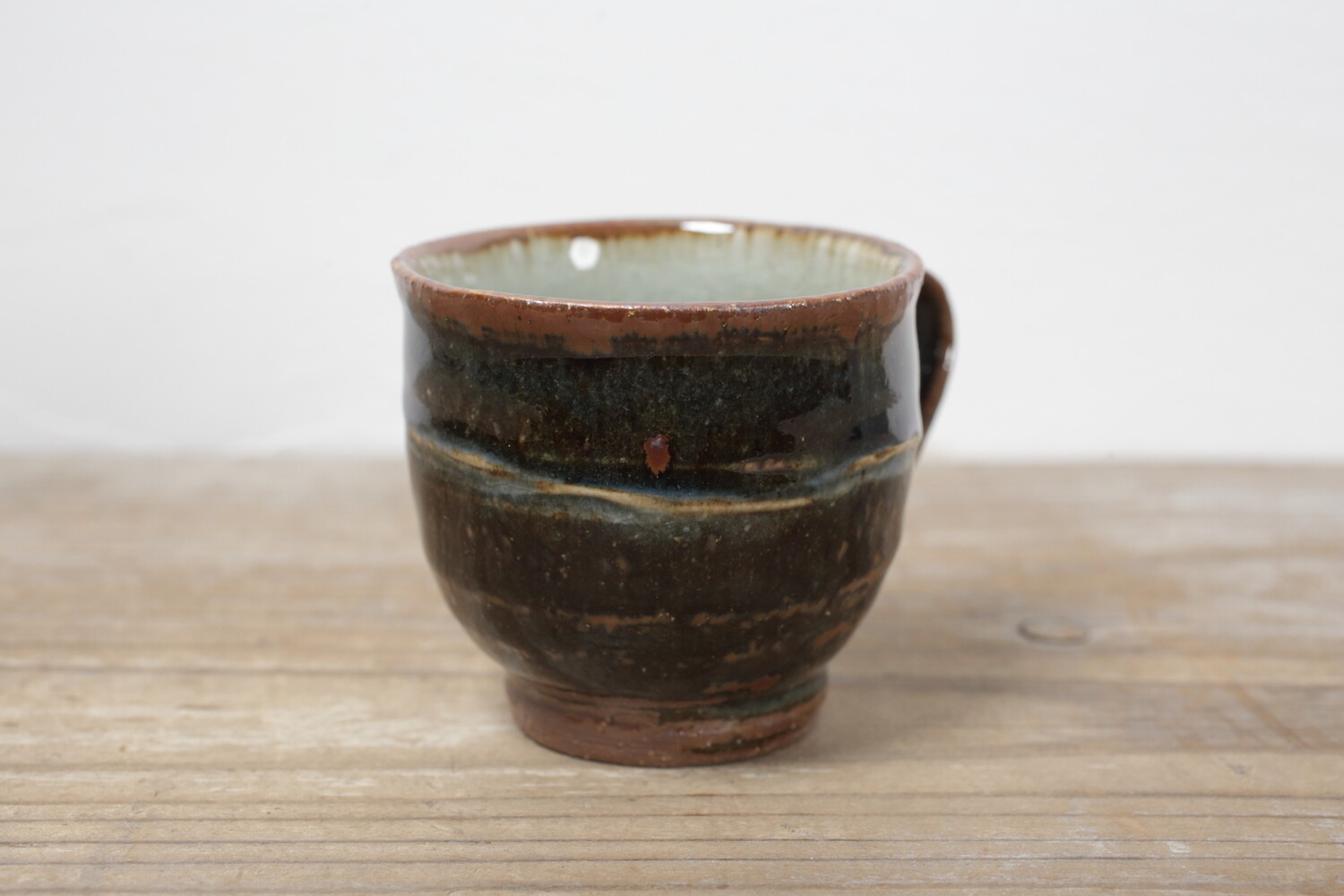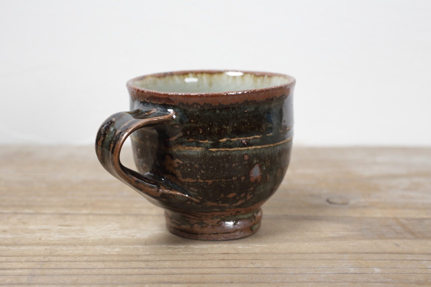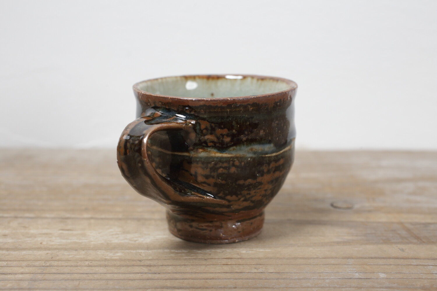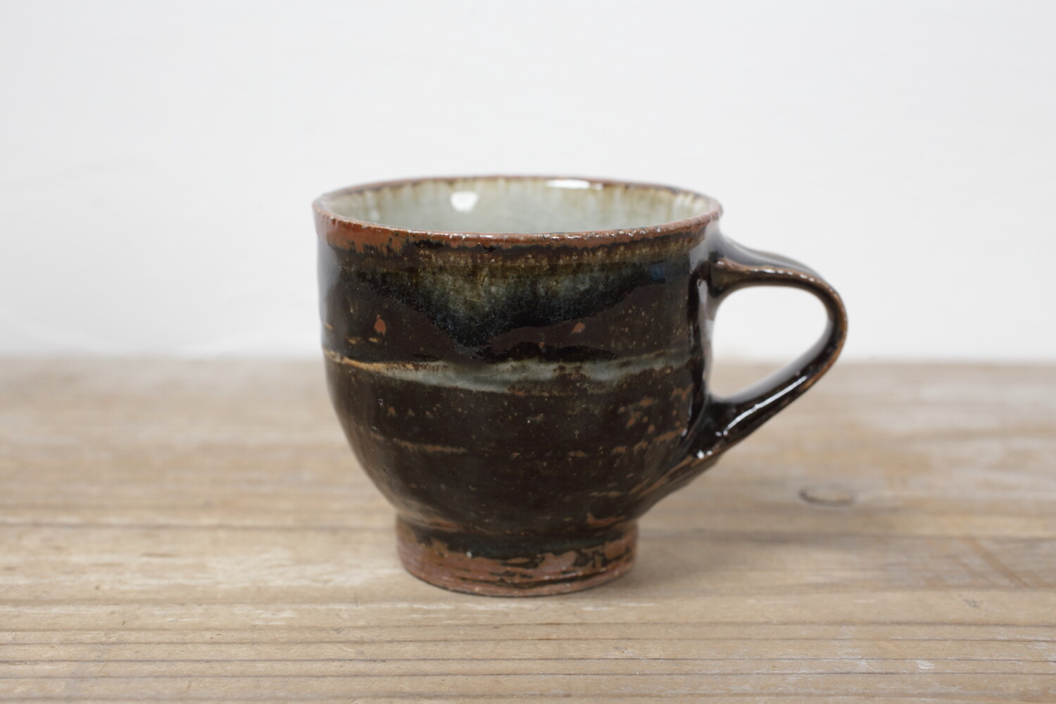 通常より少し強めに焼き上がったため、黒みが強く仕上がった呉須釉コーヒーカップ。カップの直径は約7.8cmほど、高さは7cmと昔ながらの大き過ぎないサイズ感のカップです。