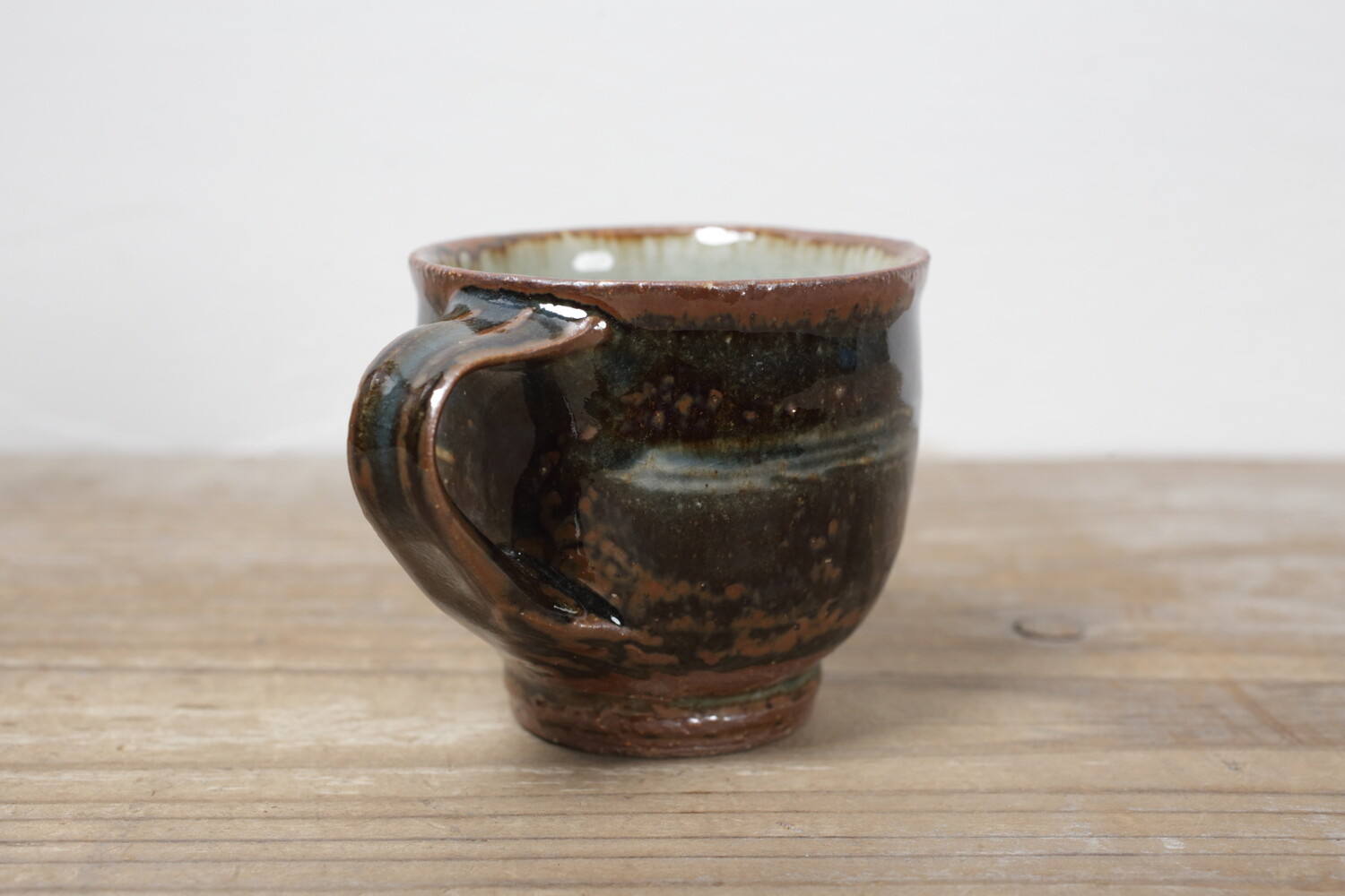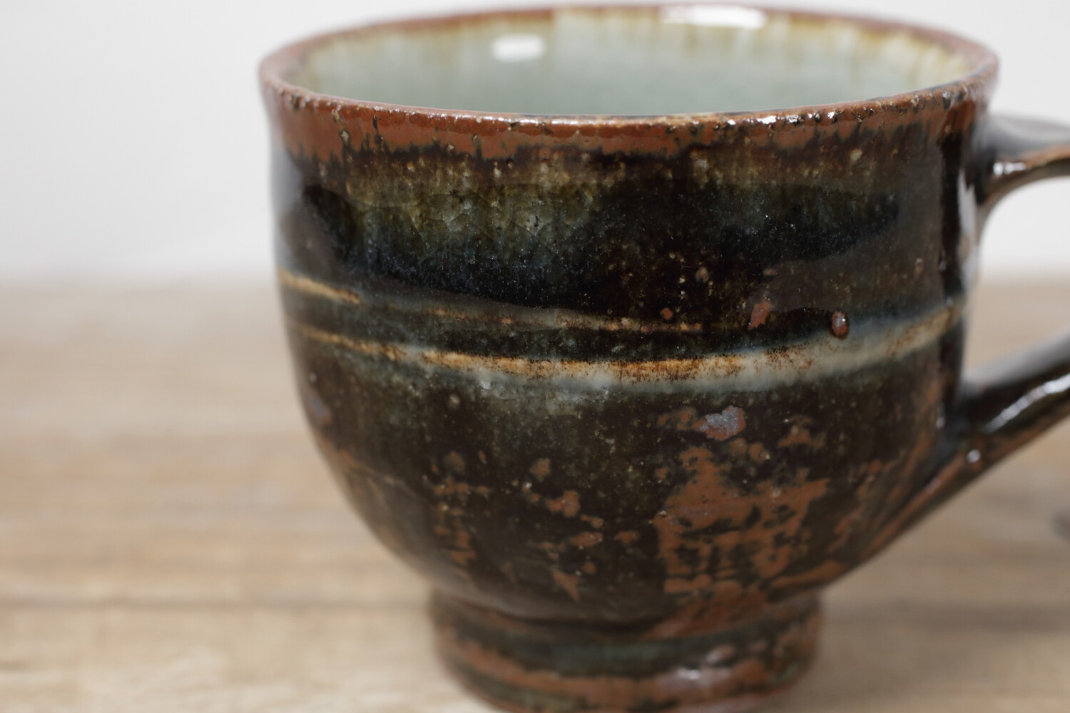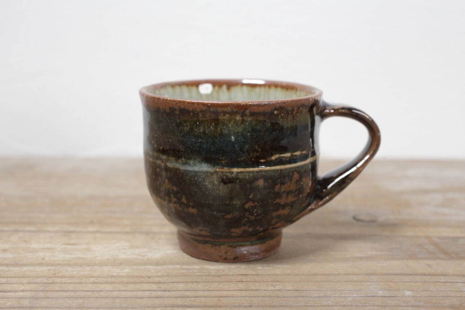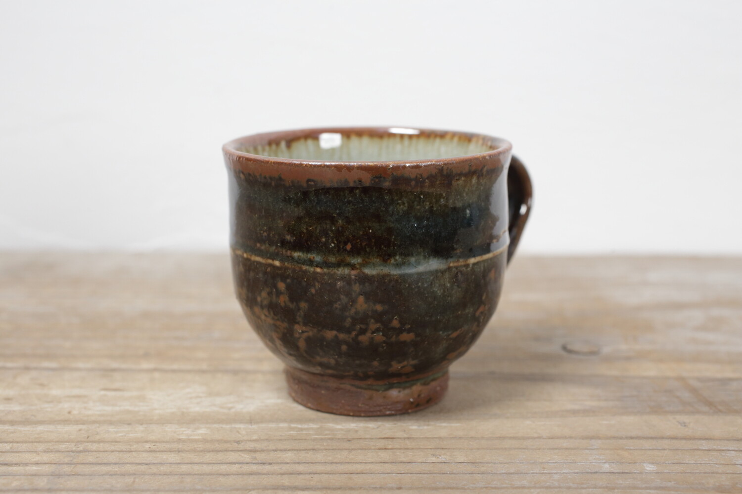 通常より少し強めに焼き上がったため、黒みが強く仕上がった呉須釉コーヒーカップ。カップの直径は約7.8cmほど、高さは7cmと昔ながらの大き過ぎないサイズ感のカップです。