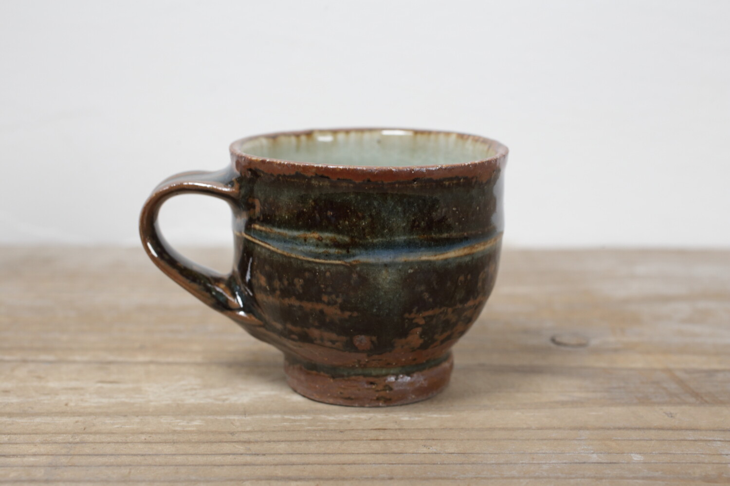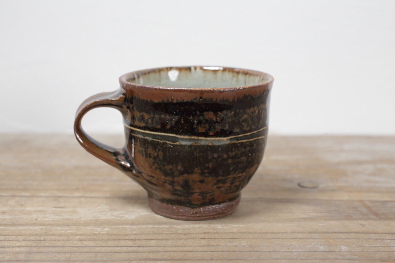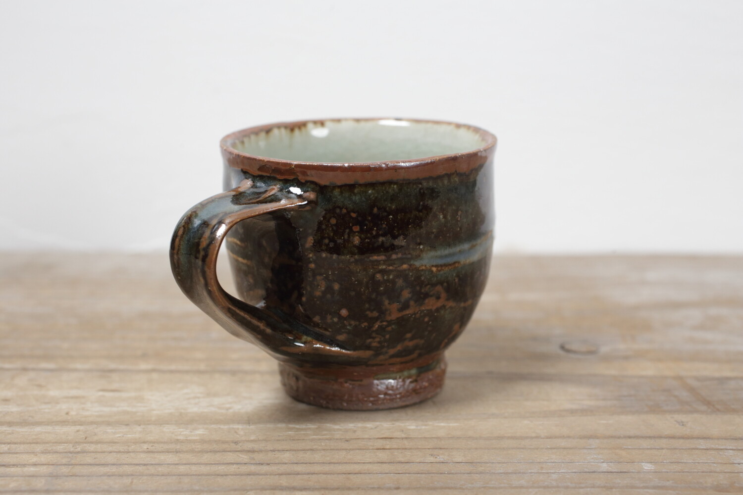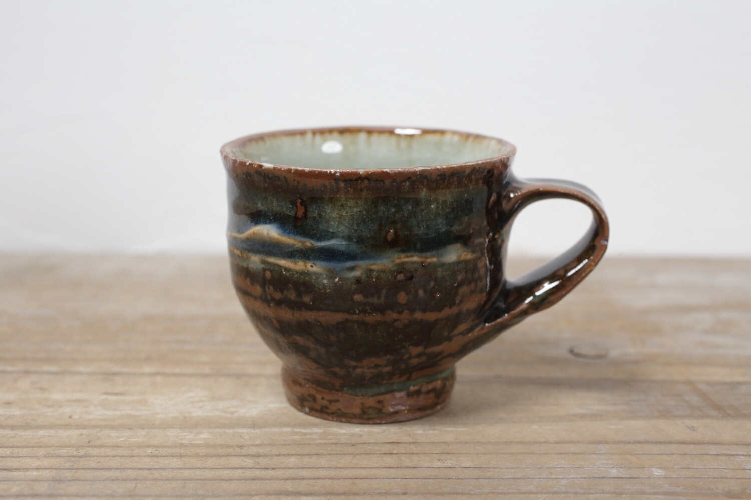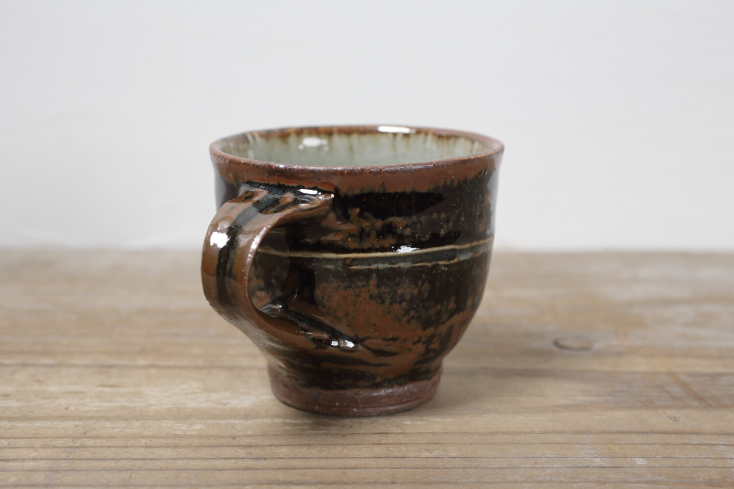 通常より少し強めに焼き上がったため、黒みが強く仕上がった呉須釉コーヒーカップ。カップの直径は約7.8cmほど、高さは7cmと昔ながらの大き過ぎないサイズ感のカップです。