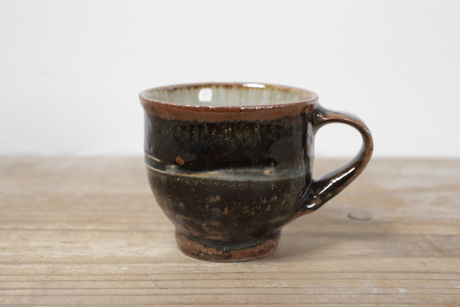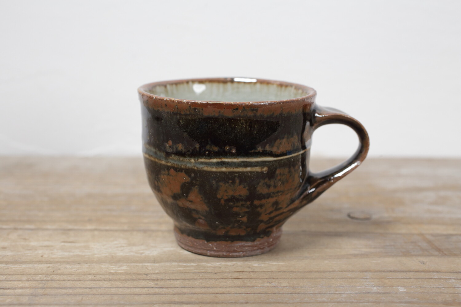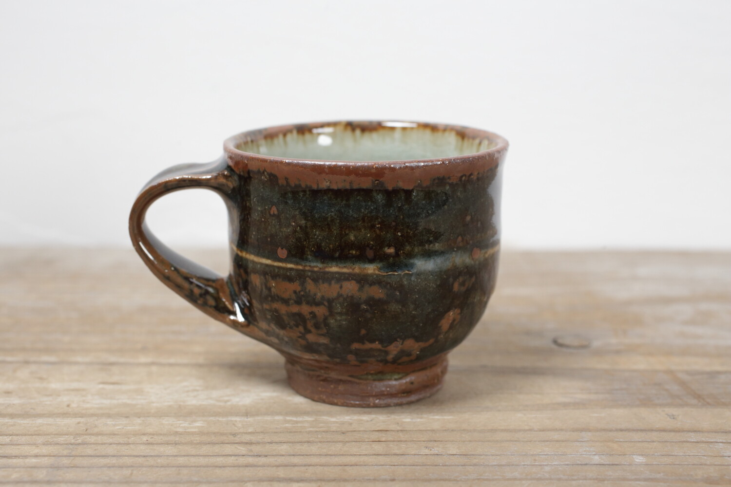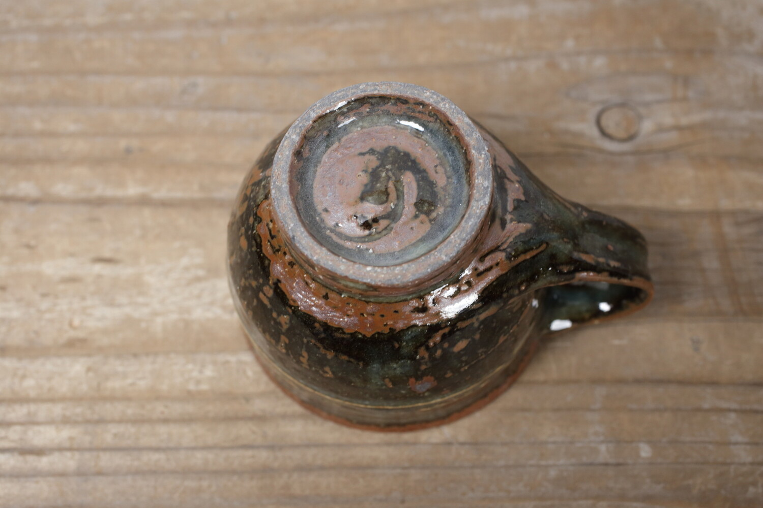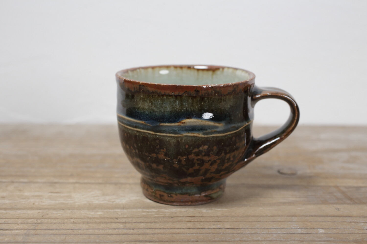 通常より少し強めに焼き上がったため、黒みが強く仕上がった呉須釉コーヒーカップ。カップの直径は約7.8cmほど、高さは7cmと昔ながらの大き過ぎないサイズ感のカップです。