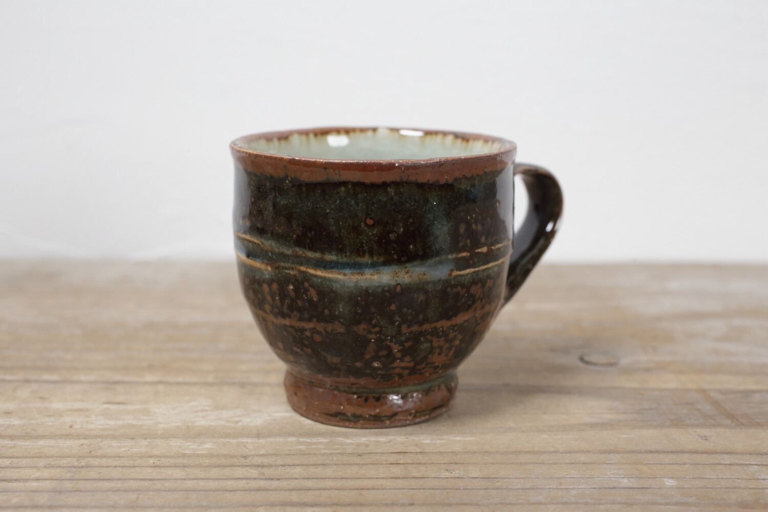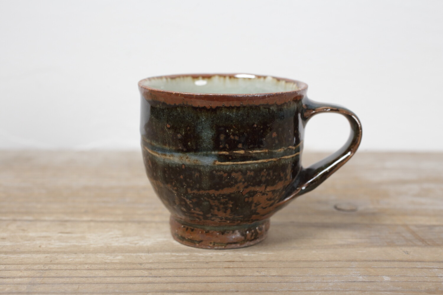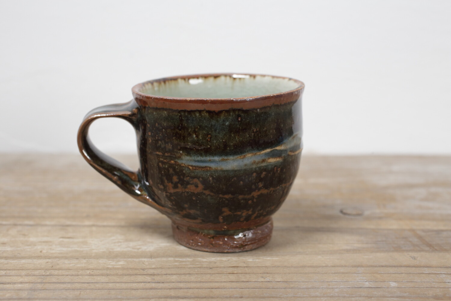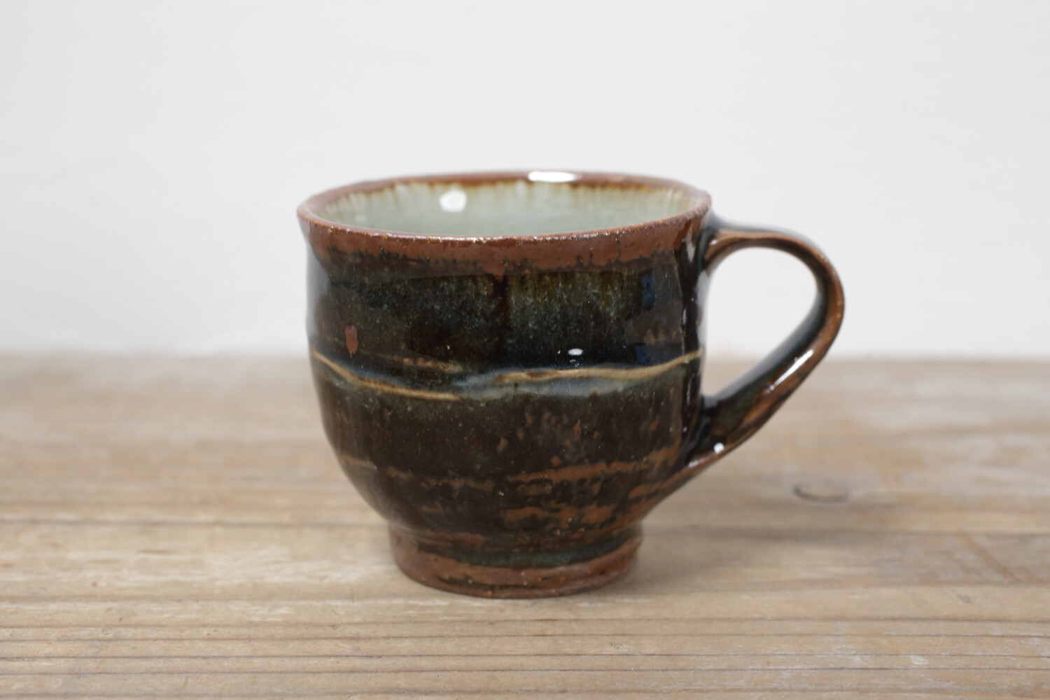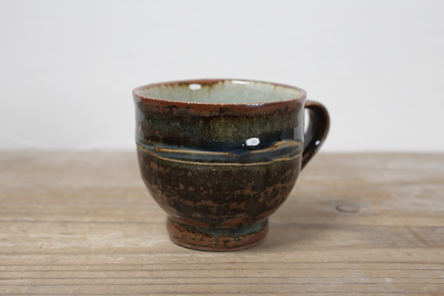 通常より少し強めに焼き上がったため、黒みが強く仕上がった呉須釉コーヒーカップ。カップの直径は約7.8cmほど、高さは7cmと昔ながらの大き過ぎないサイズ感のカップです。