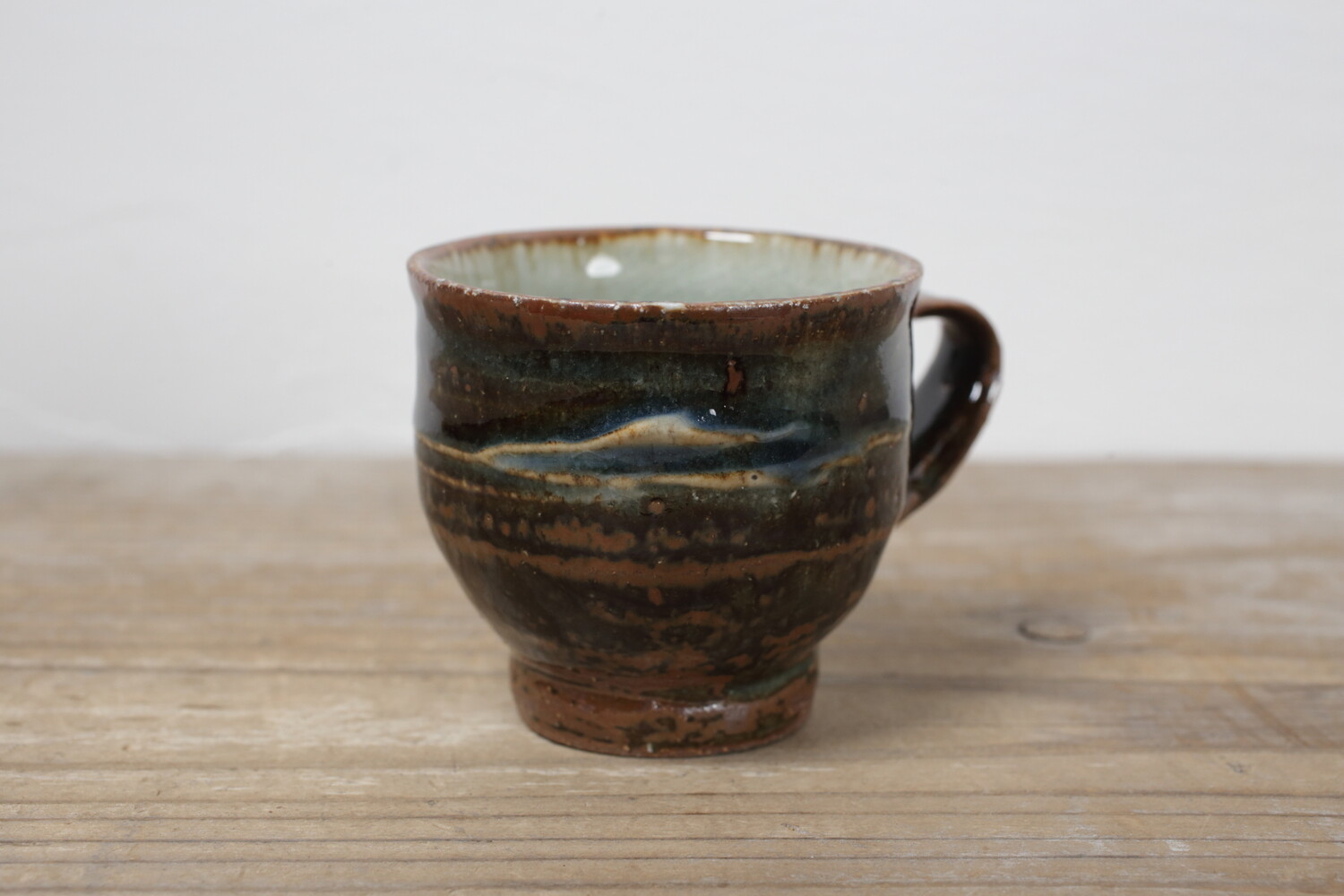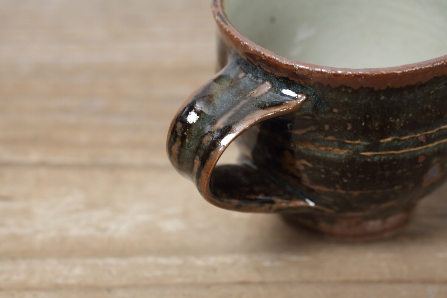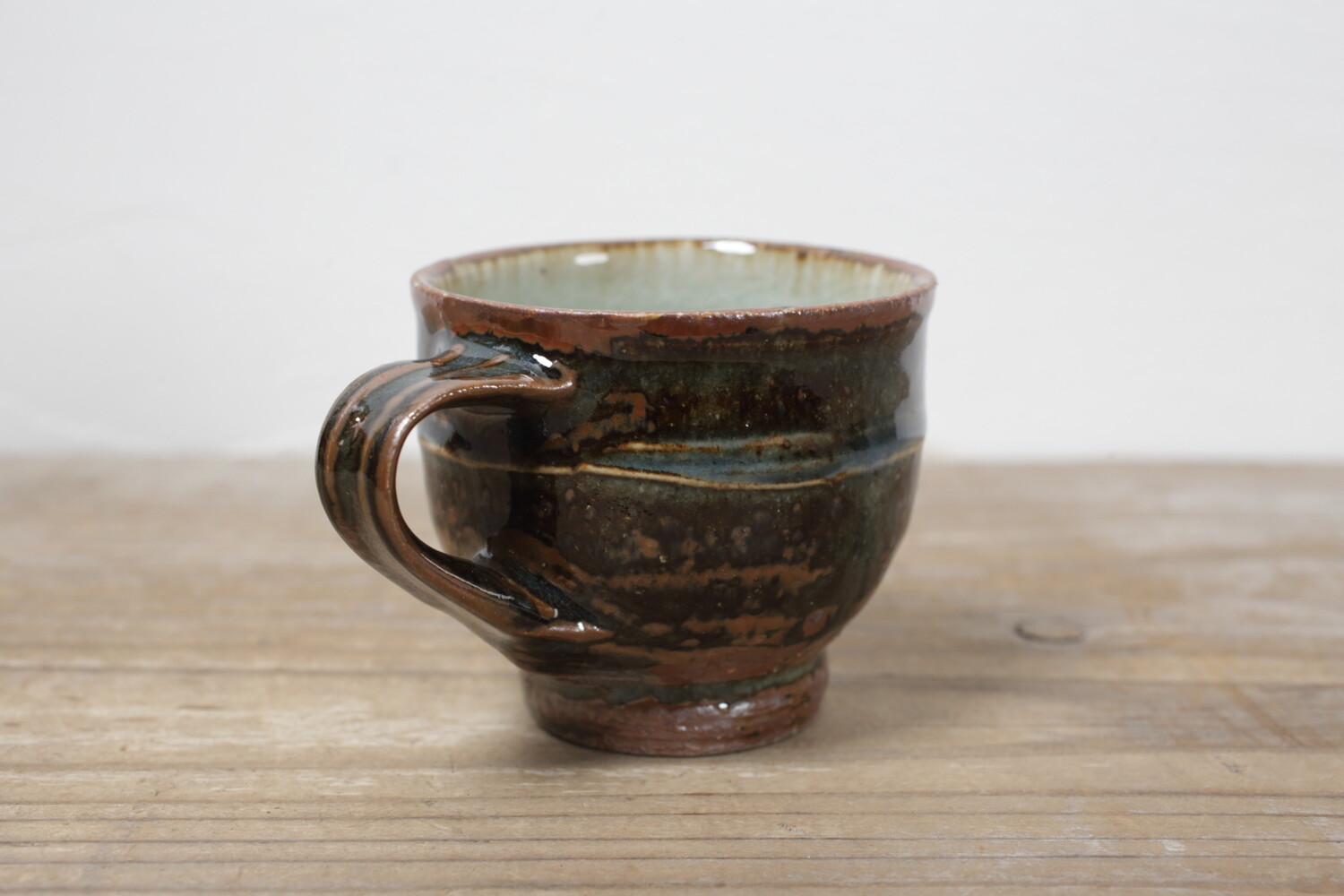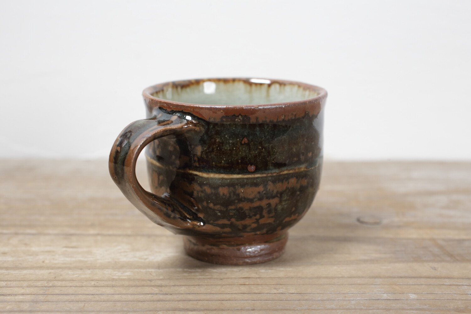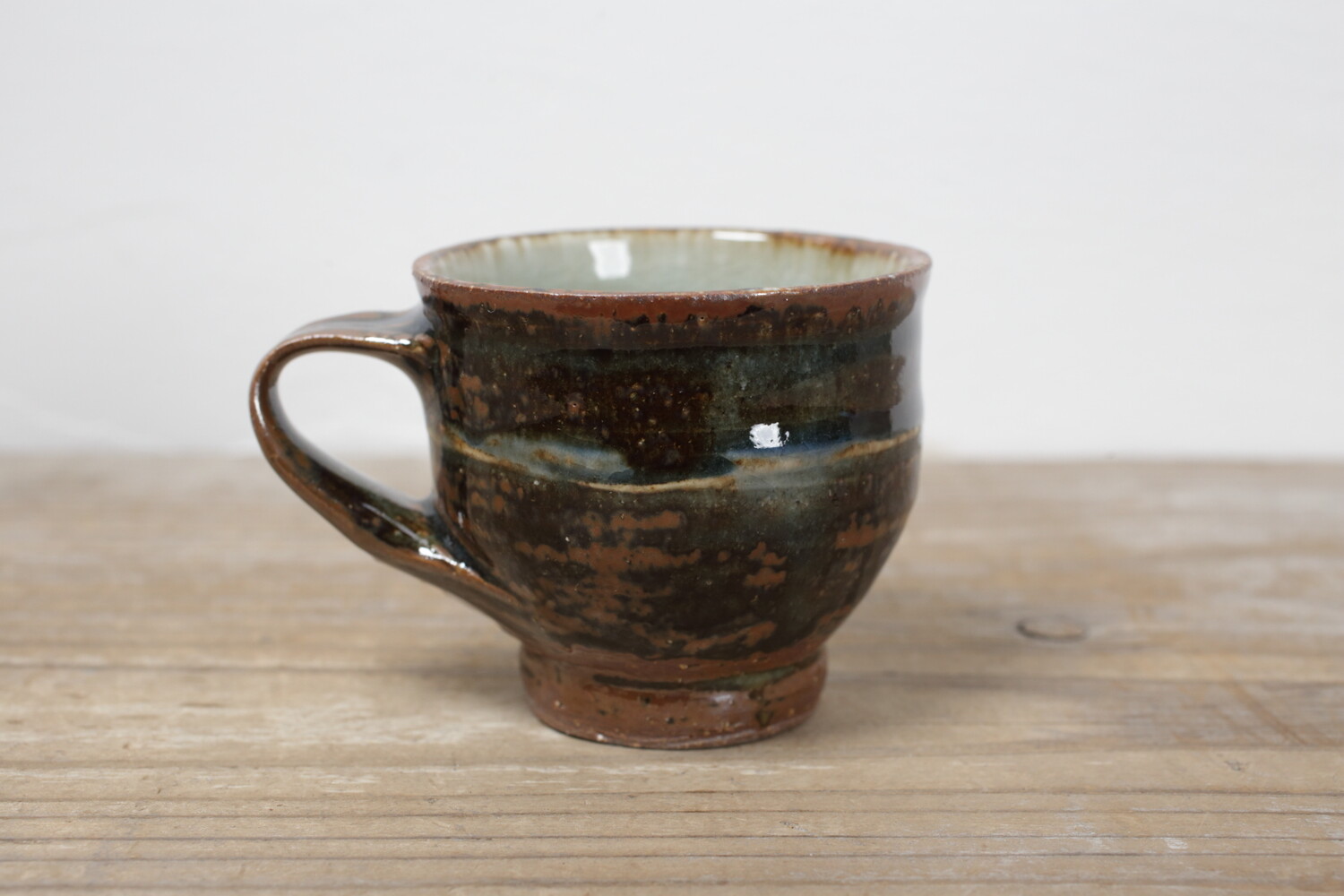 通常より少し強めに焼き上がったため、黒みが強く仕上がった呉須釉コーヒーカップ。カップの直径は約7.8cmほど、高さは7cmと昔ながらの大き過ぎないサイズ感のカップです。