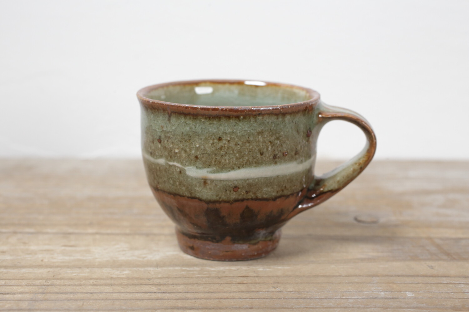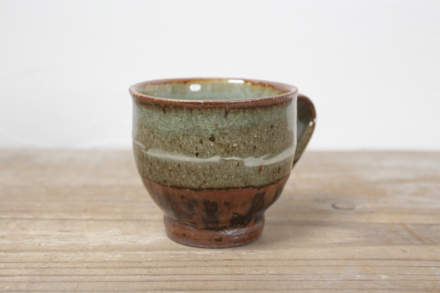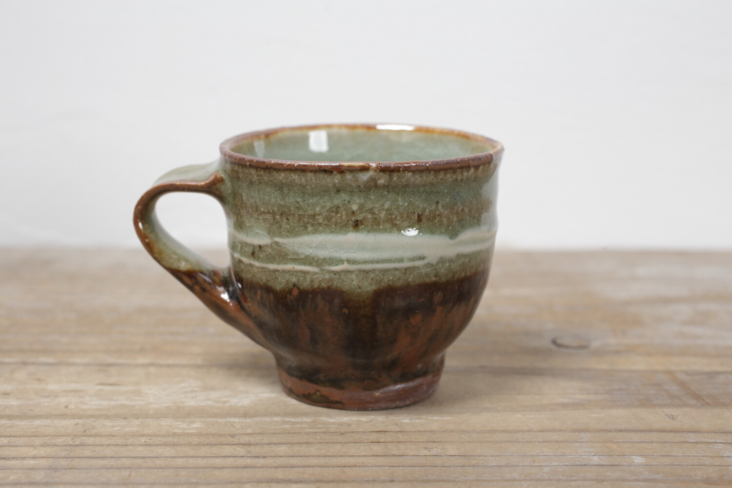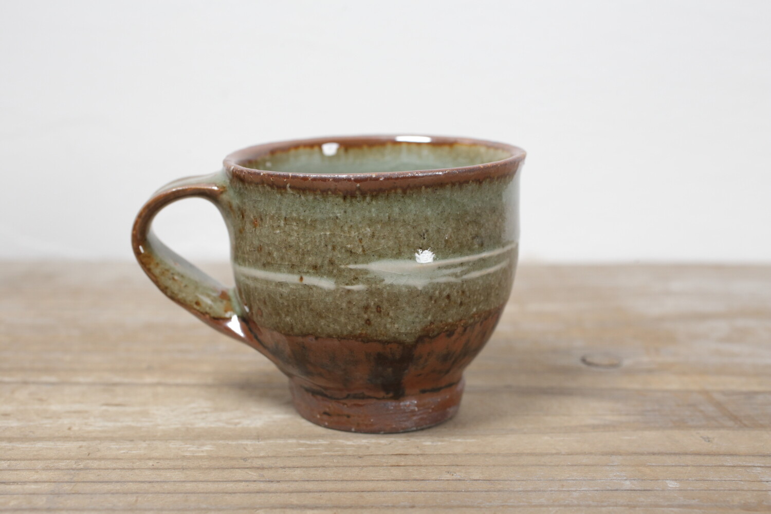 森山窯では並釉と呼ばれる灰釉のコーヒーカップ。上品で知的なカーキ色といった色合いです。大きさは直径7.8cmほど、高さ7cmと昔ながらの大き過ぎないカップサイズです。
