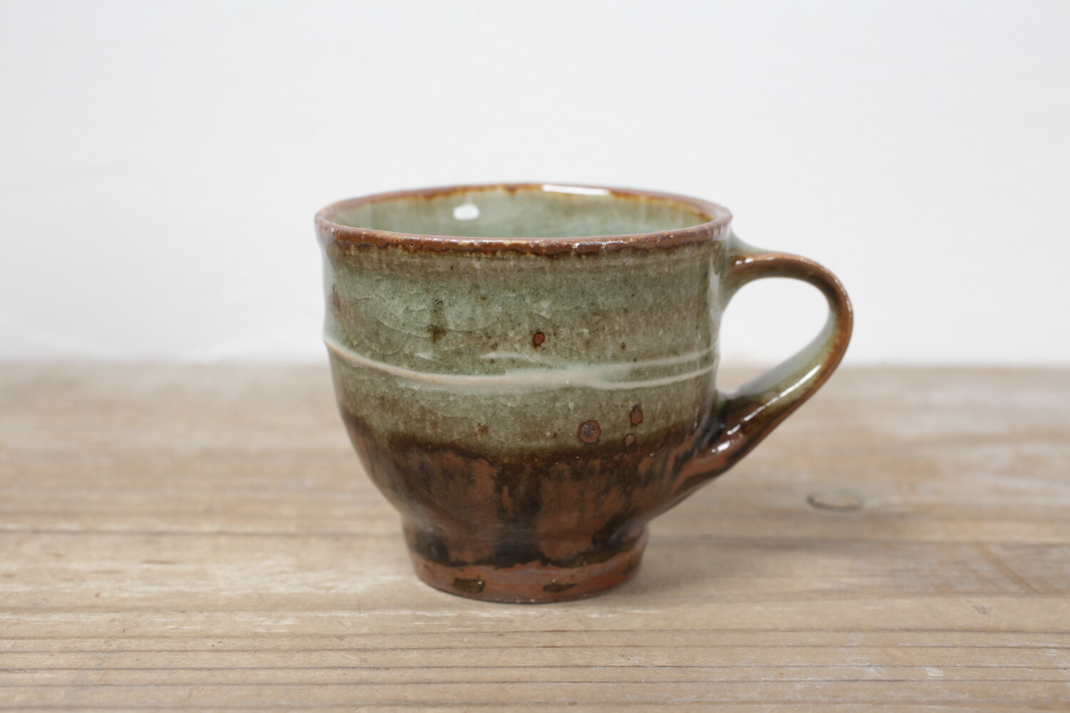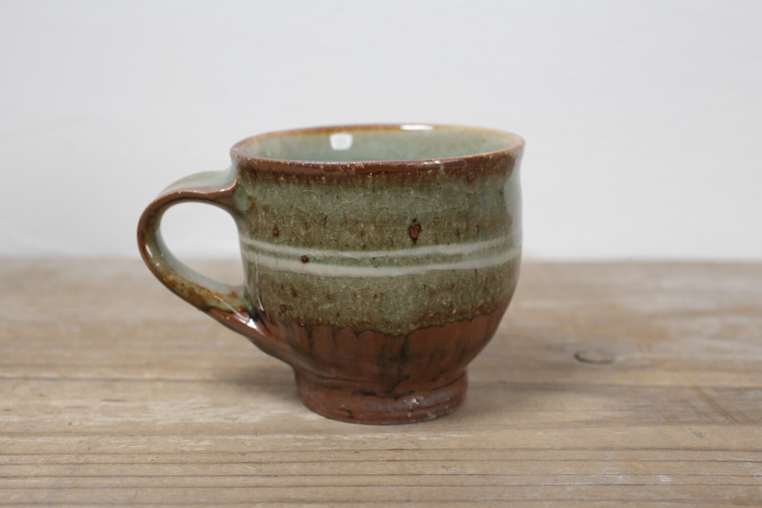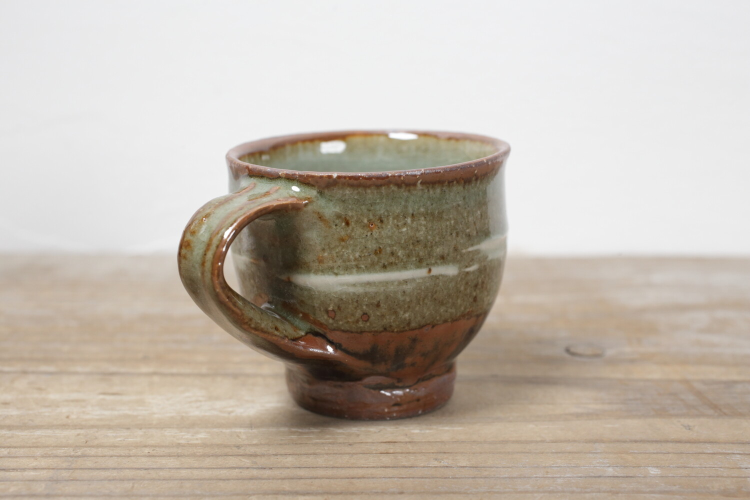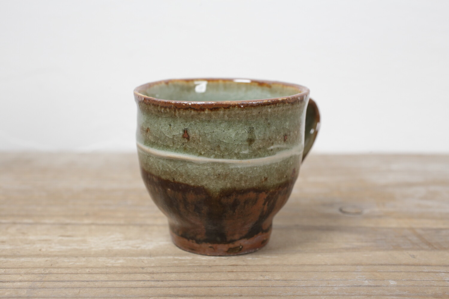 森山窯では並釉と呼ばれる灰釉のコーヒーカップ。上品で知的なカーキ色といった色合いです。大きさは直径7.8cmほど、高さ7cmと昔ながらの大き過ぎないカップサイズです。