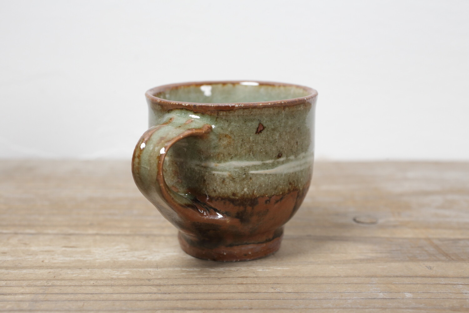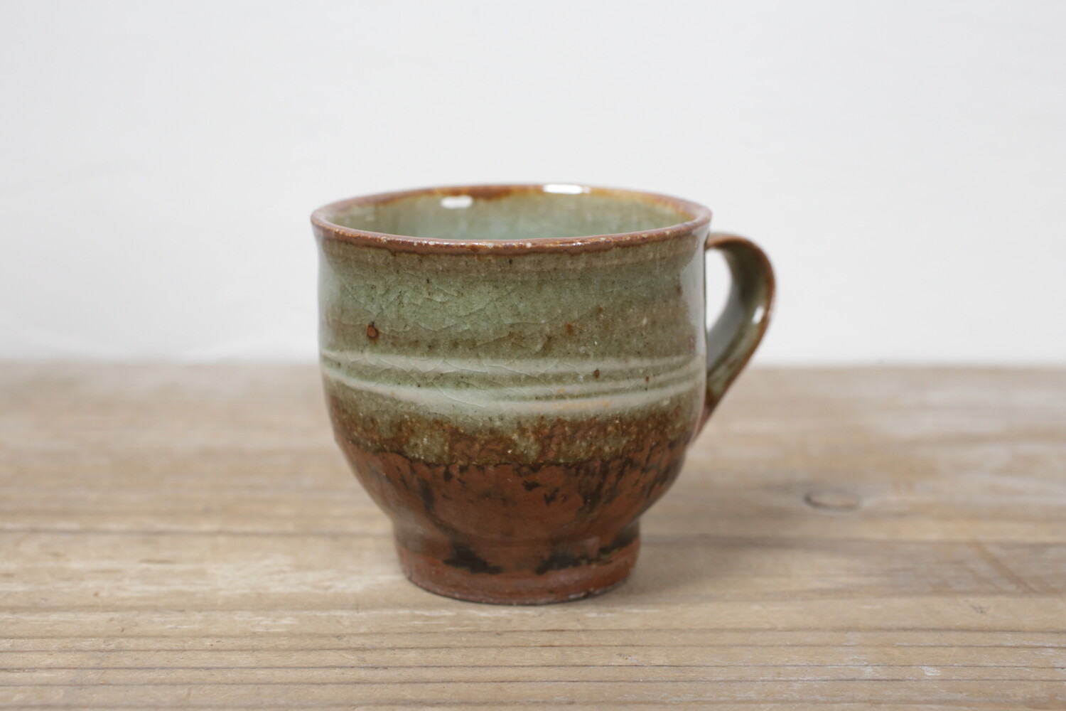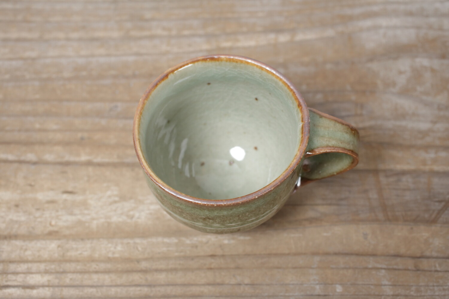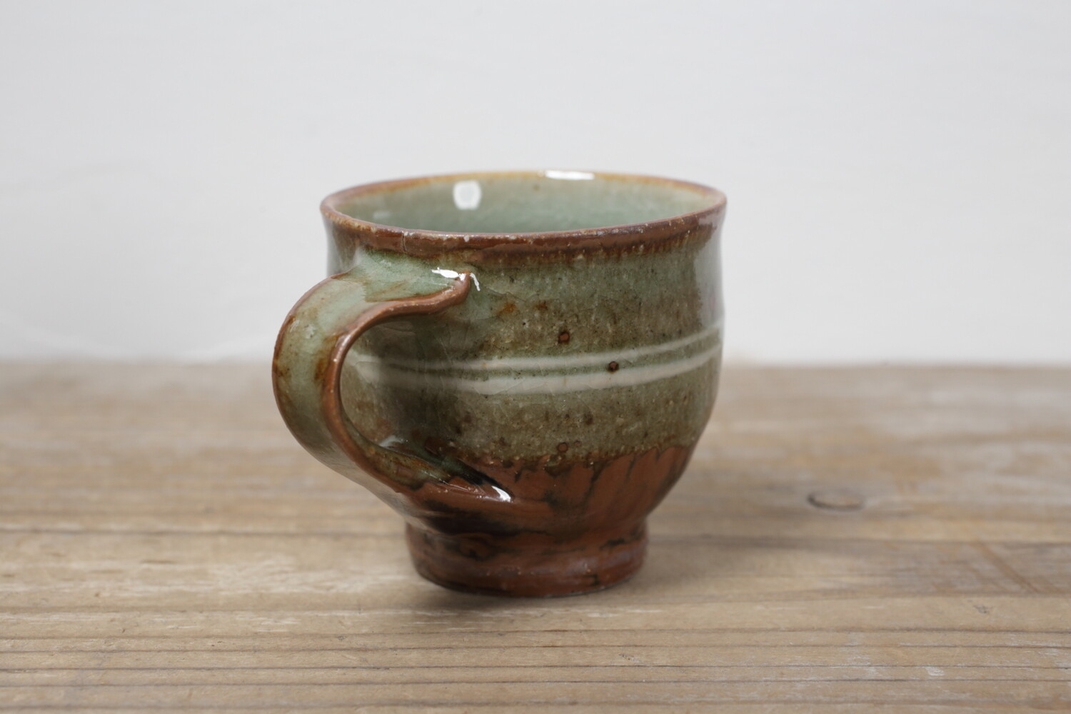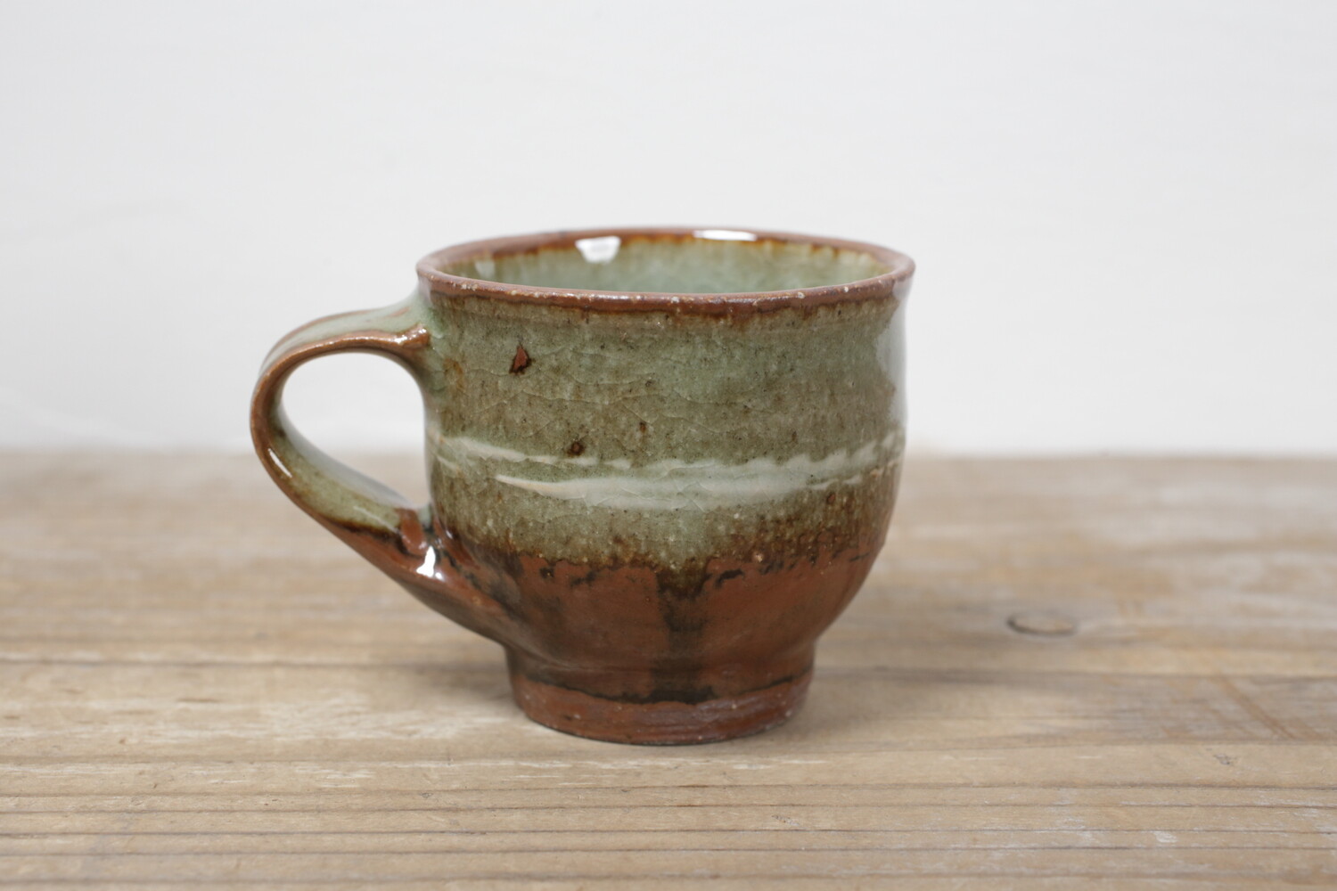 森山窯では並釉と呼ばれる灰釉のコーヒーカップ。上品で知的なカーキ色といった色合いです。大きさは直径7.8cmほど、高さ7cmと昔ながらの大き過ぎないカップサイズです。