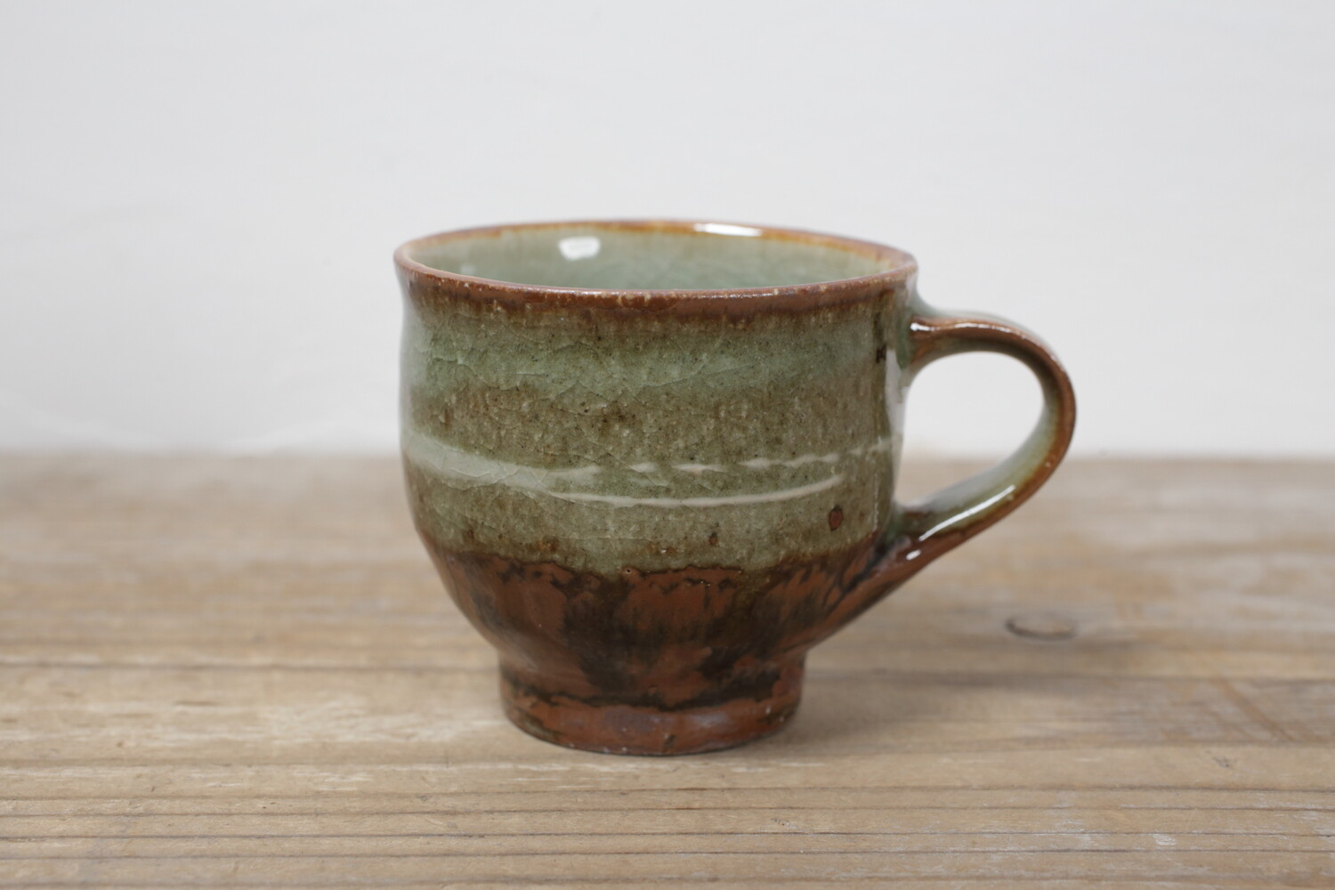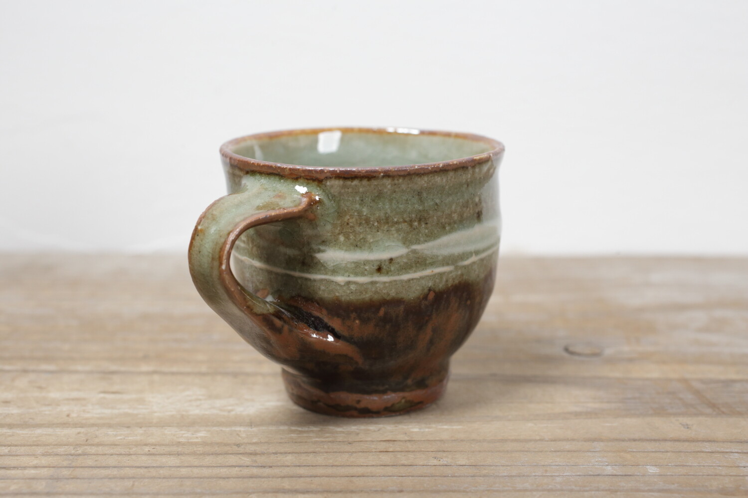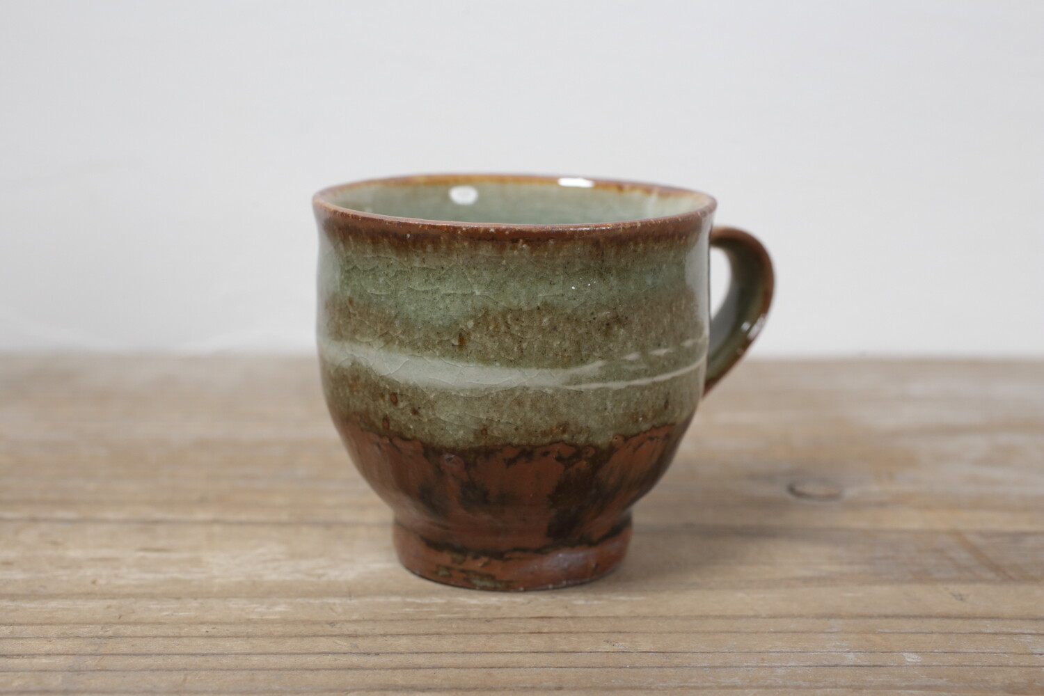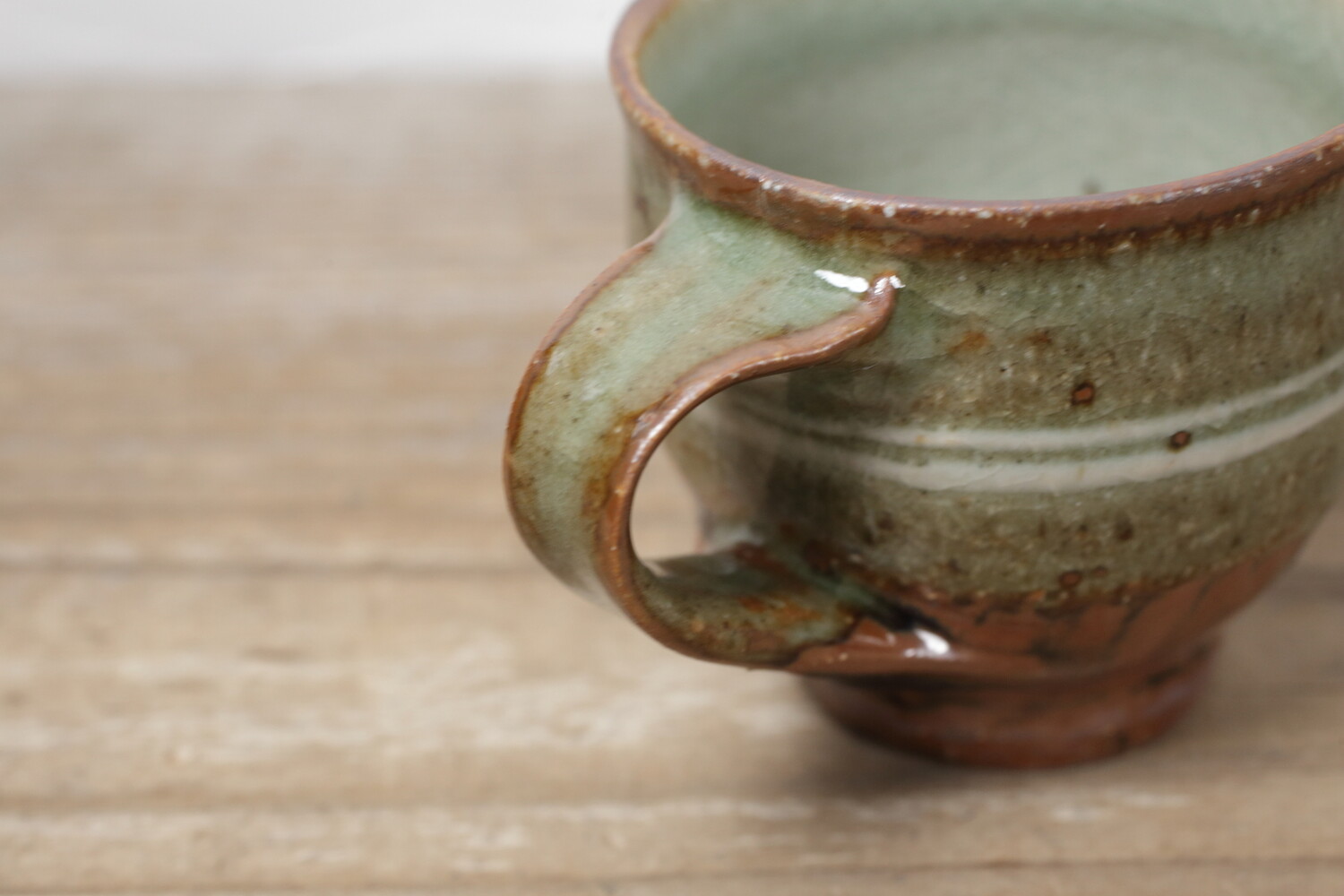 森山窯では並釉と呼ばれる灰釉のコーヒーカップ。上品で知的なカーキ色といった色合いです。大きさは直径7.8cmほど、高さ7cmと昔ながらの大き過ぎないカップサイズです。