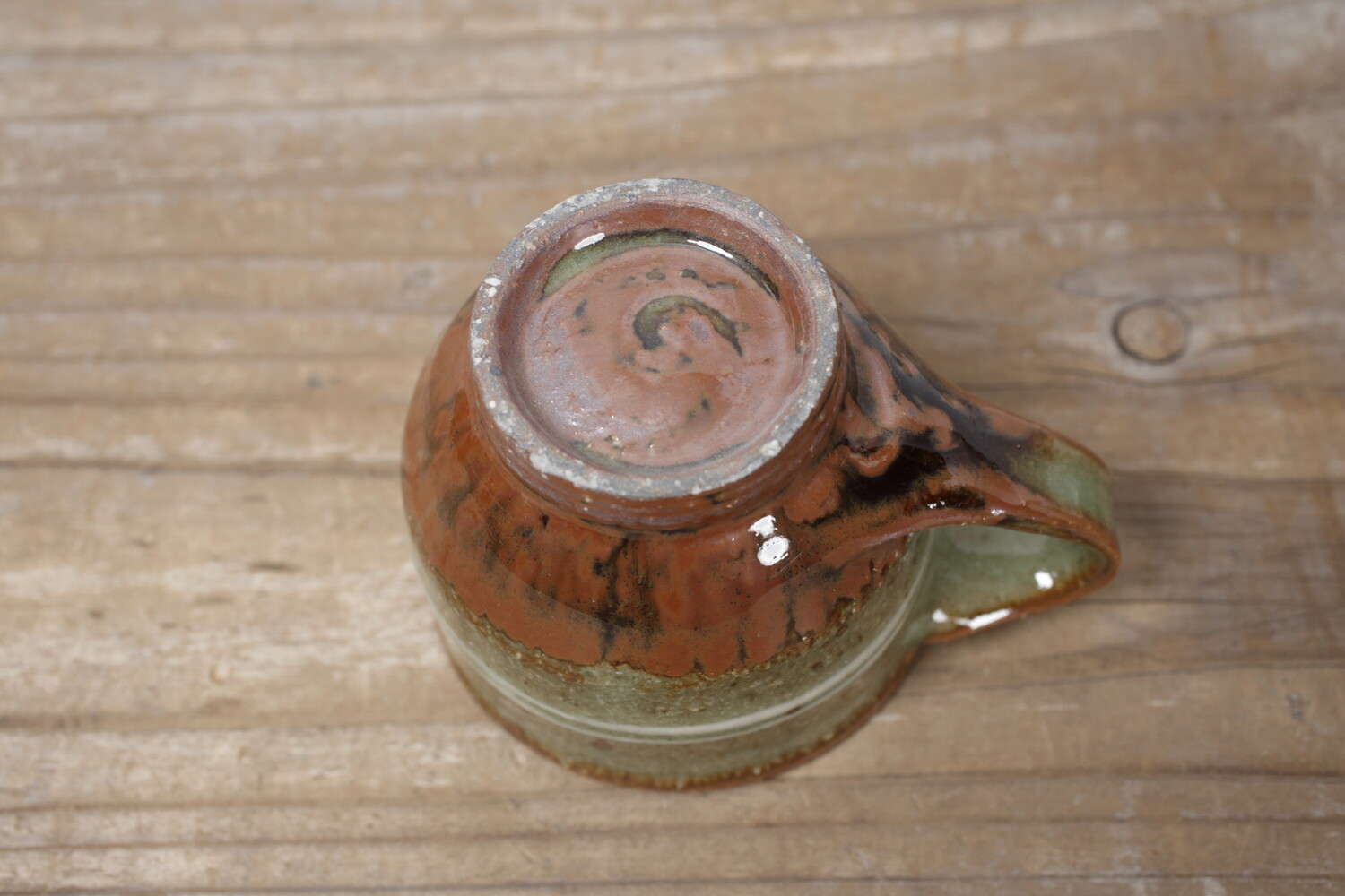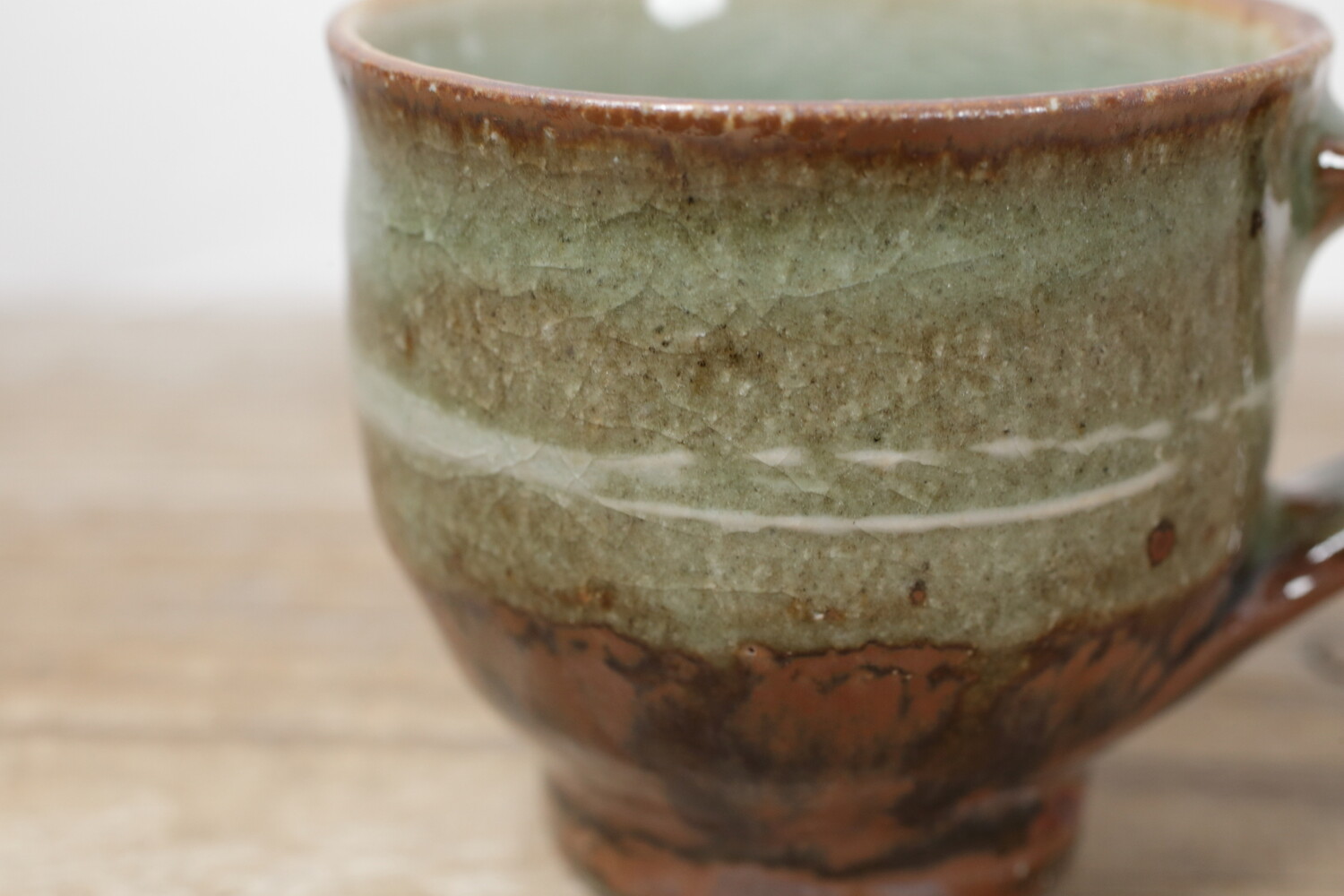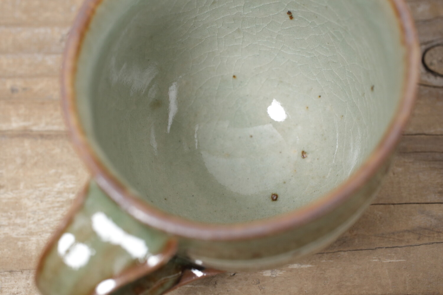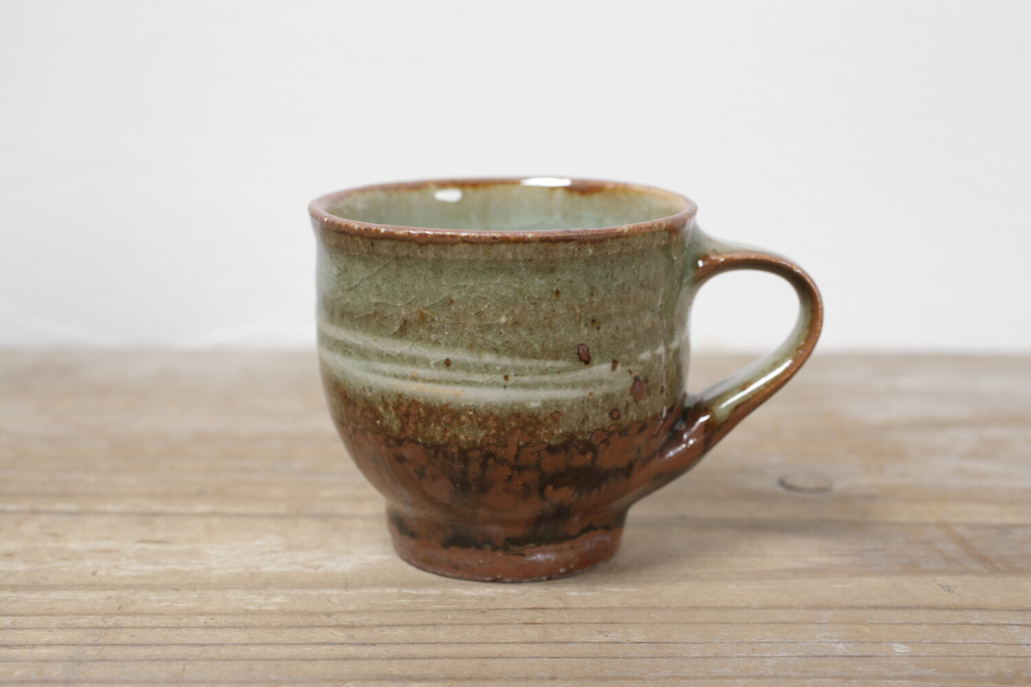森山窯では並釉と呼ばれる灰釉のコーヒーカップ。上品で知的なカーキ色といった色合いです。大きさは直径7.8cmほど、高さ7cmと昔ながらの大き過ぎないカップサイズです。