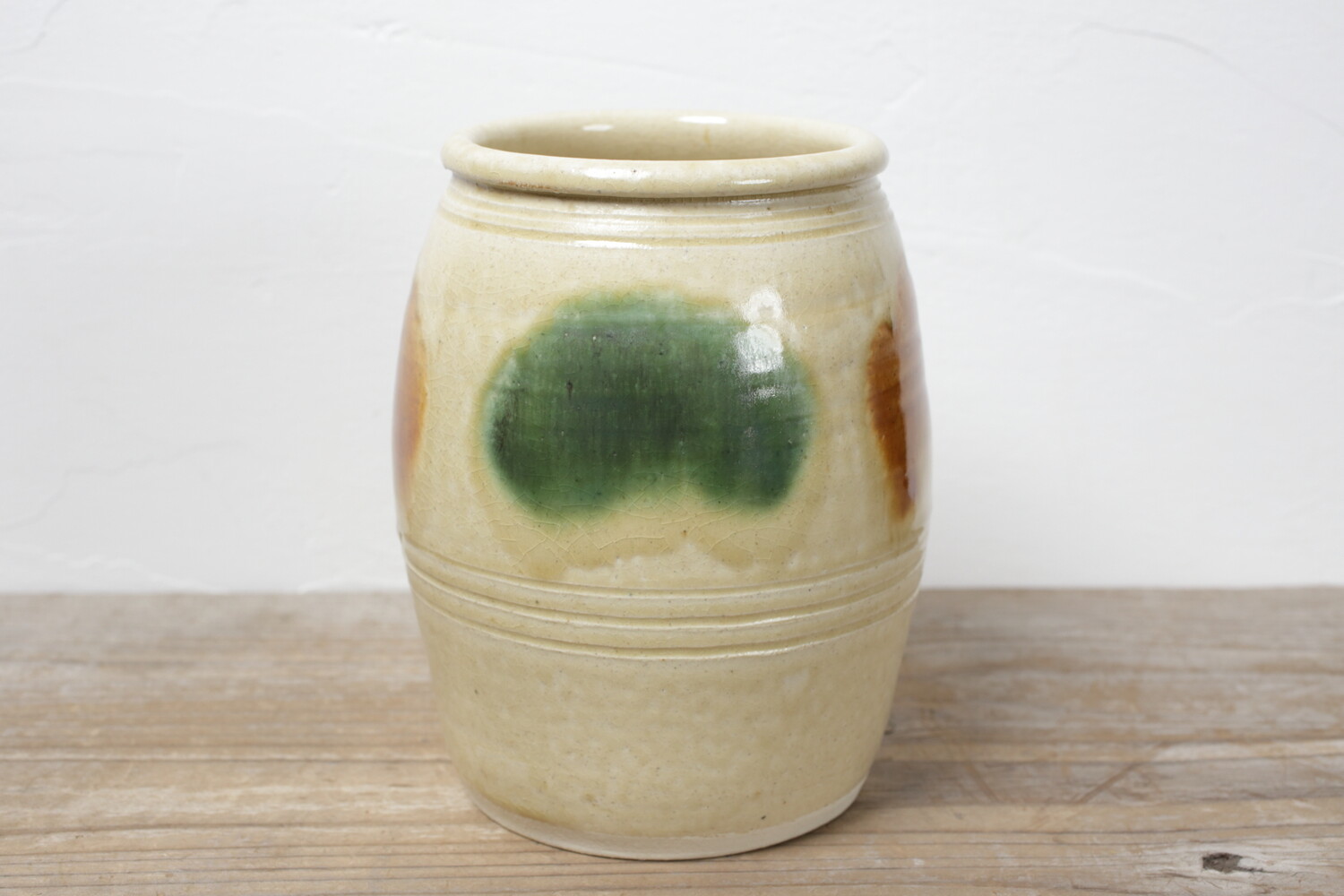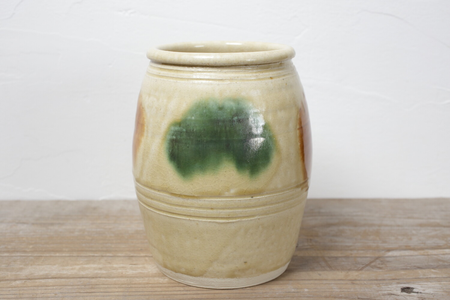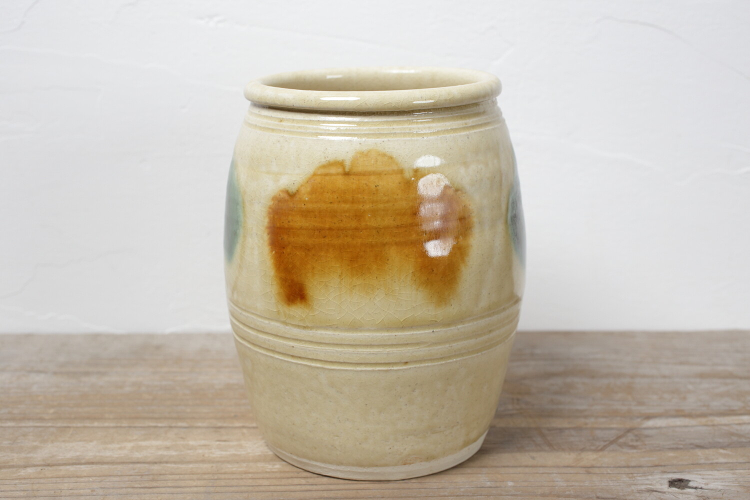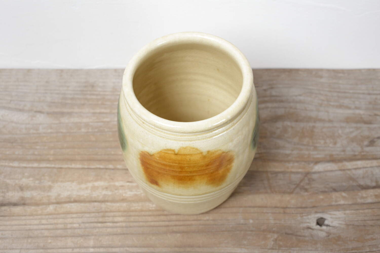 黄瀬戸にどこかポエティックで軽やかに二彩が描かれた美しいヘラ立て。高さは18cmほどで木べらや菜箸、すりこぎなど調理道具を入れてキッチンの目に入るところに置いても印象的ですし、切り花やハーブなどをどさっと生けても美しいでしょう。