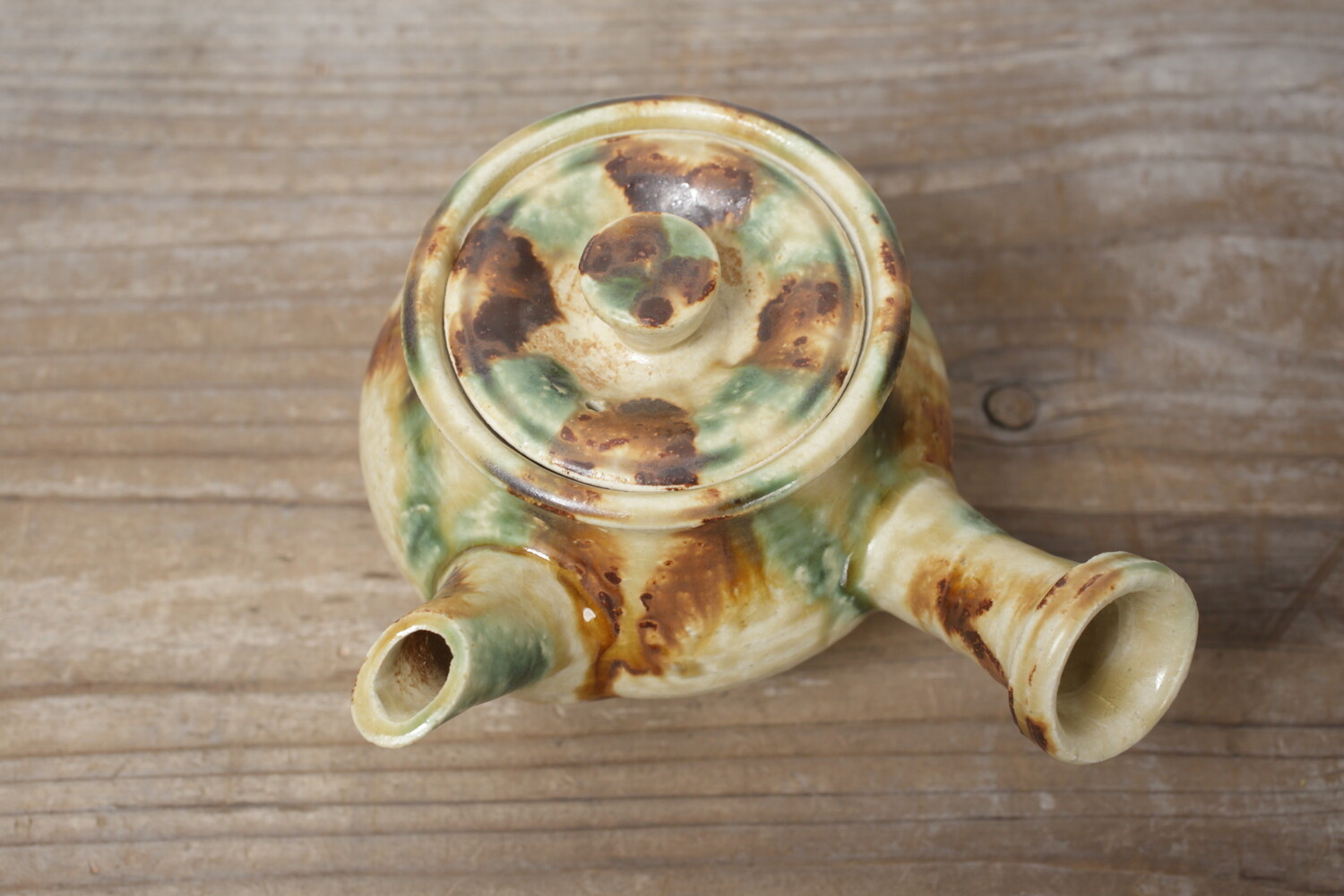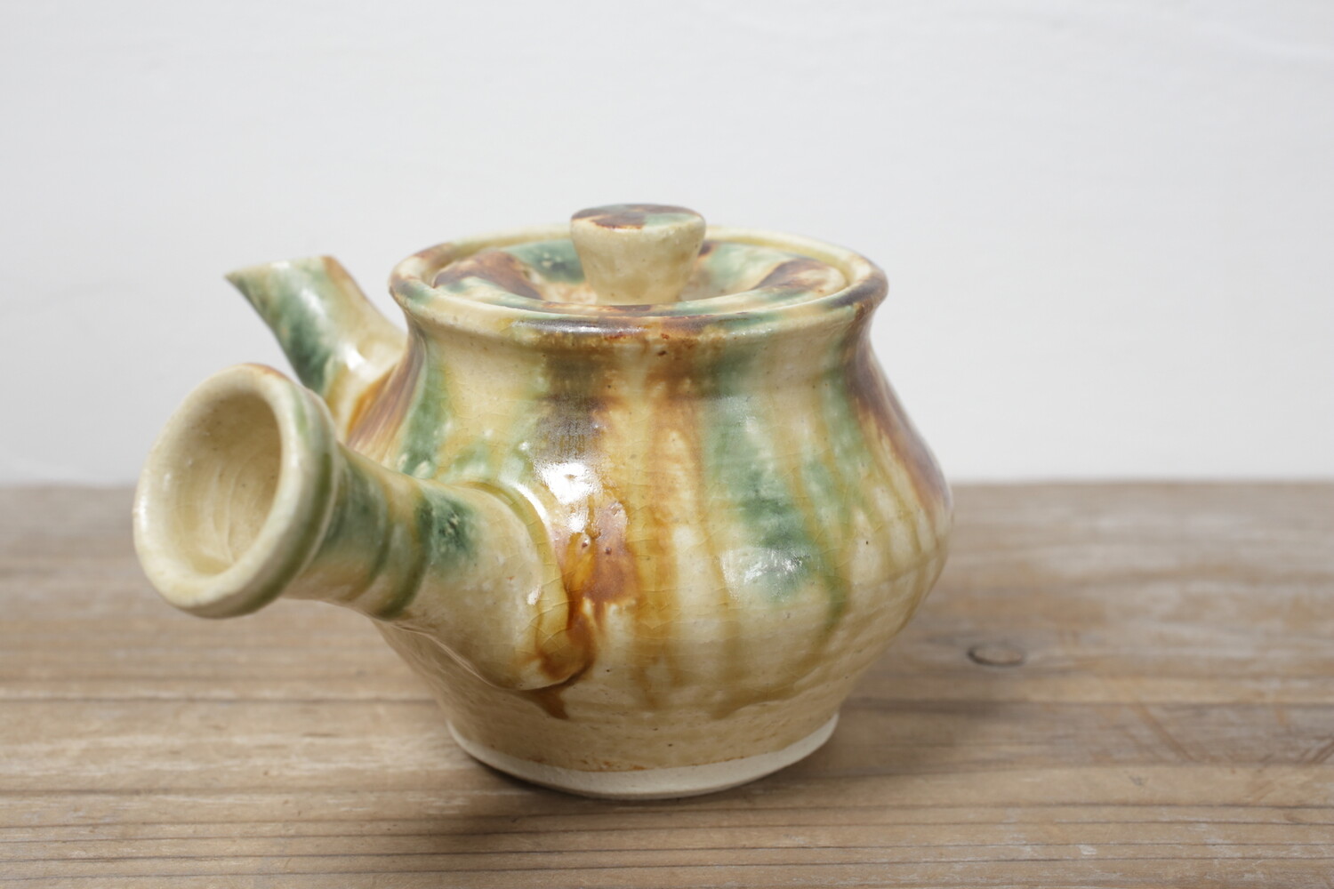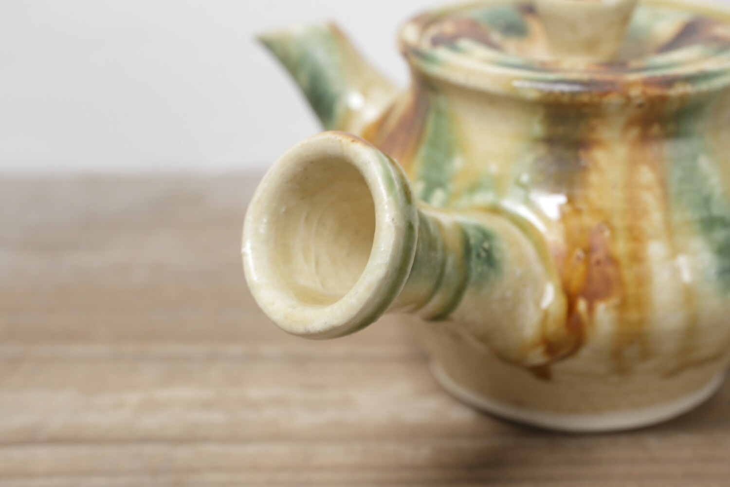 黄瀬戸に三彩が打ち掛けられた、瀬戸の白い土にとても映えるお急須。毎日のご家族使いにいい大きさです。