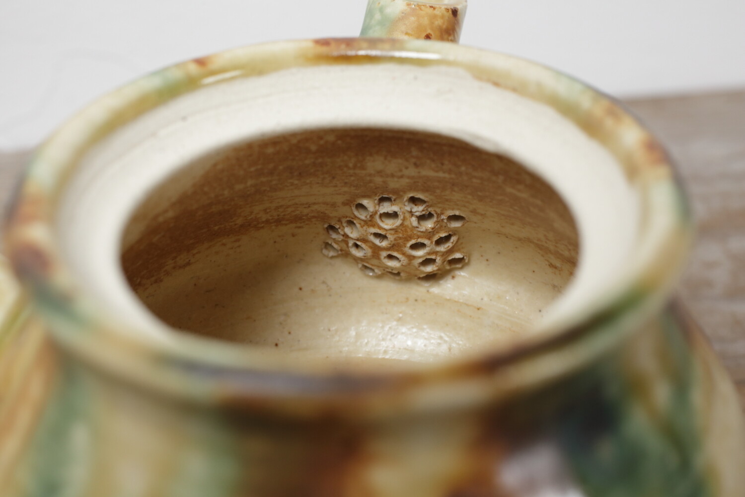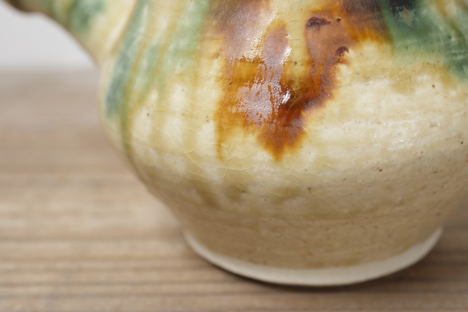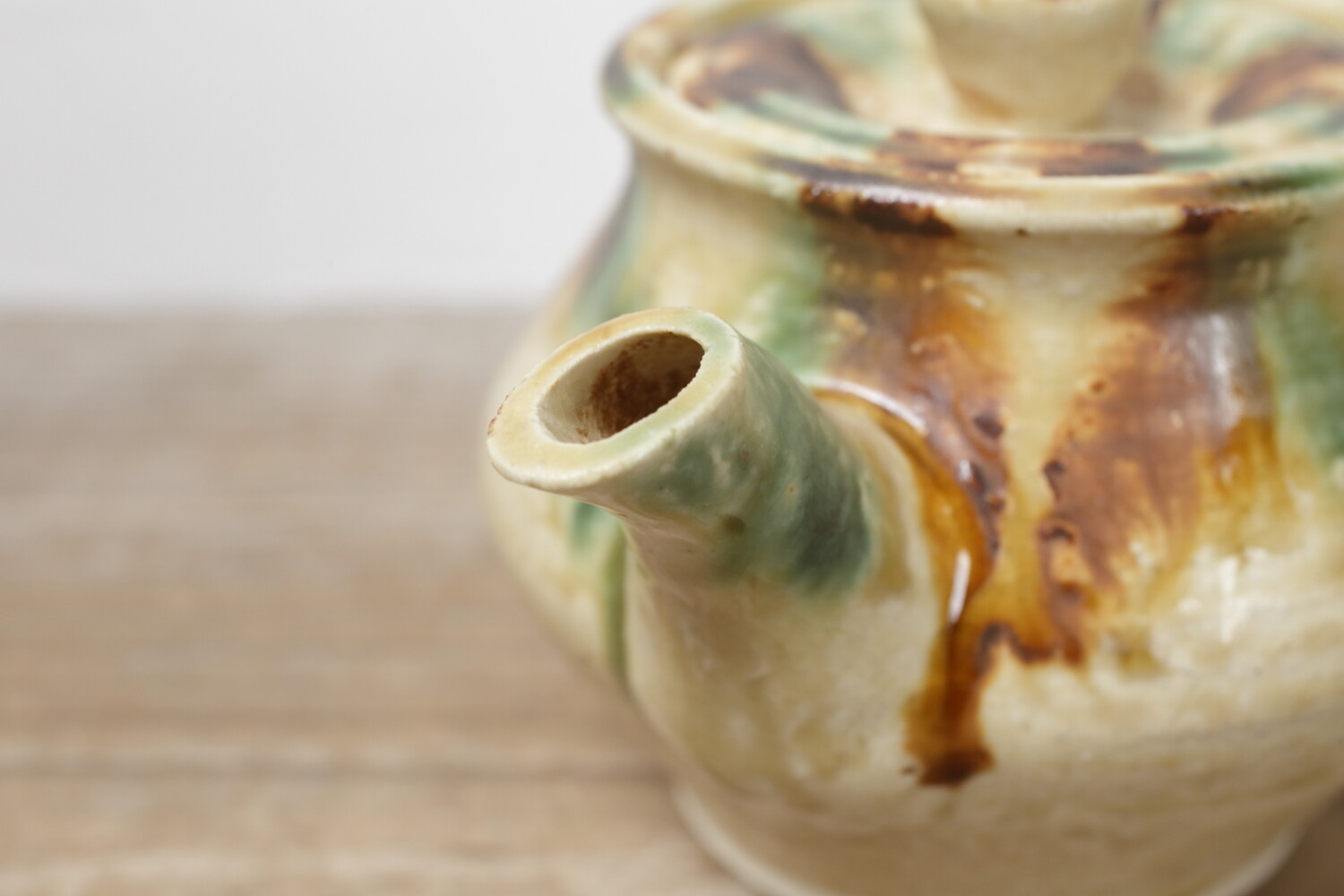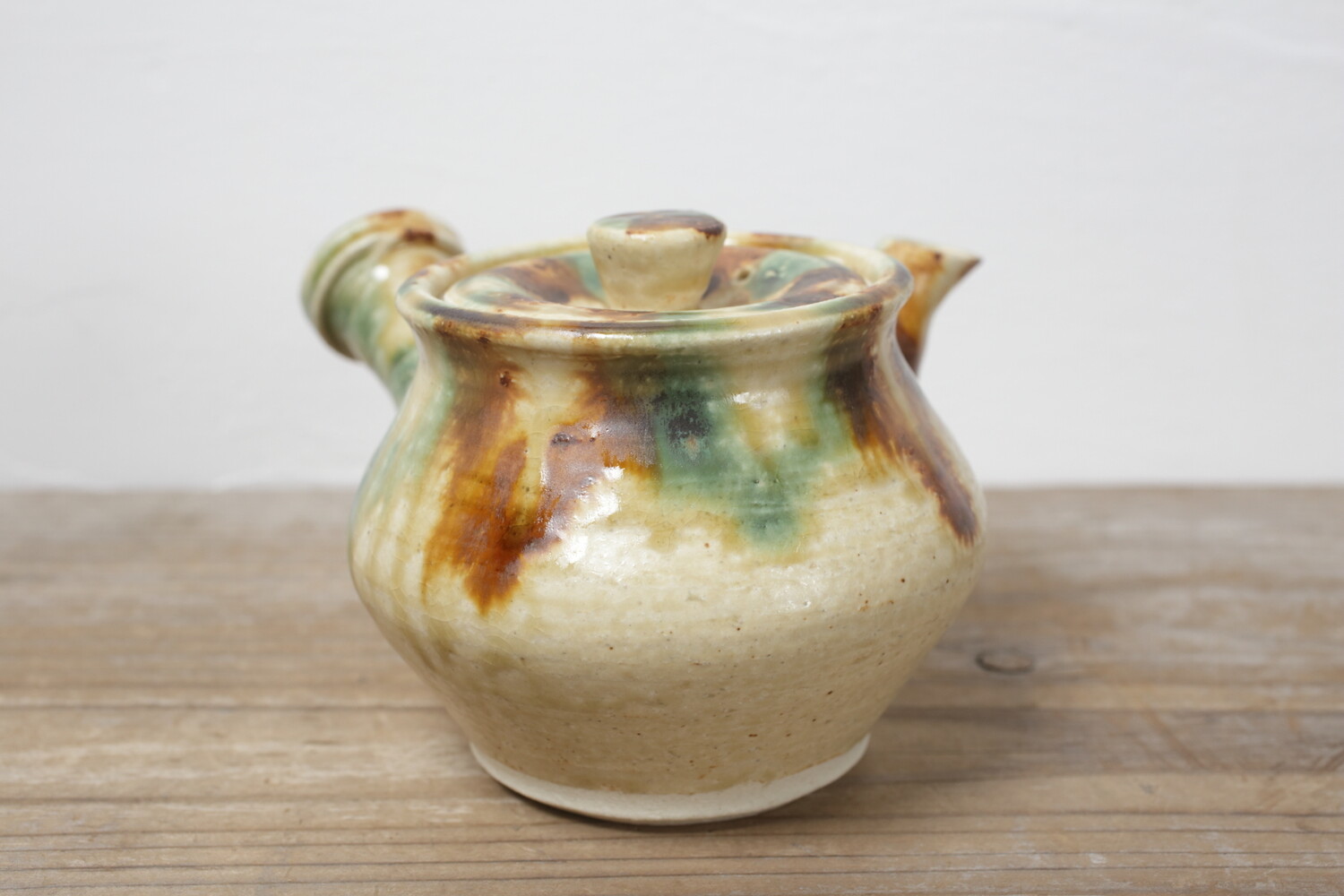 黄瀬戸に三彩が打ち掛けられた、瀬戸の白い土にとても映えるお急須。毎日のご家族使いにいい大きさです。