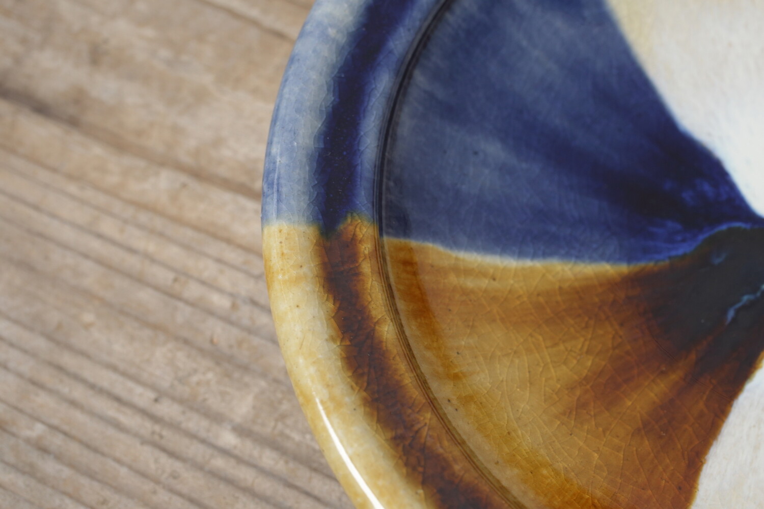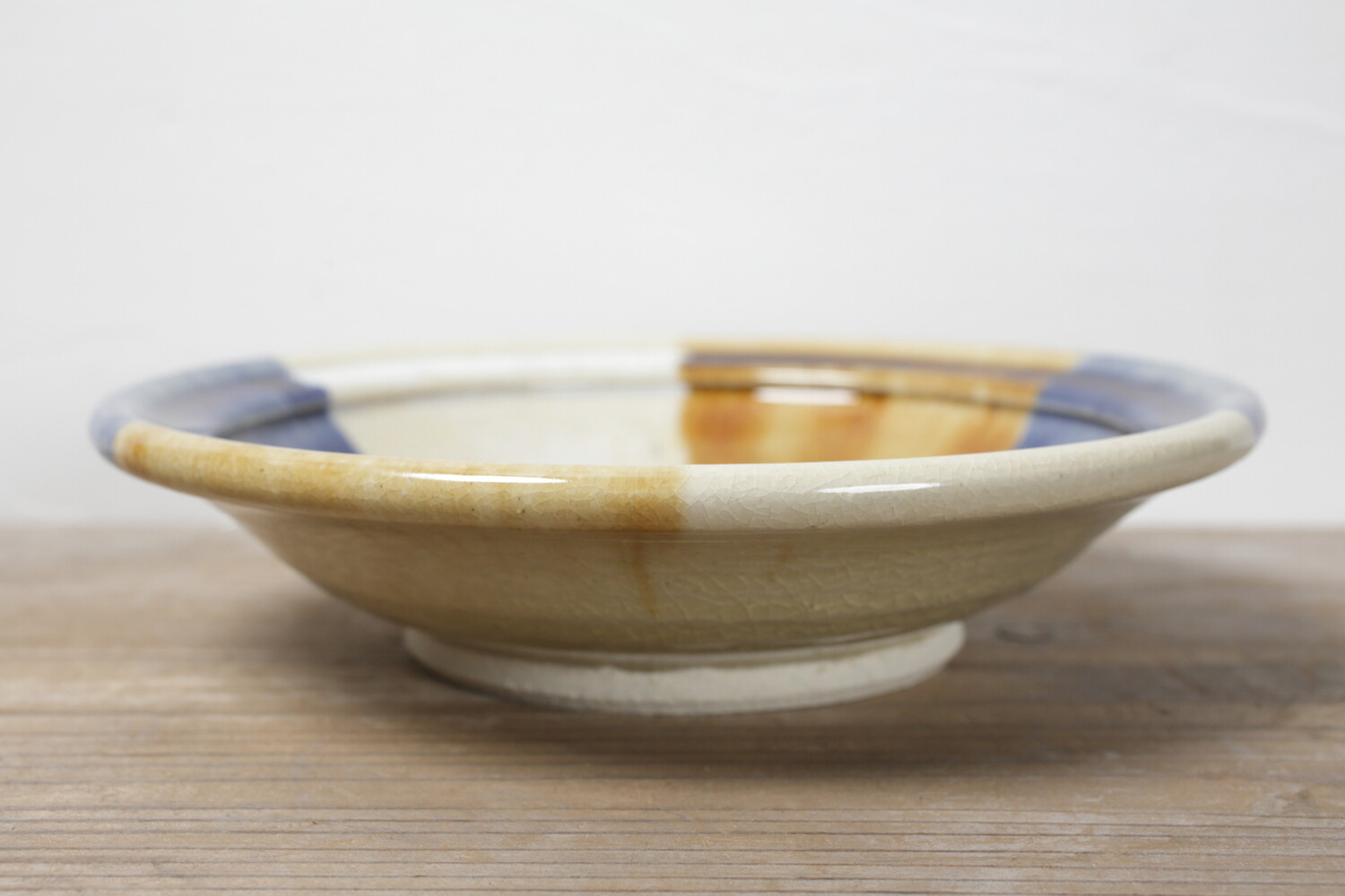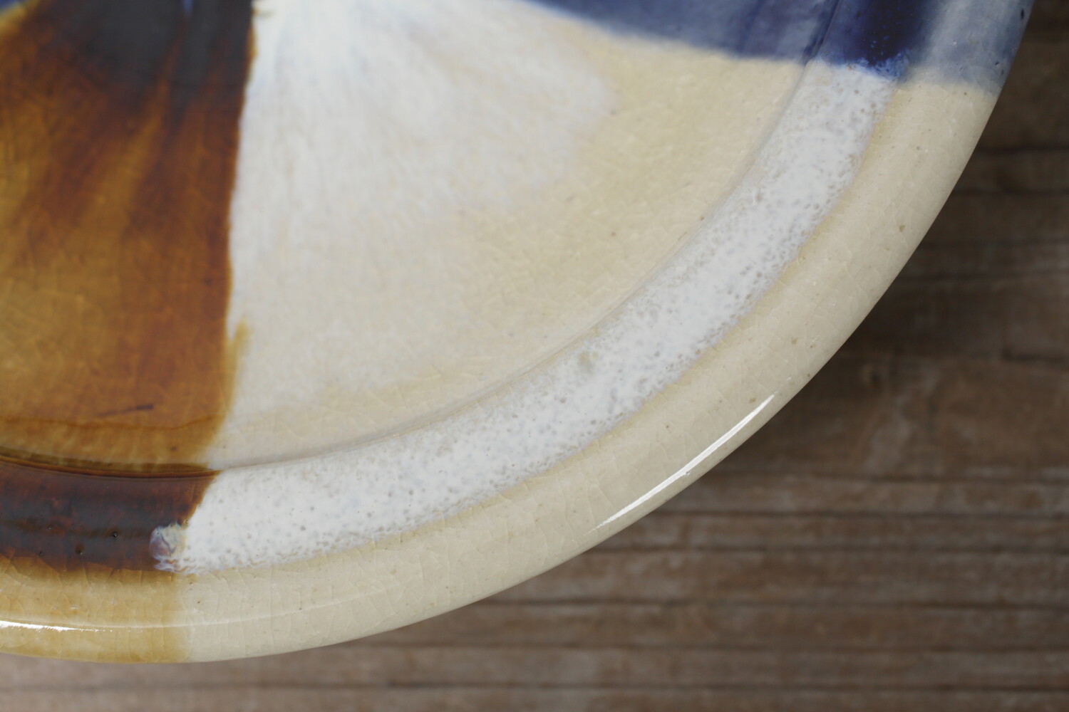 呉須釉、飴釉、白と色鮮やかな三彩が白い瀬戸の土に映える三彩流し皿。直径23.5cmほどの大きさに縁返しが施された三彩皿は、お一人分のパスタやチャーハン、ご家族のおかずやお刺身にもいいでしょう。