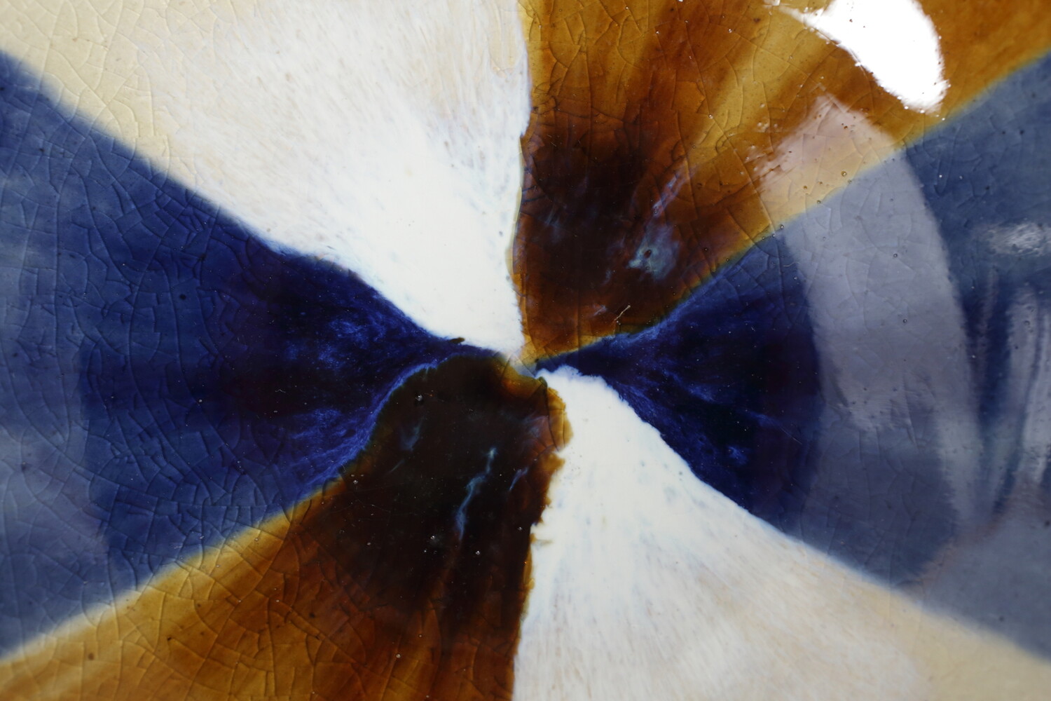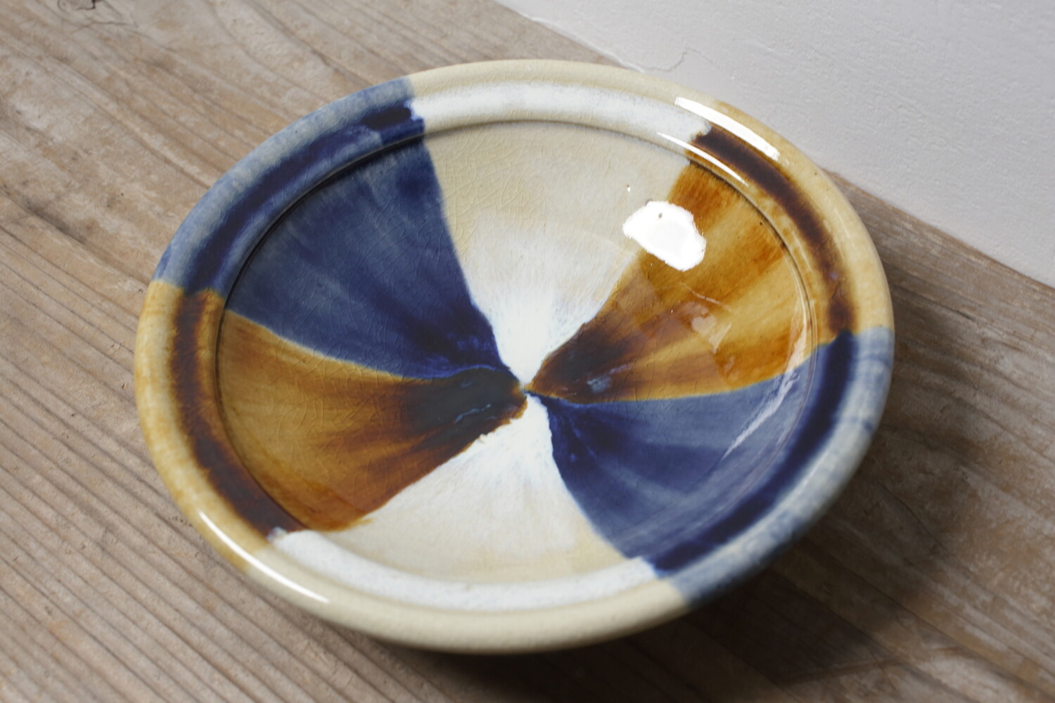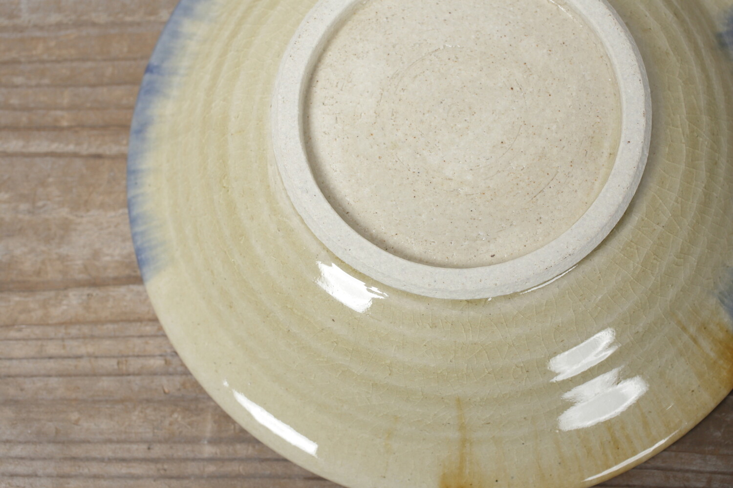 呉須釉、飴釉、白と色鮮やかな三彩が白い瀬戸の土に映える三彩流し皿。直径23.5cmほどの大きさに縁返しが施された三彩皿は、お一人分のパスタやチャーハン、ご家族のおかずやお刺身にもいいでしょう。
