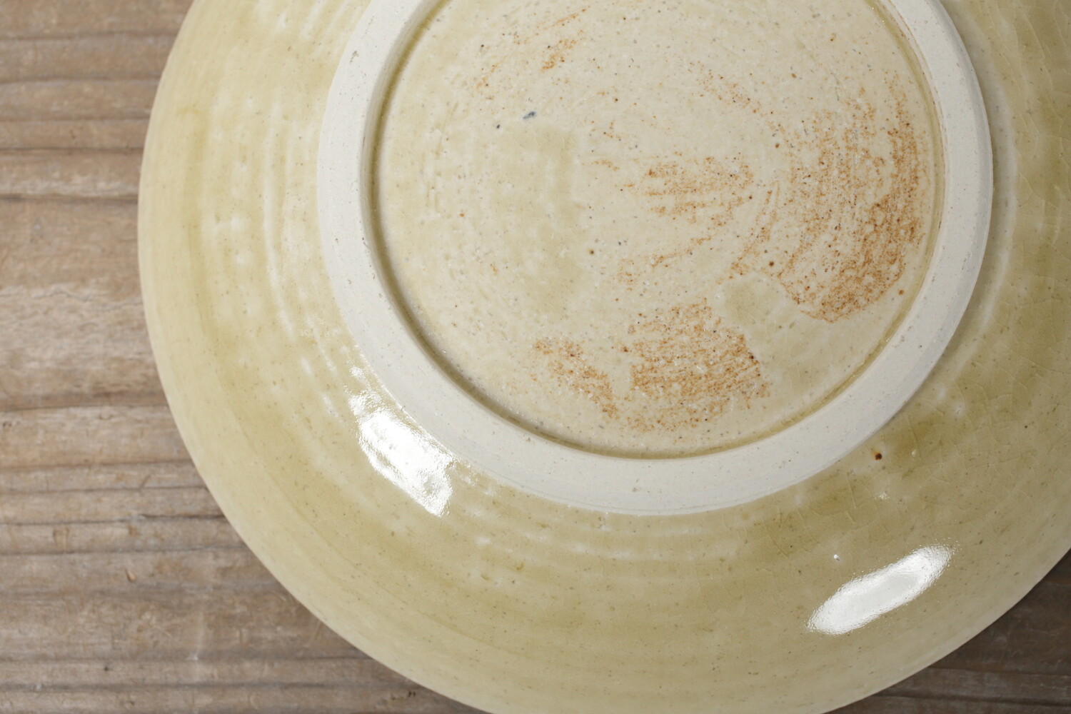 高麗茶碗の代表的な伊羅保(いらぼ)茶碗に使われる釉薬(ゆうやく)で、土灰釉の一種を指す伊羅保釉が掛けられた7.5寸皿。茶湯の世界で珍重されてきた少しざらっとする質感が生まれるこの釉薬は、瀬戸の白い陶土と組み合わせると食器としての程よい品格が生まれます。