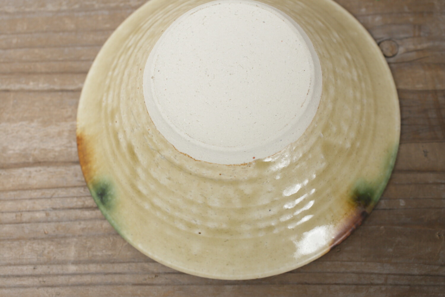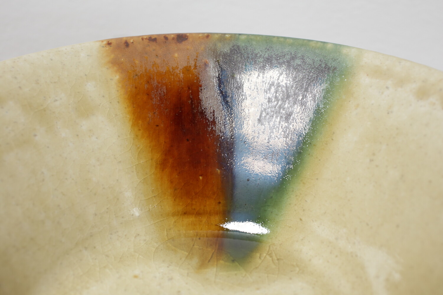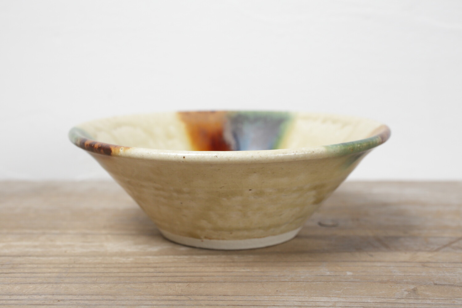 高麗茶碗の代表的な伊羅保(いらぼ)茶碗に使われる釉薬(ゆうやく)で、土灰釉の一種を指す伊羅保釉を掛けた後、三方に緑釉と飴釉が掛けられた直径18cmほどの6寸二彩反り鉢。ご家族の副菜や果物などにもいいでしょう。