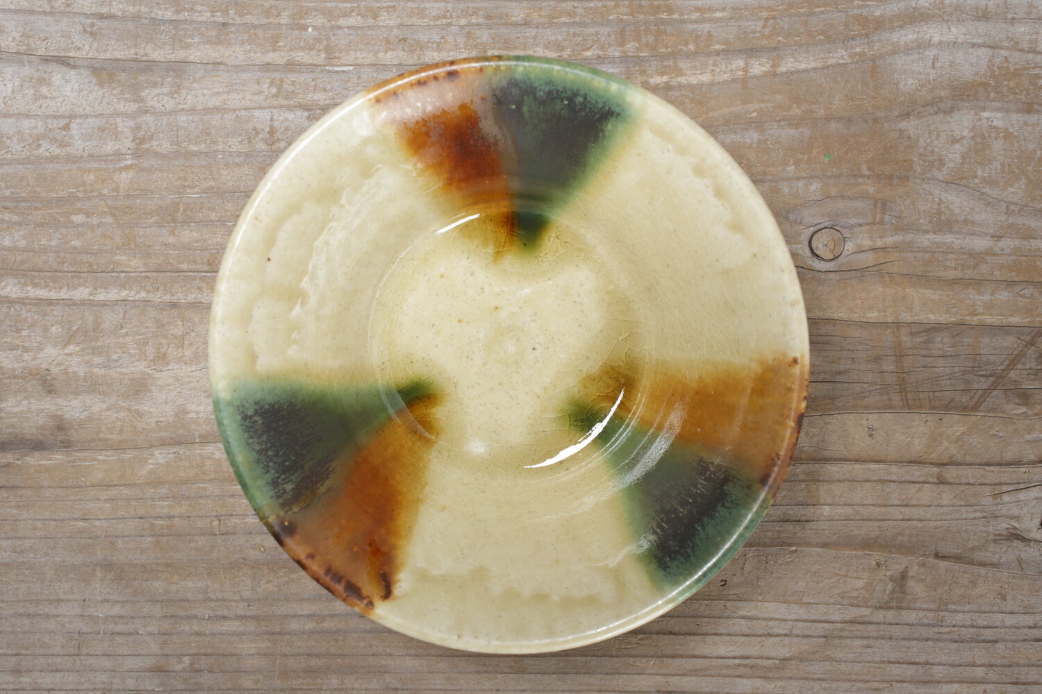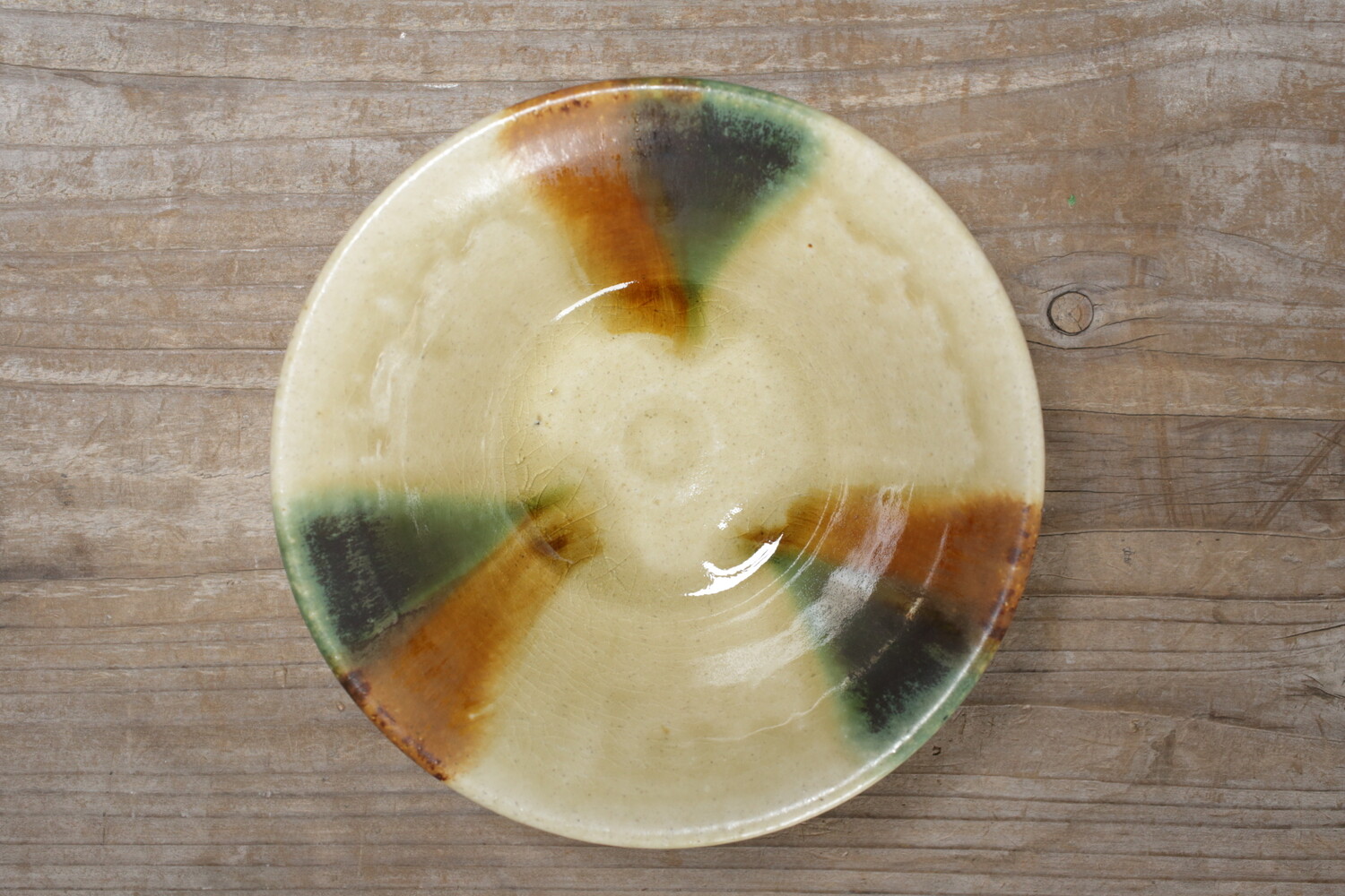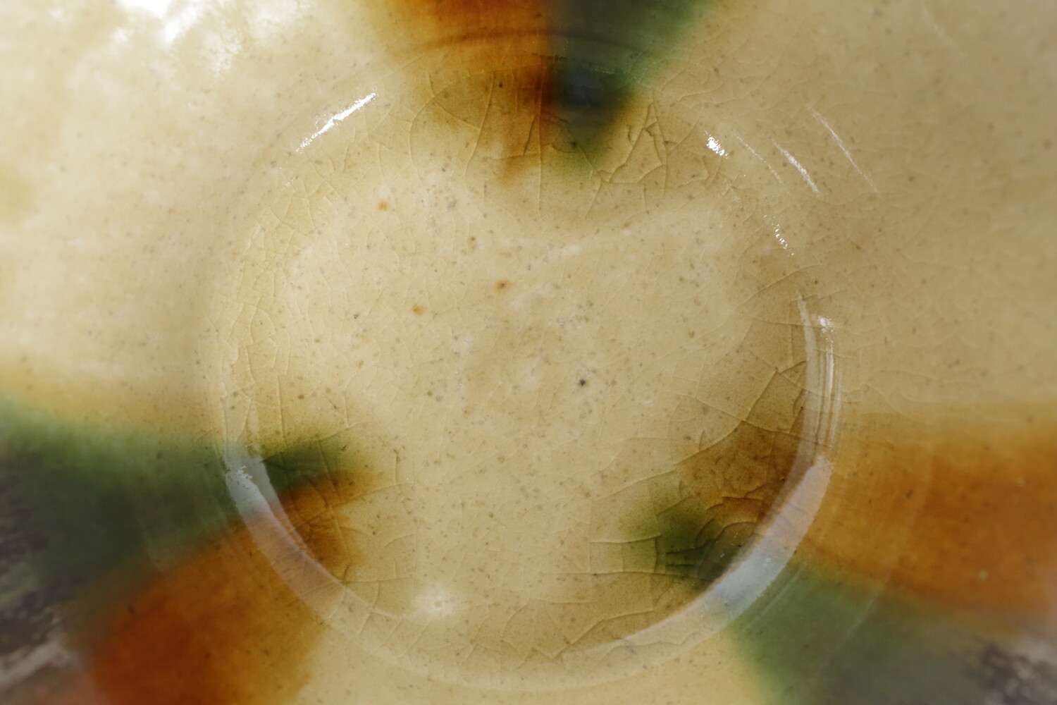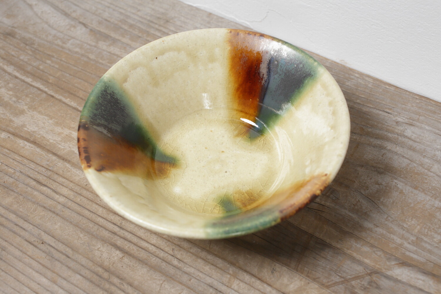 高麗茶碗の代表的な伊羅保(いらぼ)茶碗に使われる釉薬(ゆうやく)で、土灰釉の一種を指す伊羅保釉を掛けた後、三方に緑釉と飴釉が掛けられた直径18cmほどの6寸二彩反り鉢。ご家族の副菜や果物などにもいいでしょう。